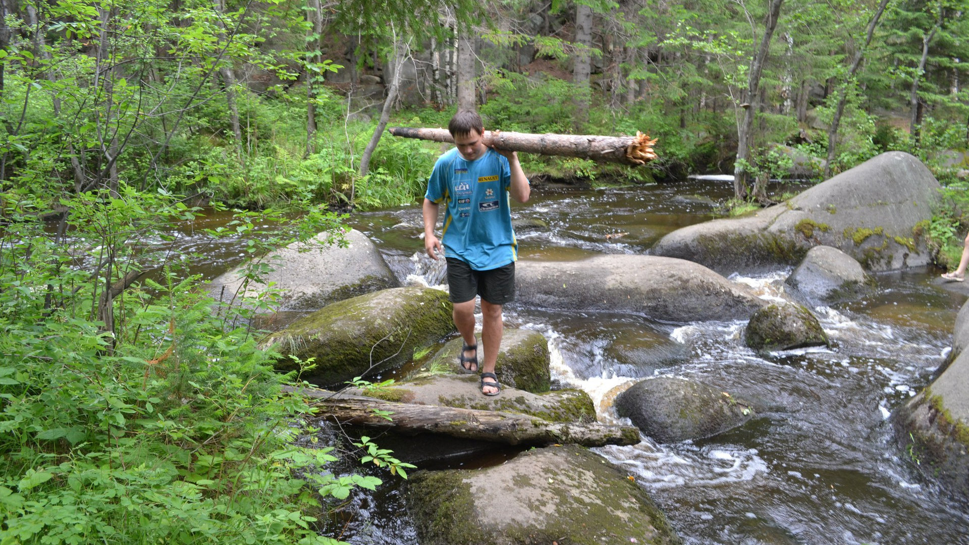 Шли мы 1,5 часа, а ноги уже начали гудеть. Ещё бы! На улице 20 градусов тепла по Цельсию! (градусник мы нашли, Никита нам его показал/О, спасибо добрый человек, что на минуту вернул нас в великую цивилизацию). Ноги наши гудели, потные ботинки терпели, мозоли терли. И тут представьте нашу радость, когда мы увидели впереди холодный ручей из прозрачной воды, пересекающий дорогу. Мы сразу же освободили ноги от потников и шагали по ручью босиком. Это просто блаженство. 3-е лучшее чувство в походе (опять, для тех, кто на бронепоезде: 1-е лучшее чувство-помыться (полностью. руки, ноги, пузико, причинные места и голова), 2-ое- вкусно покушать. Поболтали мы ножками в ручье, присели отдохнуть на обочине дороги. Вдруг заревел мотор, на дороге показалась машина. За рулём сидел невозмутимый мужчина преклонных лет, он объезжал нас аккуратно, пытаясь не обрызгать. Всю его брутальность испортила маленькая псинка, высунувшая свою мордочку из окна. Крохотный чёрный шпиц с глазами-бусинками сидел на коленках у мужчины, высовывал из пасти язык, пытаясь поймать ветер. А, вот ещё что. Никита, как обычно, отличился. Попытался перейти ручей по бревну в кроссовках, соскользнула одна нога, затем вторая, а позже он уже полоскал в ручье свои ботинки.