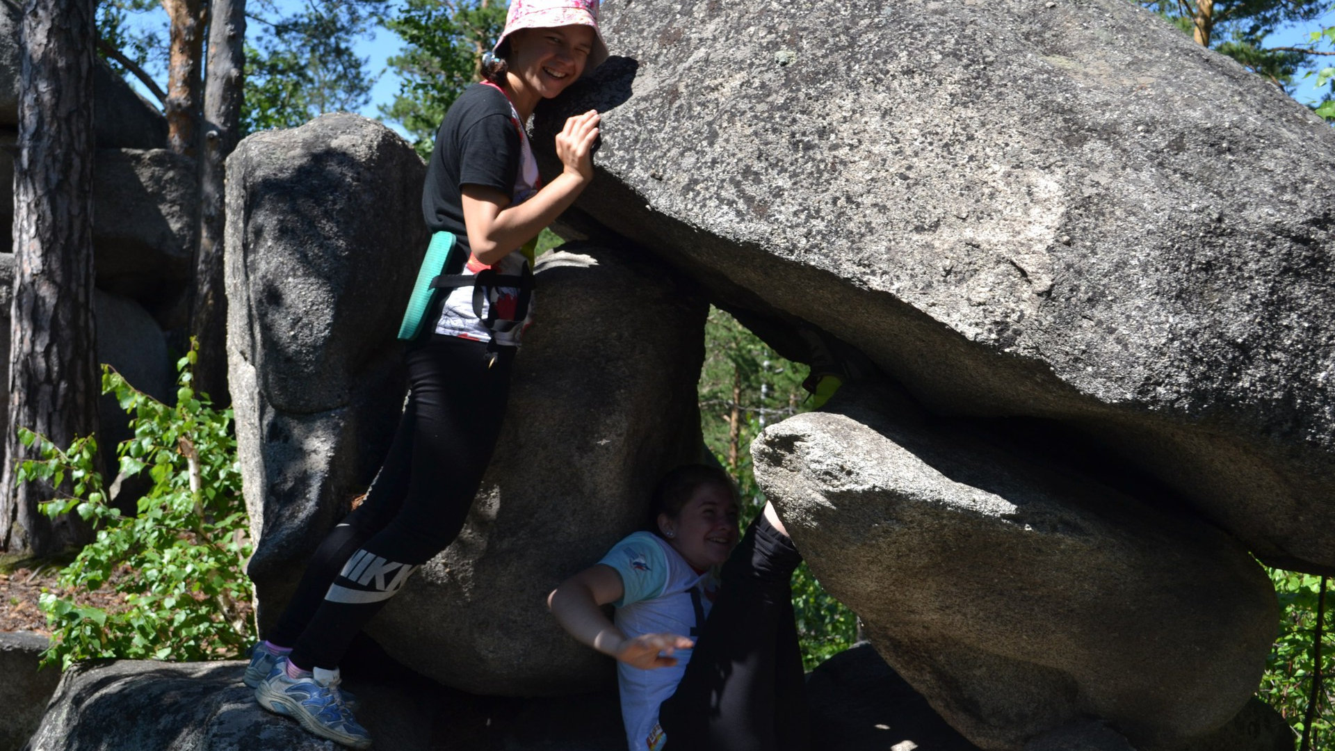 Следующей нашей остановкой было место, обозначенное на карте как «Большой каменный валун». Валун был до того огромный, что на него поместились все участники нашего похода. Но залезть на один валун это слишком просто. Побродив по лесу, мы нашли еще несколько валунов, которые разлеглись между деревьями и грелись на солнышке. Погода-таки всё еще хорошая! (Это вам не переменная облачность, на сегодняшний день в прогнозе было слово СОЛНЦЕ!)