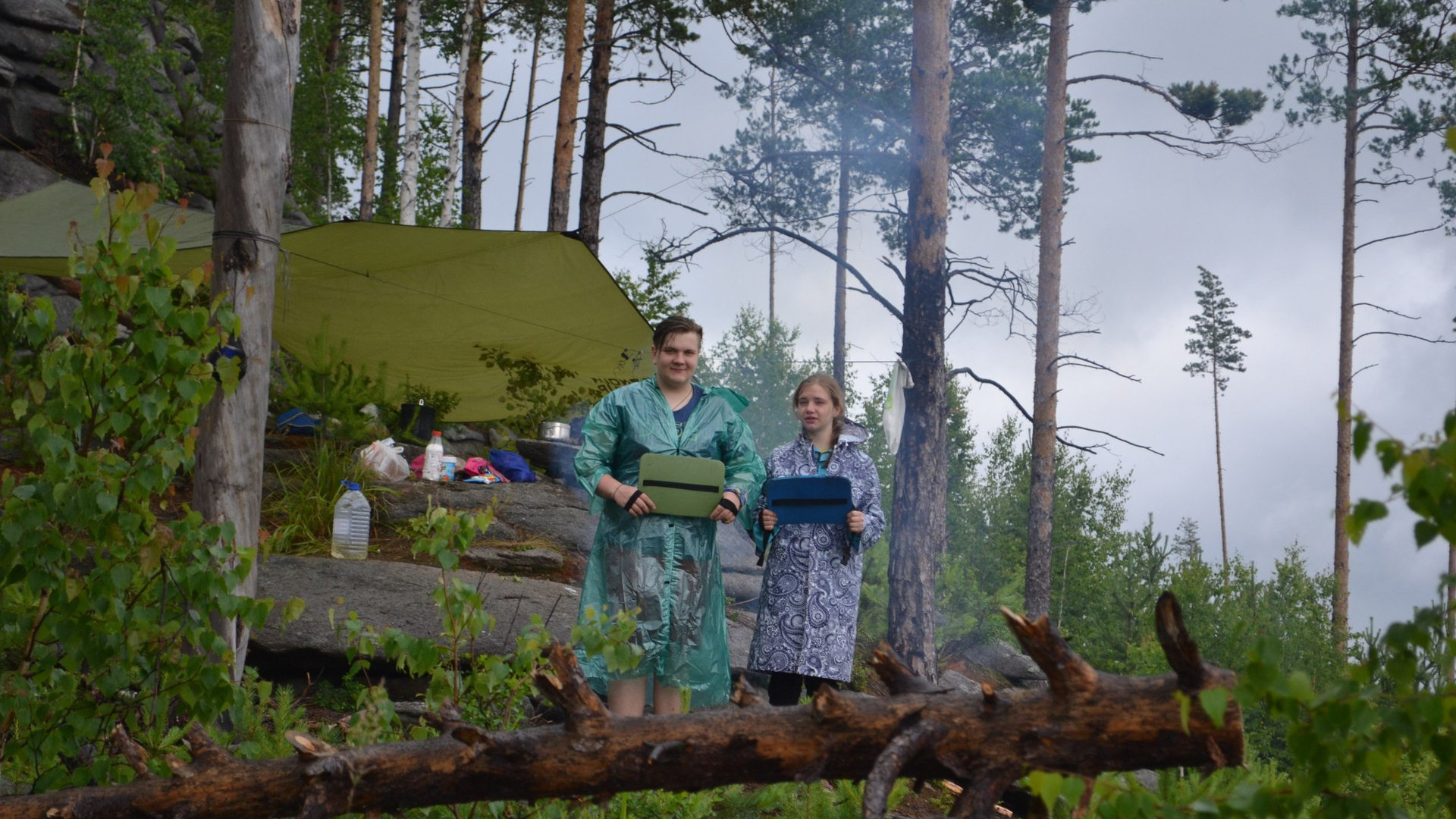 Утро добрым не бывает. . Акульи зубы решили порадовать нас оооочень переменной облачностью и дождиком. Хотели встать в 9, проснулись в 10, и начали извращенно разводить костёр насквозь промокшими дровами. УРА! Попытка № 12193 оказывается удачной, и мы начинаем варить кашу. Погода не особо хочет радовать нас солнышком. Каша готова. Руководитель собрала нас на собрание, решили остаться на днёвку и не шляться по мокрому лесу.