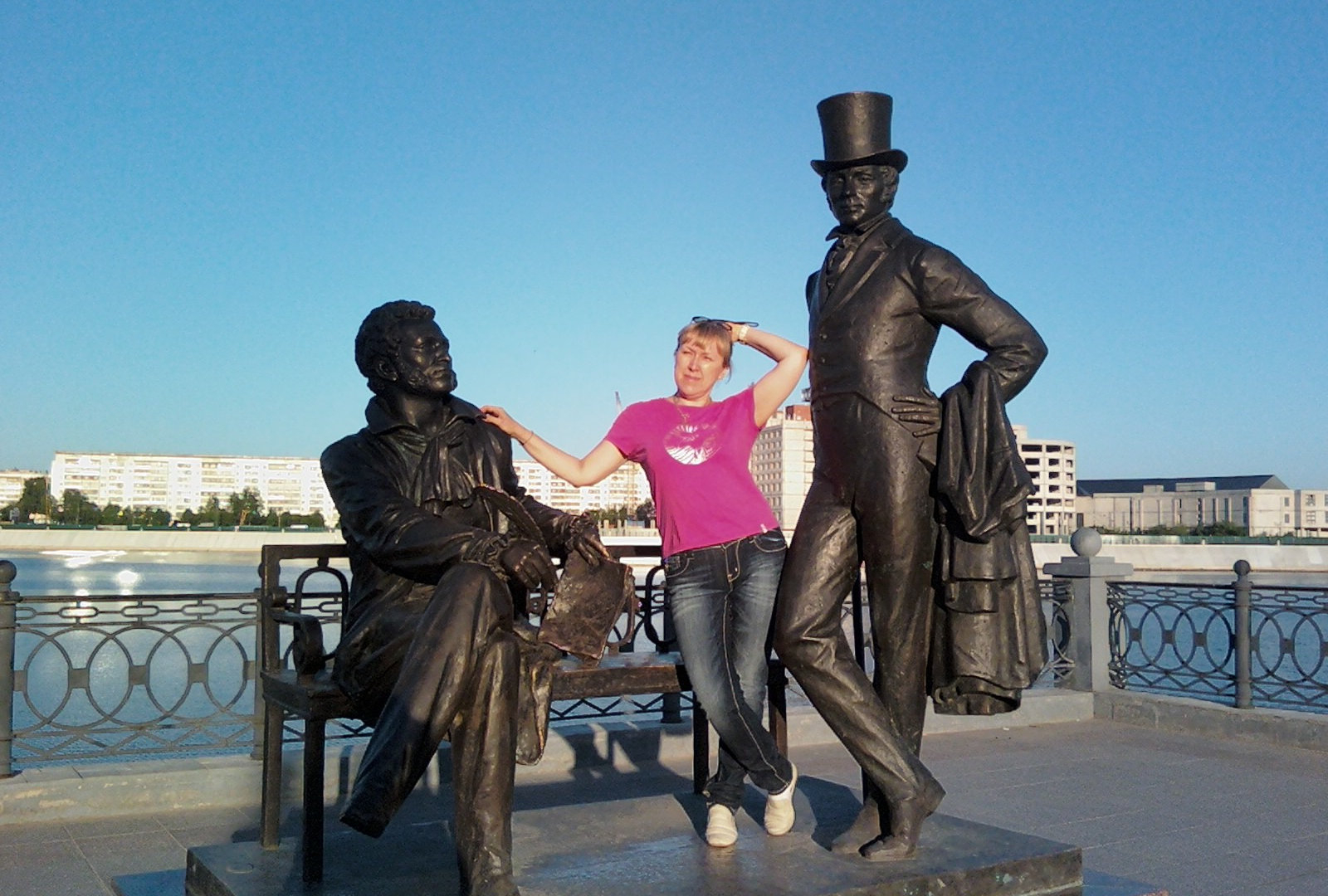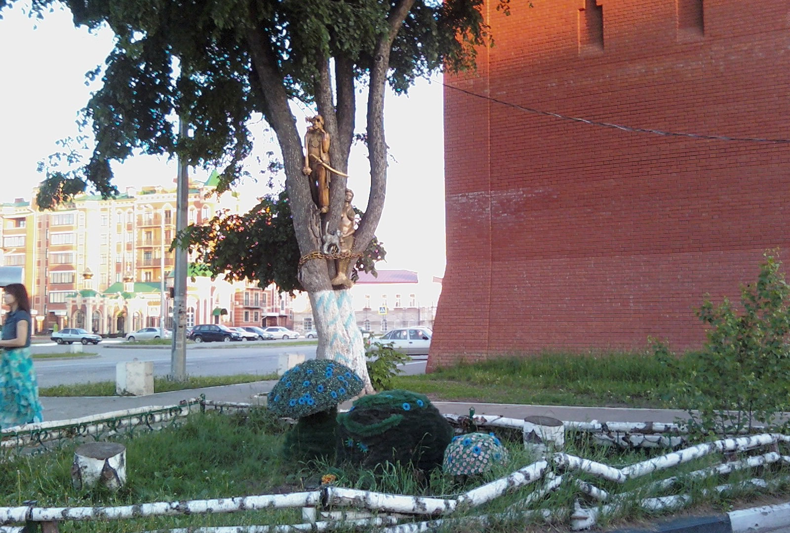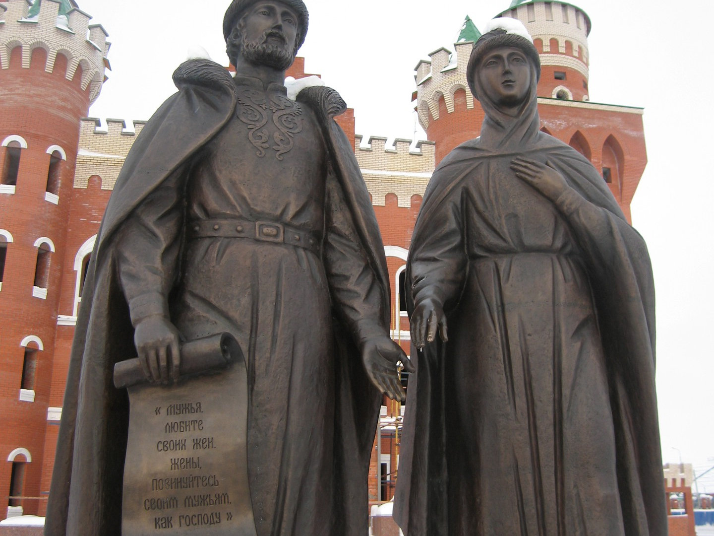 Этими относительно новыми строениями фантазия и желание украсить свой город не ограничилось. В Йошкар-Оле огромное количество скульптур, которых полно тут же среди европейско-старорусской мешанины, так и по всем городу: тут и Пушкин с его героями, Патриарх и Архангел, Лоренцо Медичи и Грейс Келли с Ренье, Петр с Февронией. Чудеса, одним словом.Две последних скульптурных композиции, как я понимаю, символизируют моральные семейные устои горожан, чему там посвящено еще много инсталляций на тему верной любви и крепкой семьи, которые установлены и еще продолжают пополняют длинную пешеходную аллею от Кремля и новых архитектурных изысков до городского Парок отдыха, созданного в лучших традициях советских времен. Аллея проходит вдоль малоэтажных, уже ничем непримечательных жилых домов, но сама по себе очень симпатична и там эти экспозиции очень удачны.