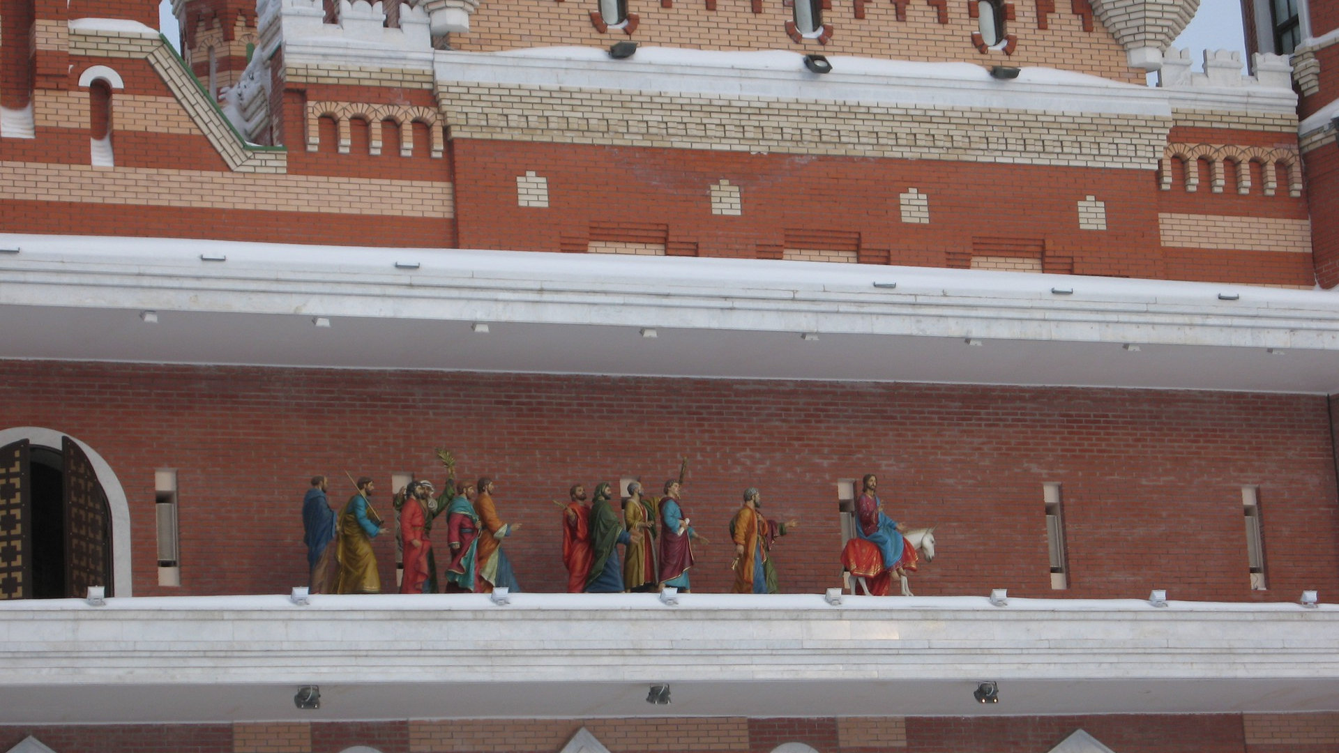 Да! Стационарные сооружения дополняются еще и экшеном. На двух площадях, Патриаршей и имени воеводы Оболенского-Ноготкова, есть движущиеся композиции, которые через определенные часы выходят наружу, собирая зрителей: это ослик с иконой и Иисус с 12-ю апостолами.