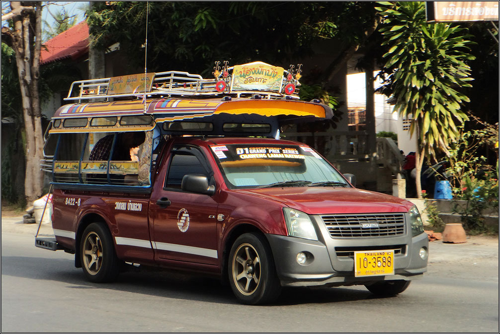 Это обычный крытый пикап со скамейками в кузове, стоимость поездки на нем колеблется от 20 бат за дорогу до ближайшего магазина, до 100-200 бат на дальние расстояния.