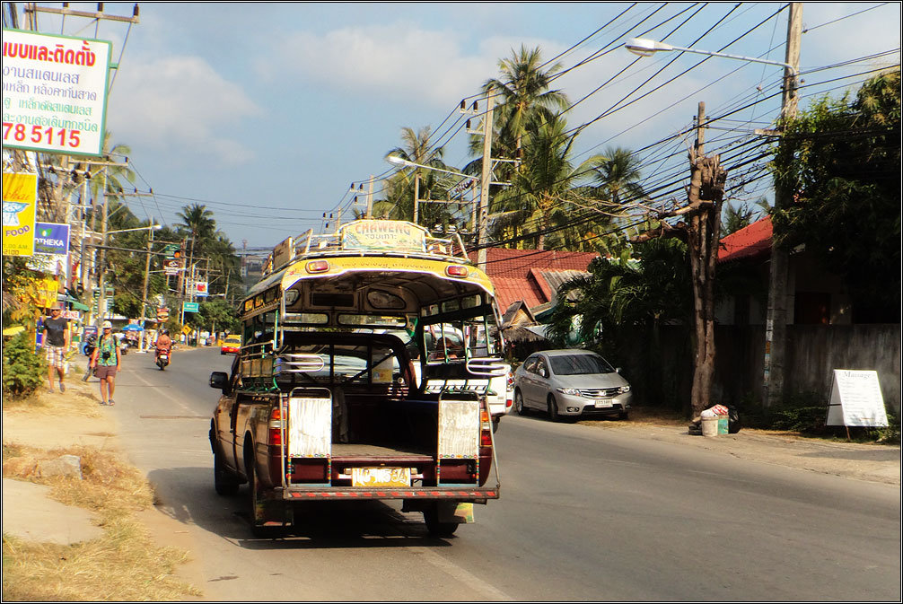 Самуи остров небольшой, длина кольцевой автодороги — всего 65 км, но пешком его, конечно, не обойдешь, хотя я и знаю одну героическую девушку, которая этот путь проделала как-то. Если вы не водите мотобайк или автомобиль, придется довольствоваться общественным транспортом.