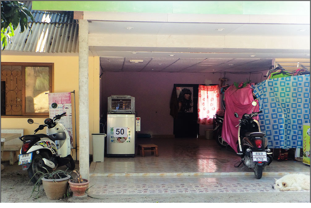 Видна только самая большая машинка, одна загрузка в которую стоит аж 50 бат. За ней стоит машинка поменьше, за 40, а потом самая маленькая, за 30. Загружаешь туда грязные шмотки, кидаешь монетки и уезжаешь. Через час все готово, можно забирать. В самую маленькую, кстати, влезает ни много ни мало, 9 кг белья, так что большая обычно простаивает.