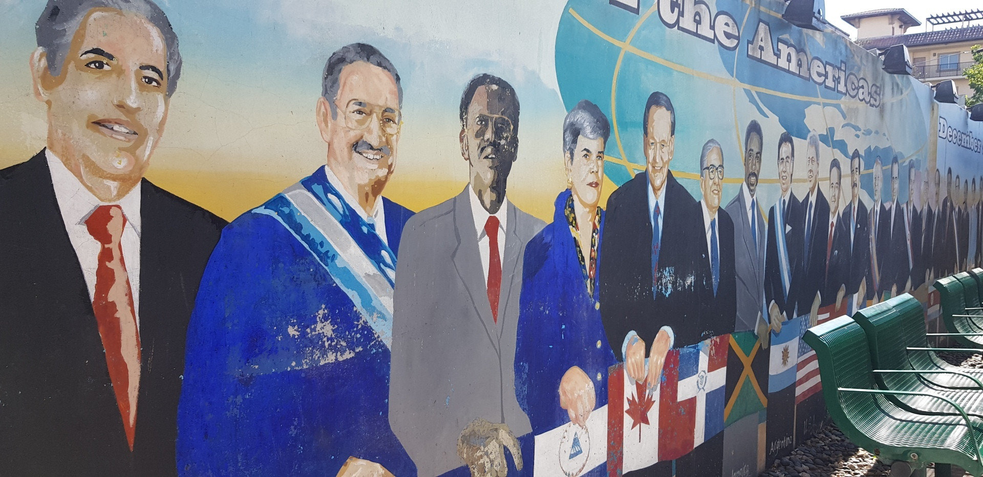 А это стена украшеная портретами латиноамериканских президентов собравшихся на какой то форум, решать судьбы Латинской Америки в США.