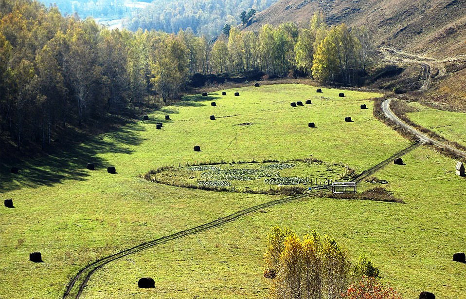 Слева от усадьбы будет дорога в сторону гор, там увидите указатель на «Парк лабиринтов». Про них я уже писала в заметке «Сакральные алтайские лабиринты», поэтому сейчас останавливаться подробно на их описании не буду (перейдите на заметку, если интересуетесь мистикой и прокачкой энергии). Напомню, что мистики загадывают здесь желания, территория эта считается Местом Силы.