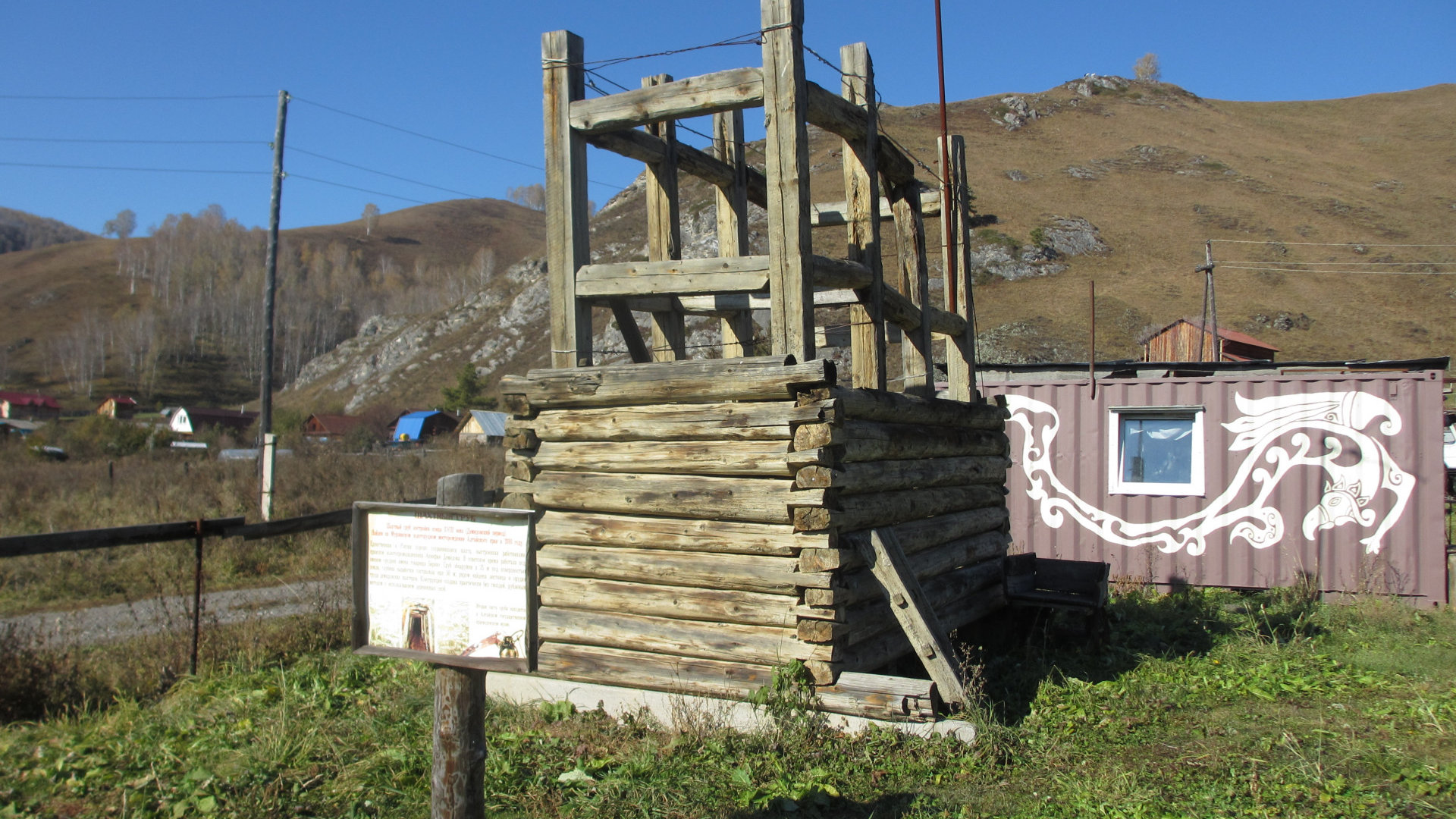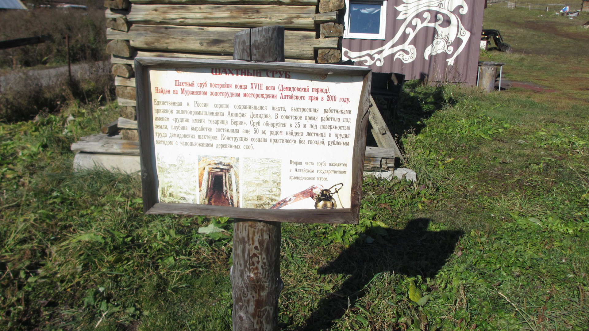 Недалеко от скифского кургана вы увидите второй объект – шахтный сруб, исторический памятник эпохи Демидова. Вторая его часть находится на хранении в Алтайском государственном краеведческом музее (Барнаул). Конструкция была найдена старателями Мурзинского золоторудного месторождения в 2010 г. Тогда эта находка наделала много шумихи, о ней трубили практически все региональные СМИ. Сегодня озвученные данные об этом памятнике вызывают у некоторых экспертов сомнения. Сруб, безусловно, имеет свою ценность, но немного другую. Если внимательно приглядеться к бревнам, можно заметить клеймо в виде звезды. Подобные знаки ставили в гораздо более поздние периоды, например, в советское время. Скорее всего, строение служило когда-то на руднике им. Берия в годы ВОВ.