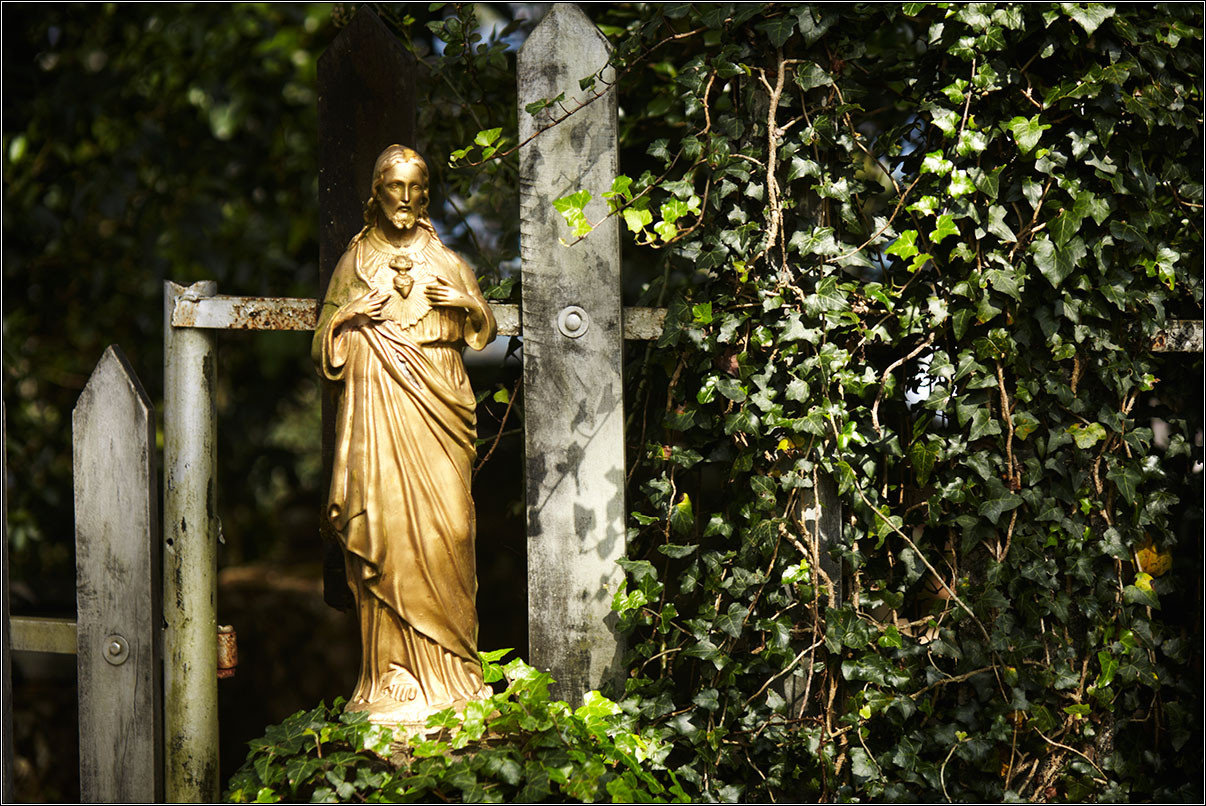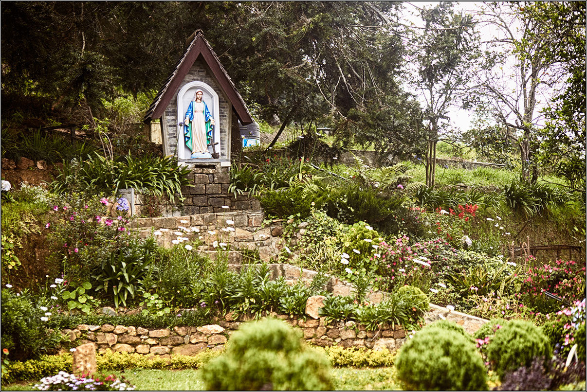 Ну, зато Иисус тут везде — и на холме, и на клумбе, и в кустах. Вдоль забора стоят красивые таблички с философскими изречениями, Дева Мария наблюдает за цветением роз, а главный вход венчает бронзовый крест.