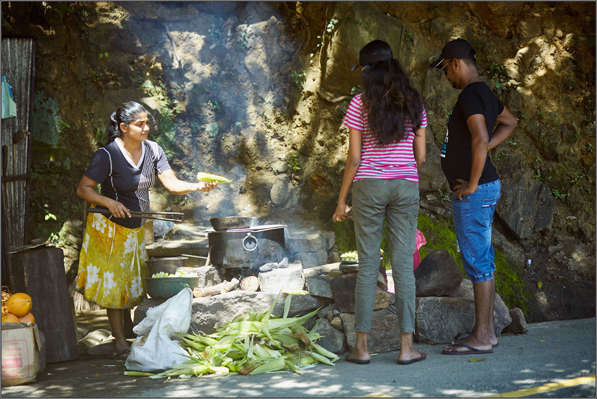 Тут же и чай наливают, вполне вкусный. Ланкийские тетушки носят мешки с собранными чайными листьями, грузят их в грузовики, ползают по грядкам, обрезая лозу, ну или что там надо обрезать у чайных кустов. На гору на машине не пускают, надо брать тук-тук за 1300 рупий, плюс заплатить за проезд на сам вьюпойнт — 250 рупий с тук-тука. Водитель, правда, честно отрабатывает: мало того, что ехать до самого верха километров 15 по крутым серпантинам, так он еще и тормозит около всяких интересных мест, собирает и выдает чайные листики, чайные цветы, какие-то орехи и прочее. В общем, хорошее место, красивое, колоритное и интересное.