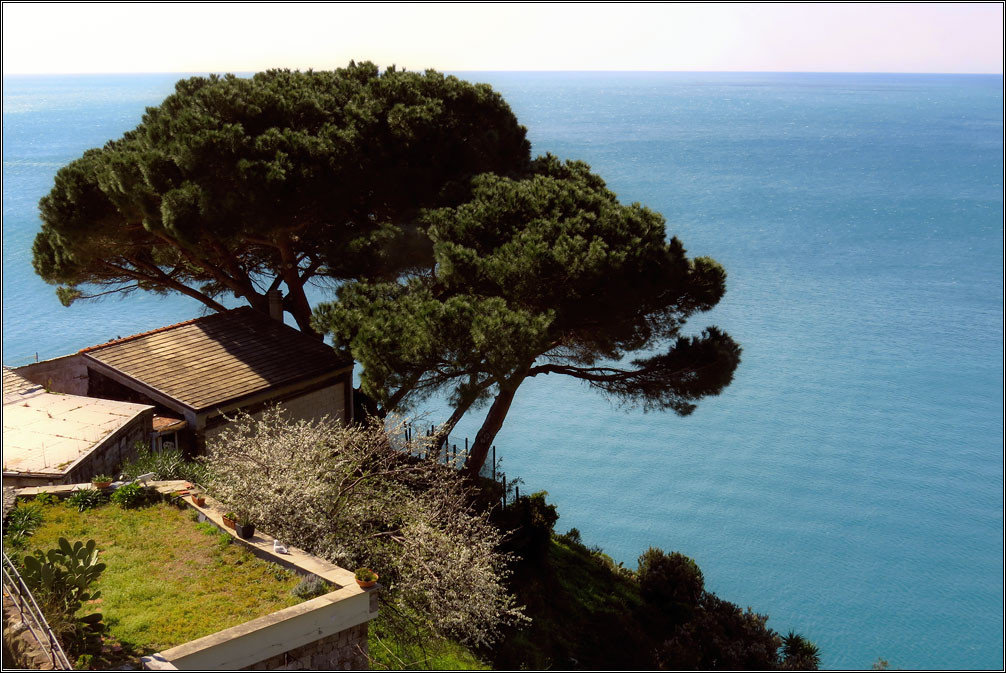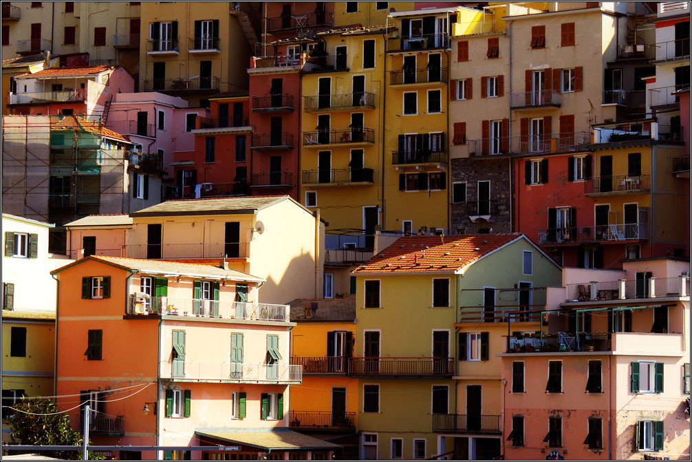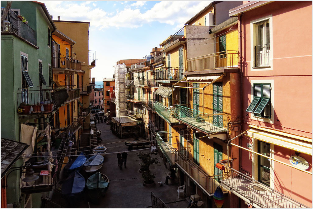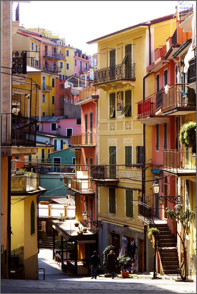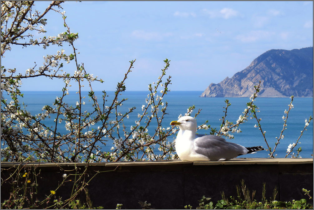 Мы едем в Риомаджиоре — это первый городок из Cinque Terre, Пяти Земель, расположенных неподалеку от Ла Специи на побережье. Место туристическое, выглядит точно так, как и представляются себе прибрежные средиземноморские городки: цветные домики, сбегающие по скалам к воде, маленькие улочки, альбатросы — прямо как собаки в Индии — клянчат кусочки еды у людей, сидящих в уютных кофейнях и на лавочках с видом на бухту, солнце освещает виноградники на склонах, ряды лимонных и апельсиновых деревьев, искрится в лазурной поверхности моря и бросает зайчики на борта покачивающихся лодок.