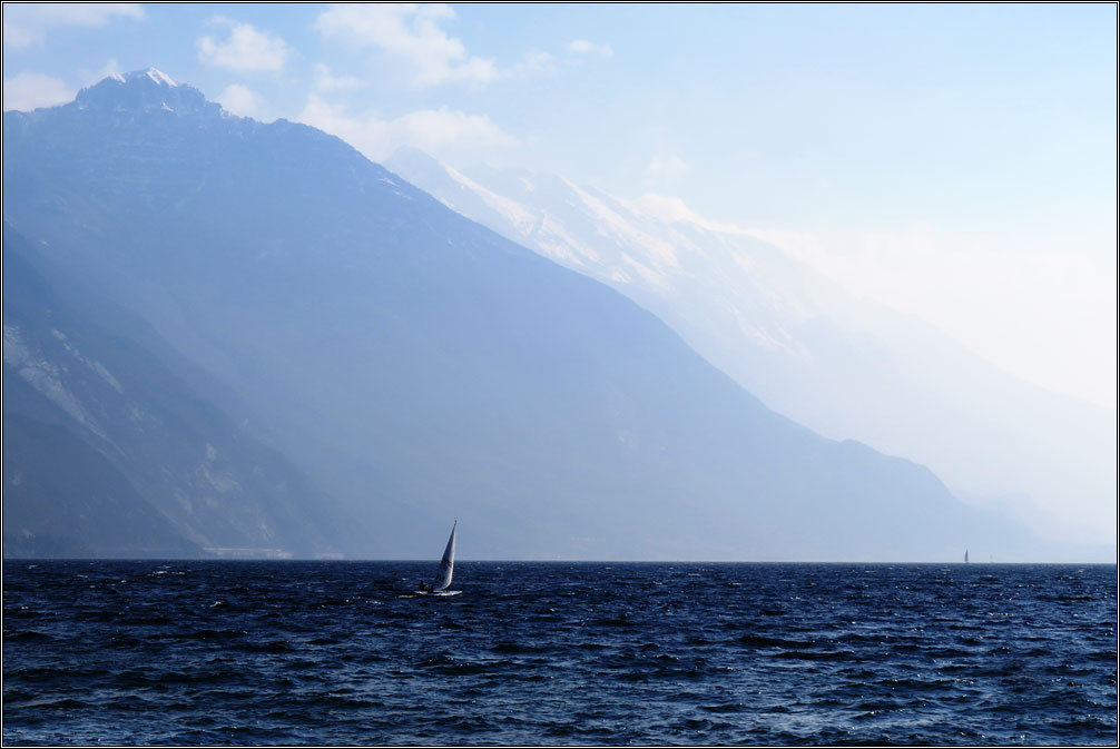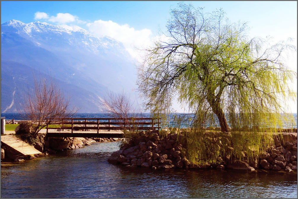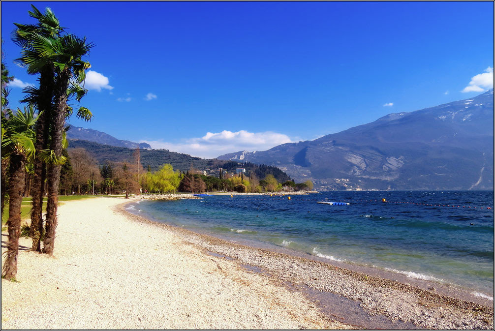 Рива дель Гарда — курортный городок на берегу крупнейшего в Италии озера Гарда. Небольшой, уютный, залитый солнцем и цветущий в это время года. Купаться тут, конечно, еще рановато, но полюбоваться снежными вершинами, посидеть на берегу, поплавать на маленьком паруснике и даже позагорать на зеленом газоне — вполне можно.