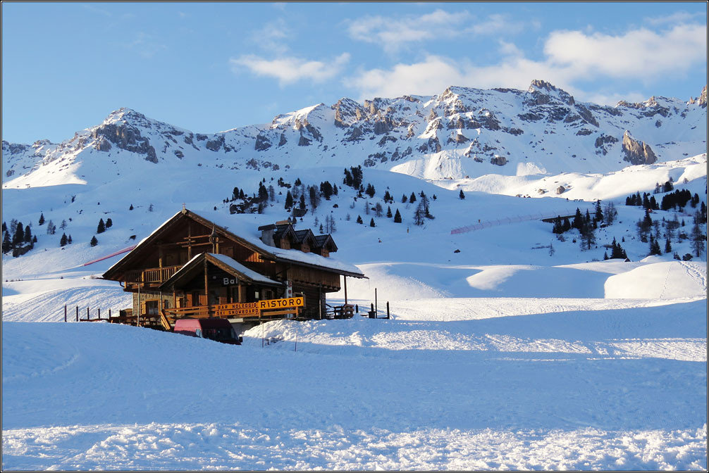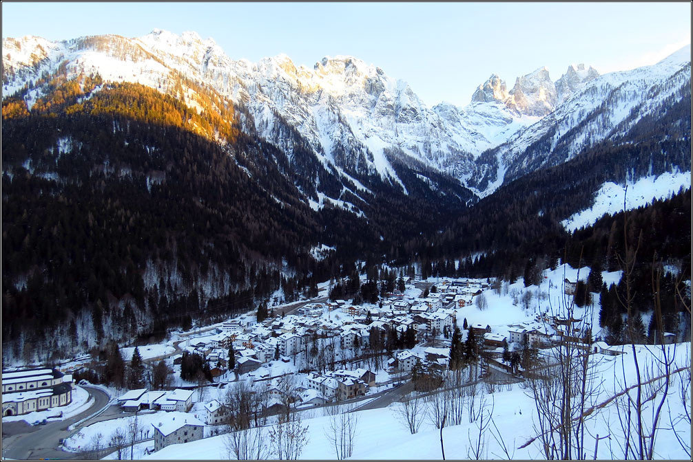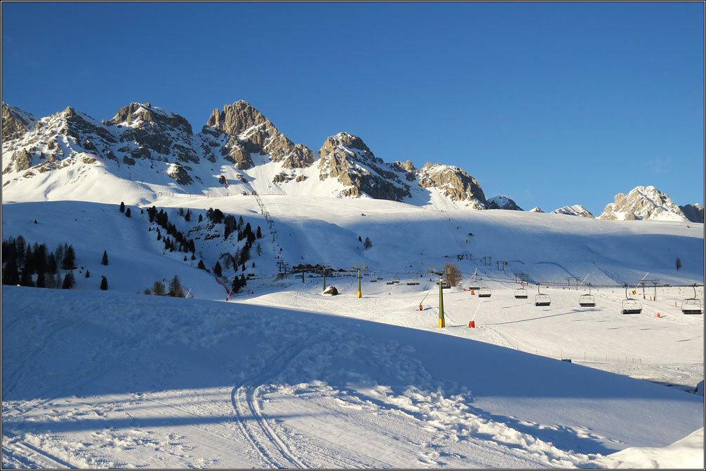 У подножия было +17 тепла, вокруг цвели цветы и качали широкими листьями пальмы. А здесь, на высоте 1800 метров, температура упала до -3 градусов, снег лежал плотным настом и по склонам скользили лыжники. Курорты еще работают вовсю — подъемники ходят, из труб вьется дым, открыты пиццерии и отели, по улицам маленьких городков ходят веселые люди в ярких спортивных куртках.