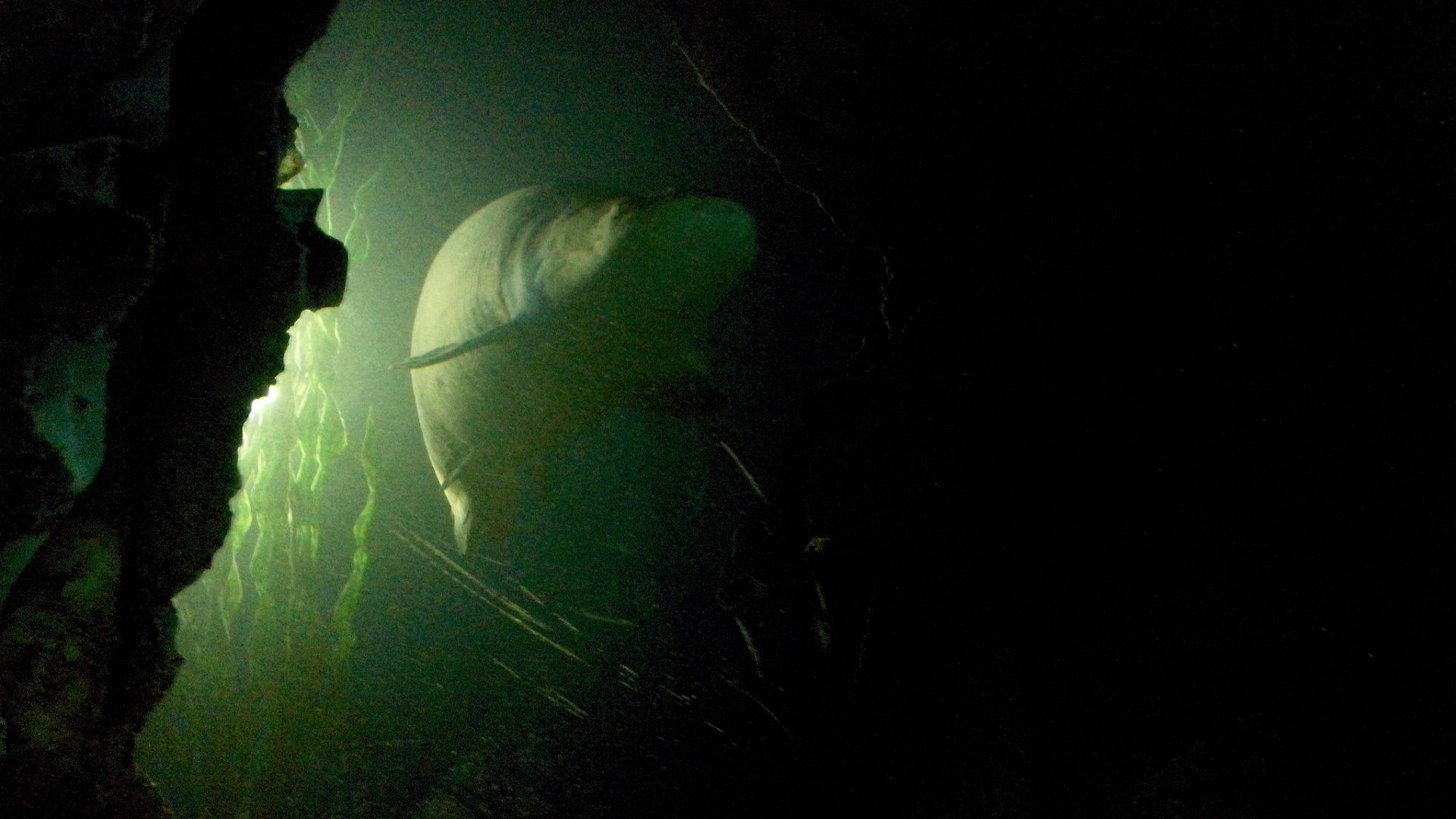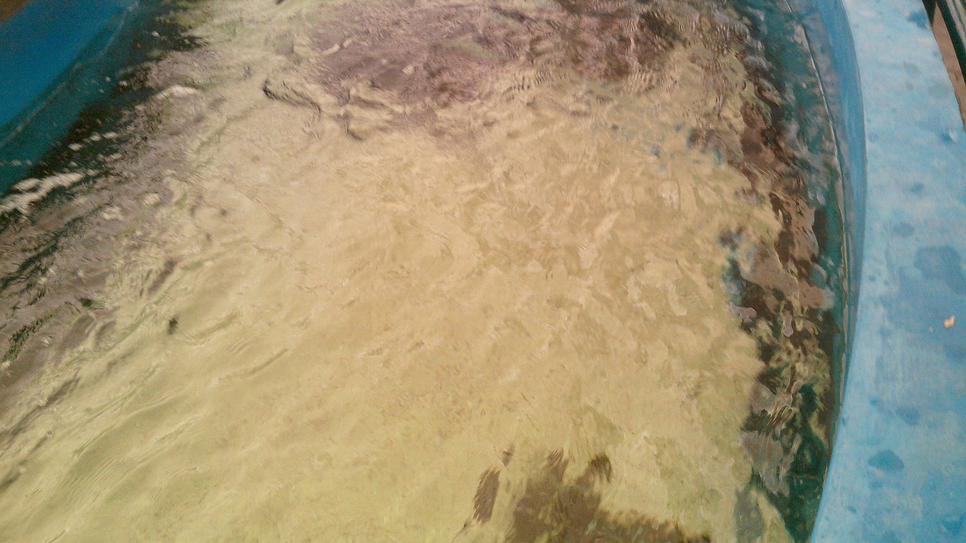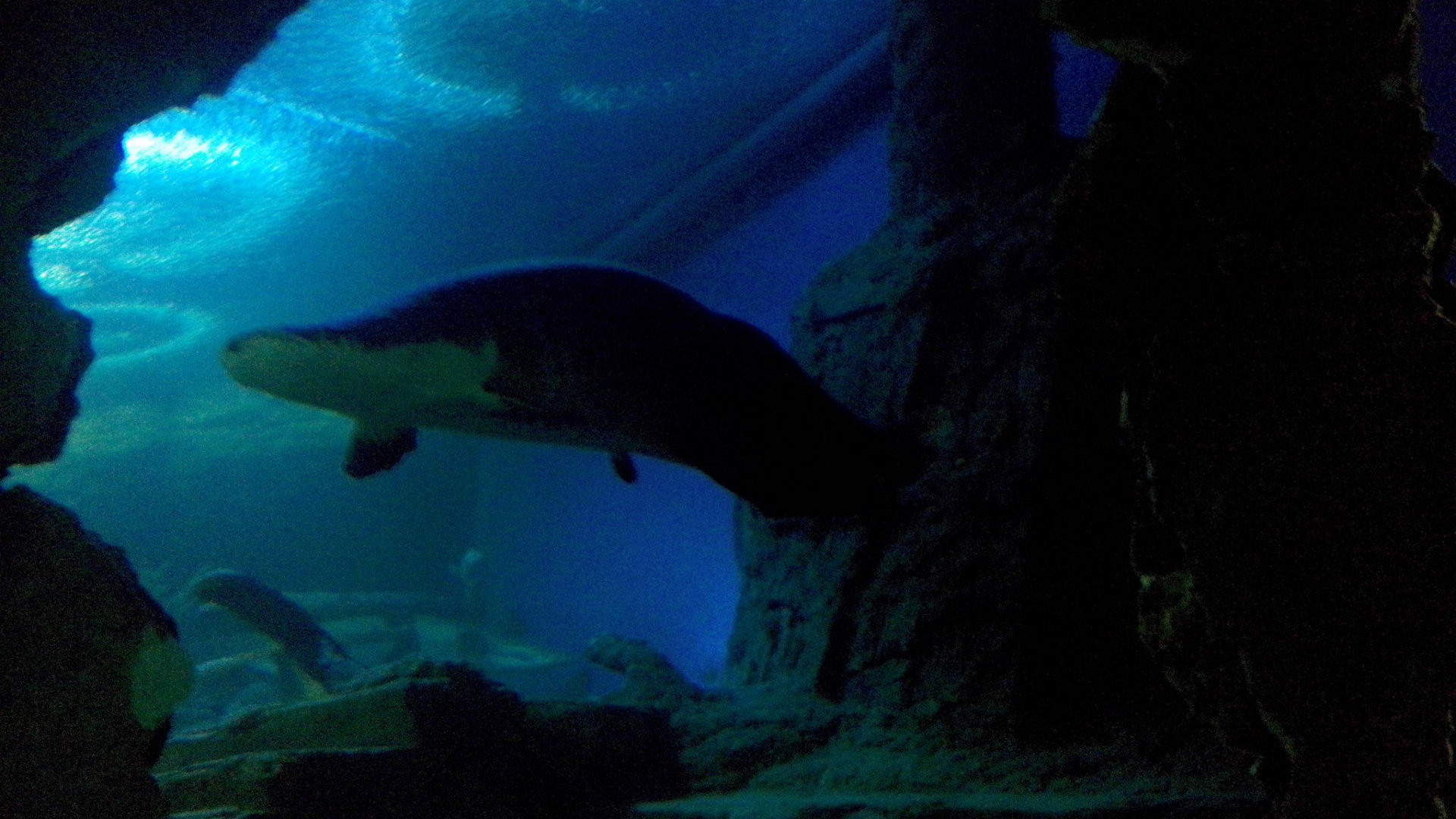 Первая часть находится на открытом воздухе. Там плавают карпы и скаты. Вот эти мутные пятна в воде, это скаты. :) Они на самом деле большие и иногда всплывают глянуть на туристов.