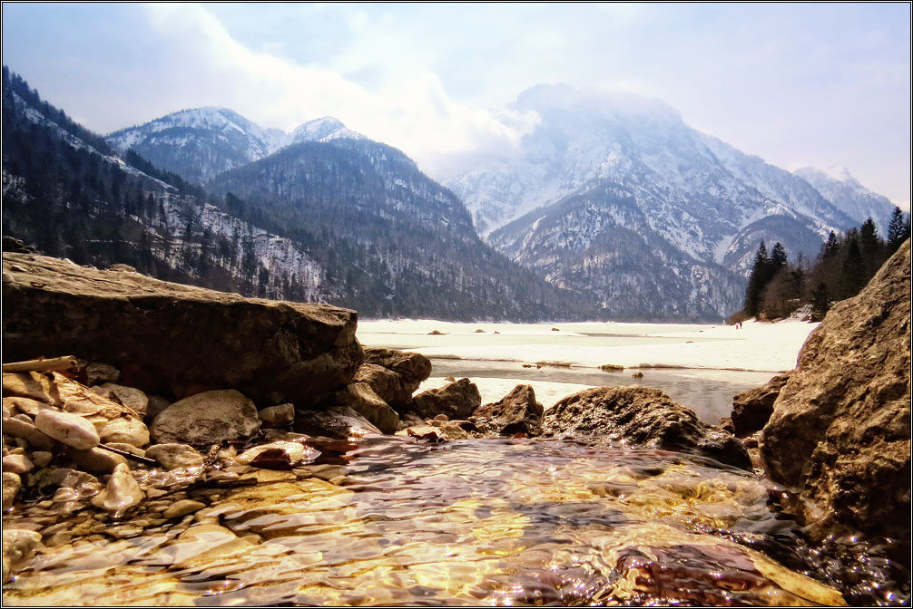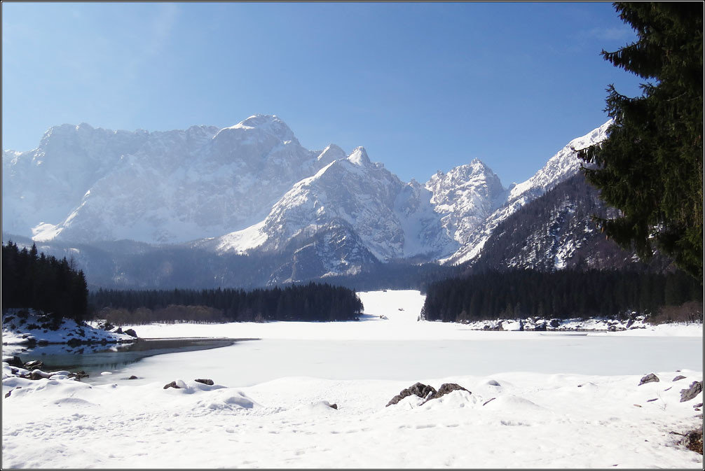 Lago di Fusine в Италии — это два небольших озера неподалеку от города Тарвизио, на границе со Словенией. Расположены они в горах, поэтому, невзирая на наступающую весну и температуру около +20 градусов на побережье, здесь все еще около нуля и вовсю лежит снег.
