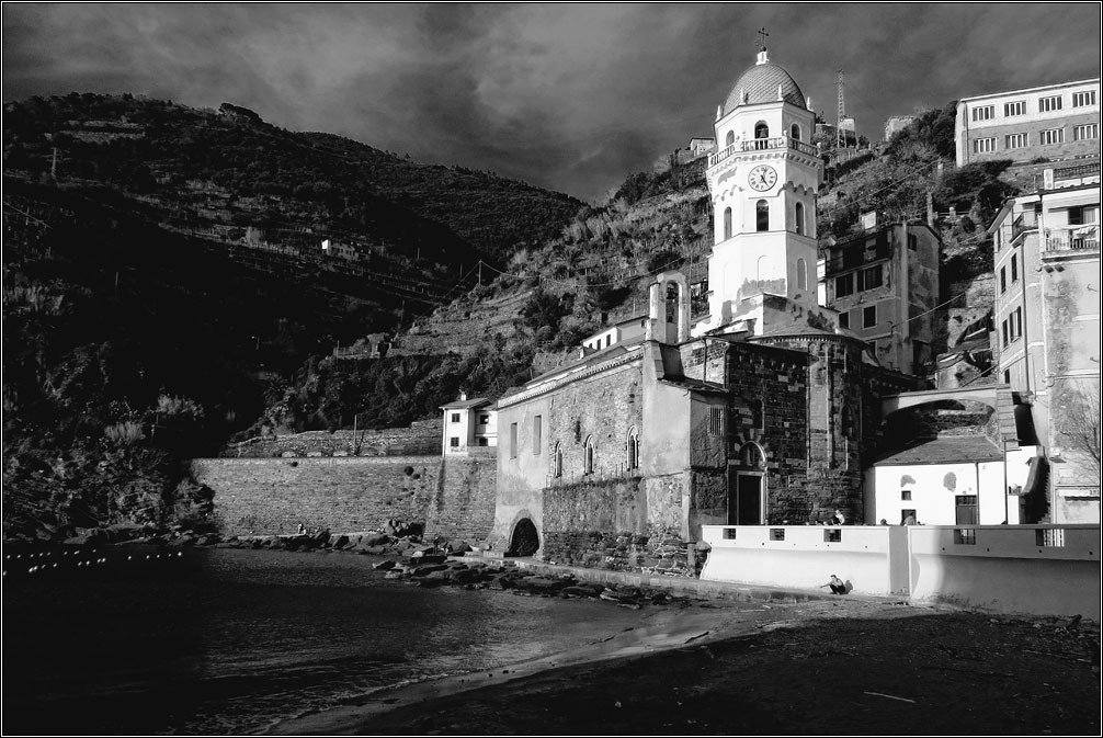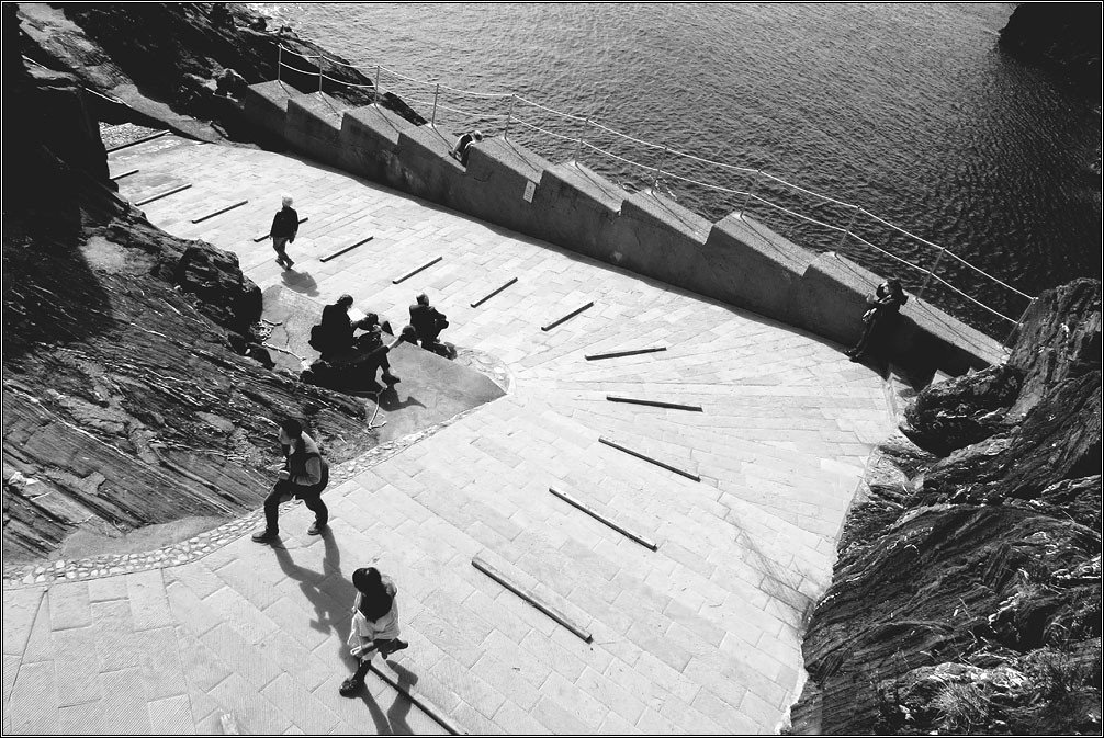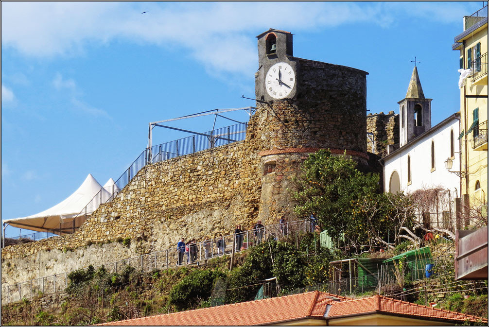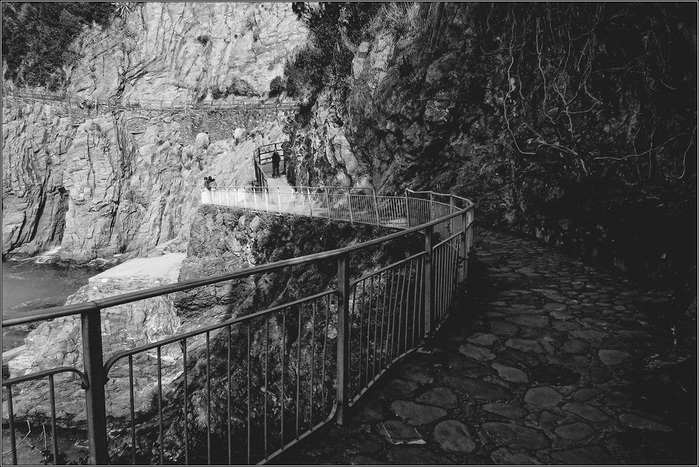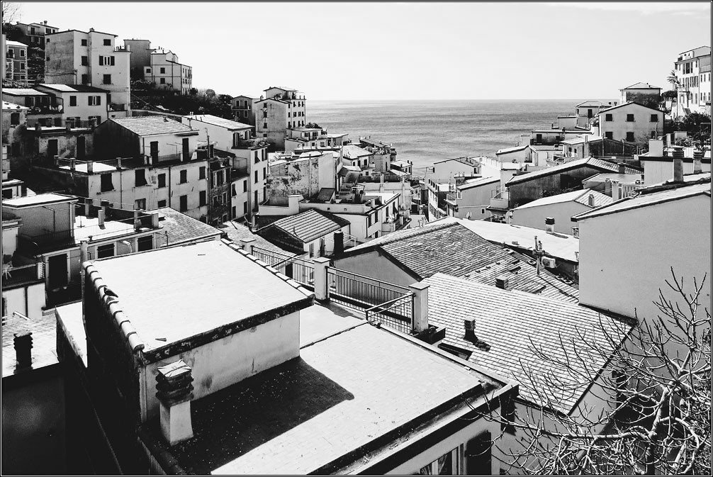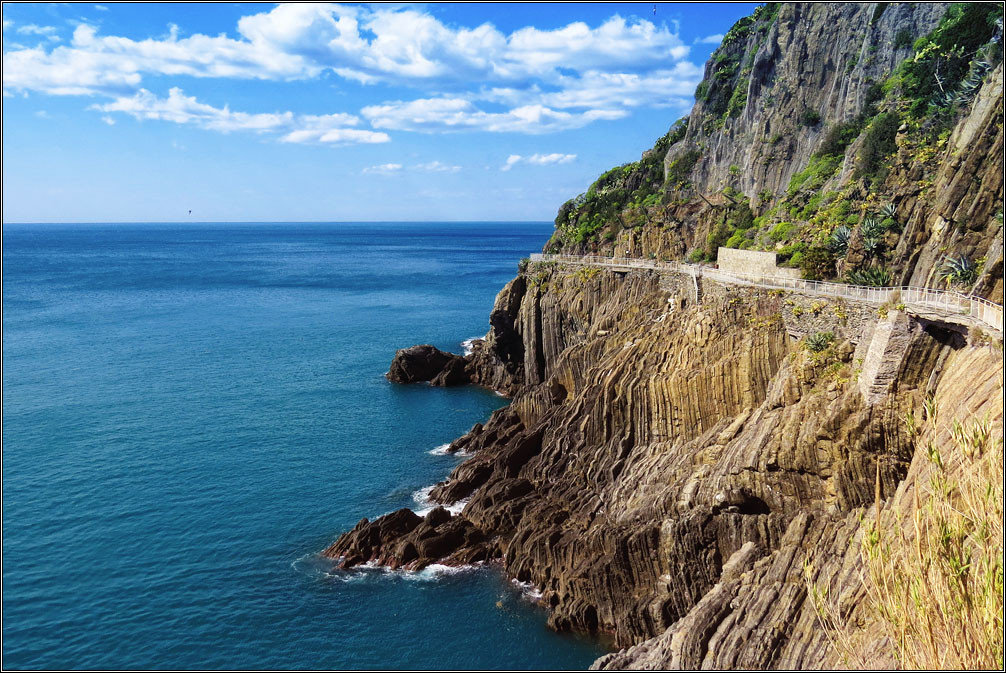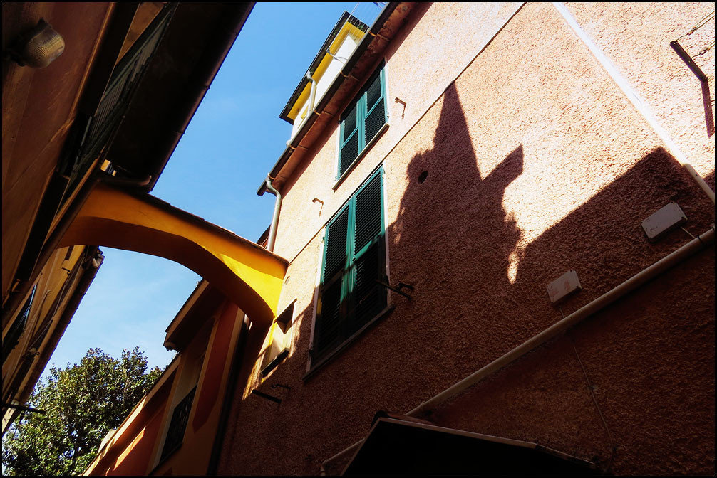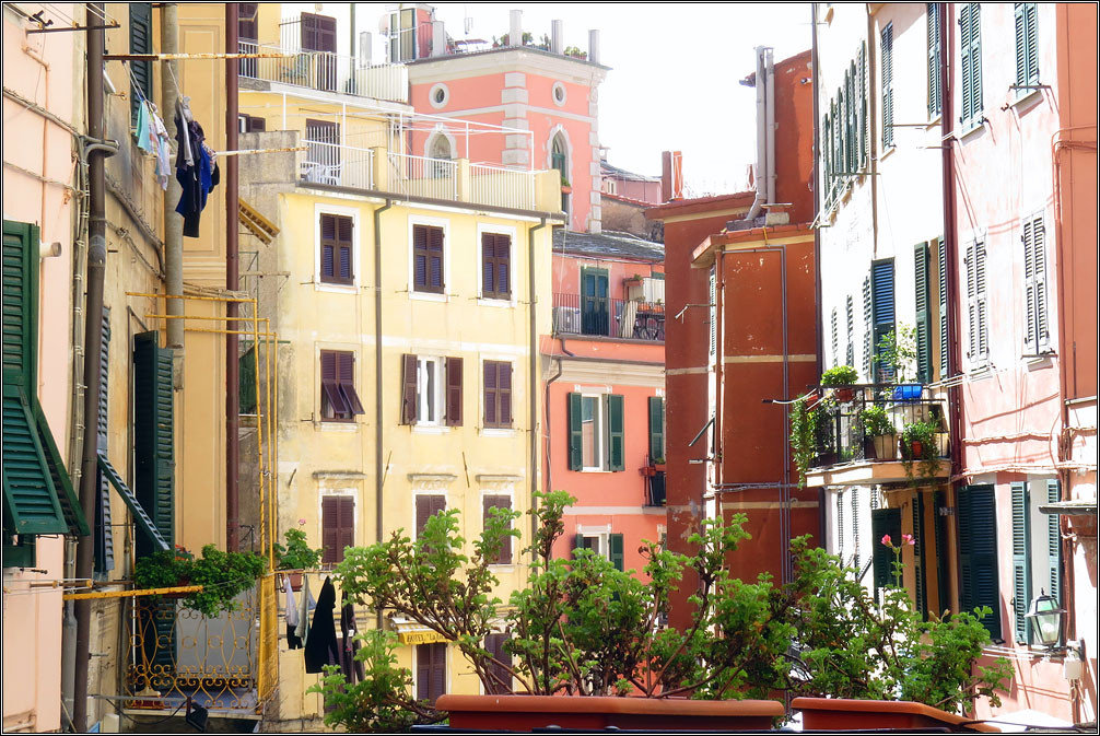 Это вот точно про Чинкветерре. Домики-домики-домики, розовые, желтые, зеленые, решетчатые ставни, веревки с разноцветным бельем, булыжники мостовой, глянцево блестящие на солнце вытертыми боками. Все немного игрушечное, маленькое и компактное, яркое пятнышко между синим небом и синим морем. Там, конечно, живут люди — ловят рыбу, растят виноград, готовят лазанью в крохотных кафе и продают сувениры в маленьких магазинчиках. Но все равно Чинкветерре больше всего похоже на декорации для туристов — специально выстроенные, красиво раскрашенные, и засаженные кактусами, лимонами и виноградом.