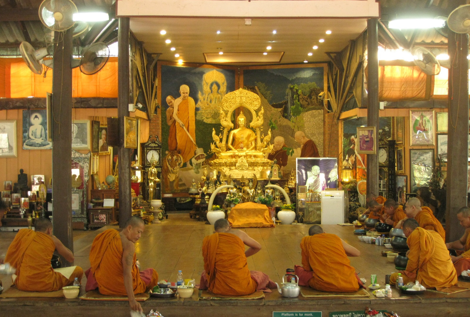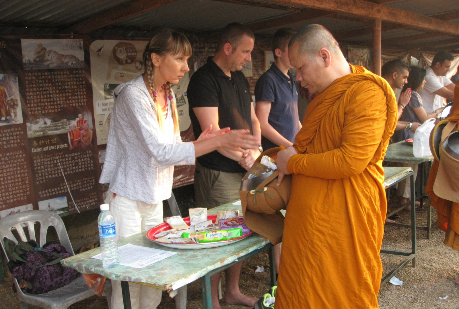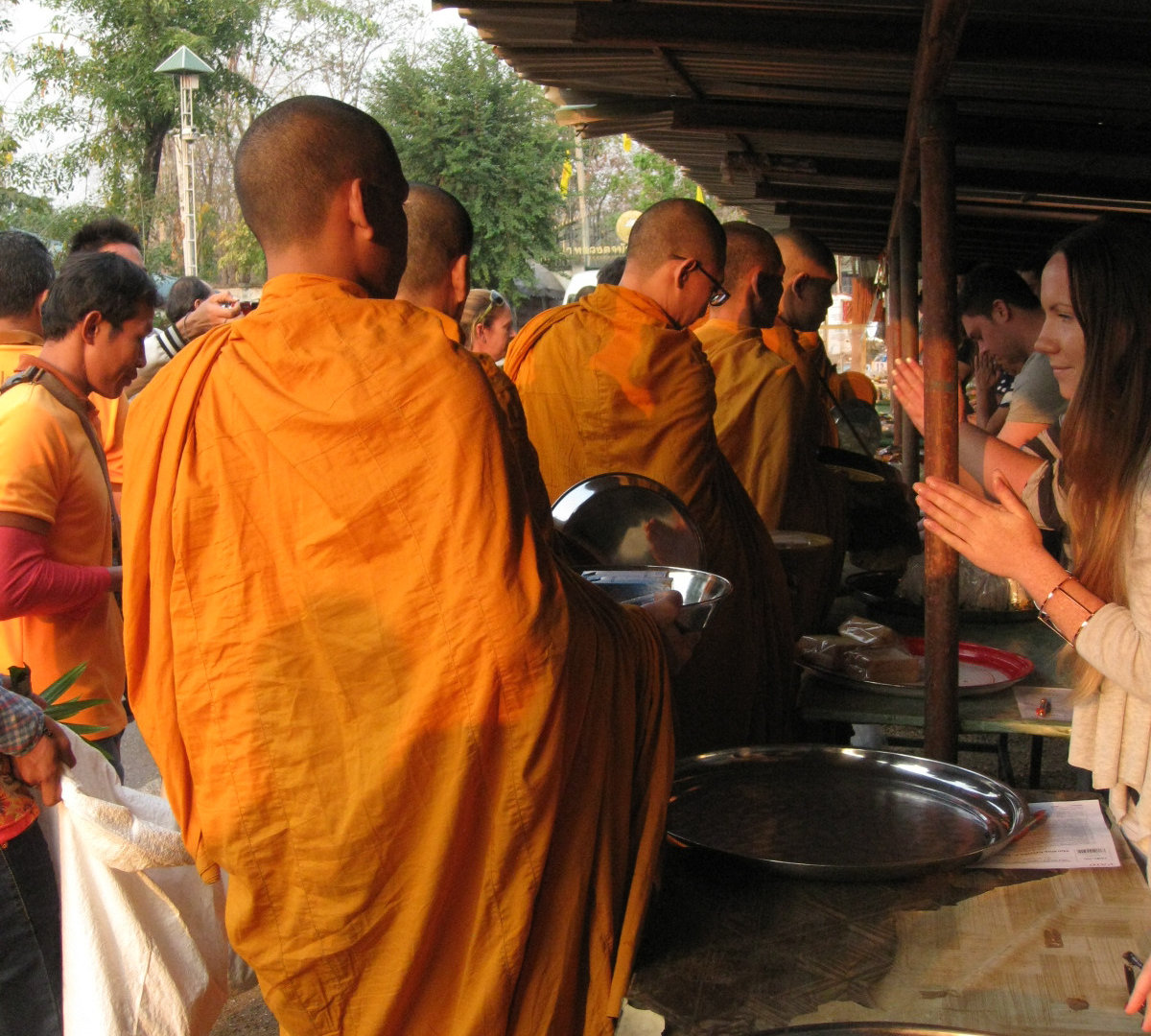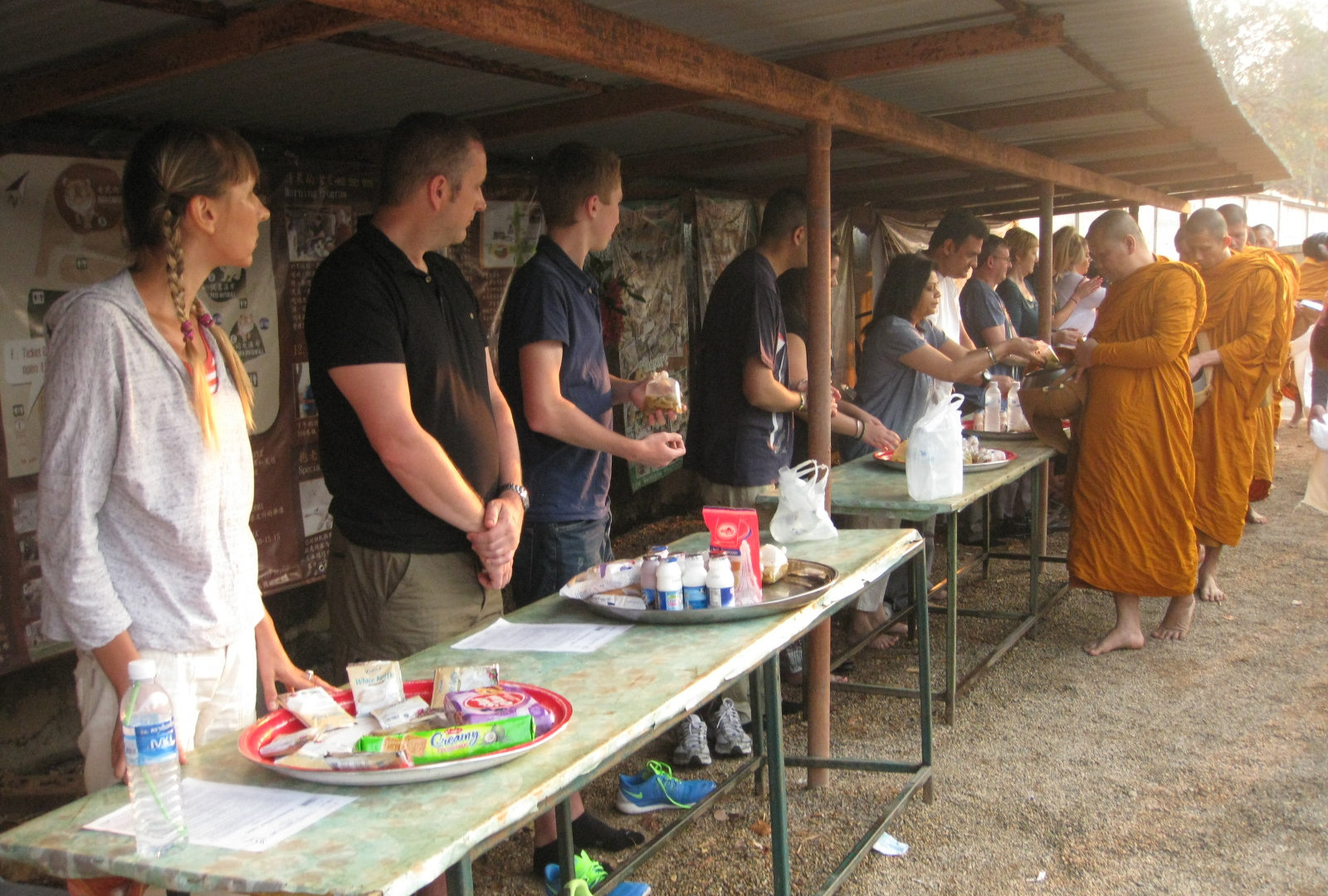 Утро начинается с подношения монахам. Посетители приносят печенье, конфеты, рис, кофе. Монахи проходят вереницей, берут угощения и благословляют туристов.
