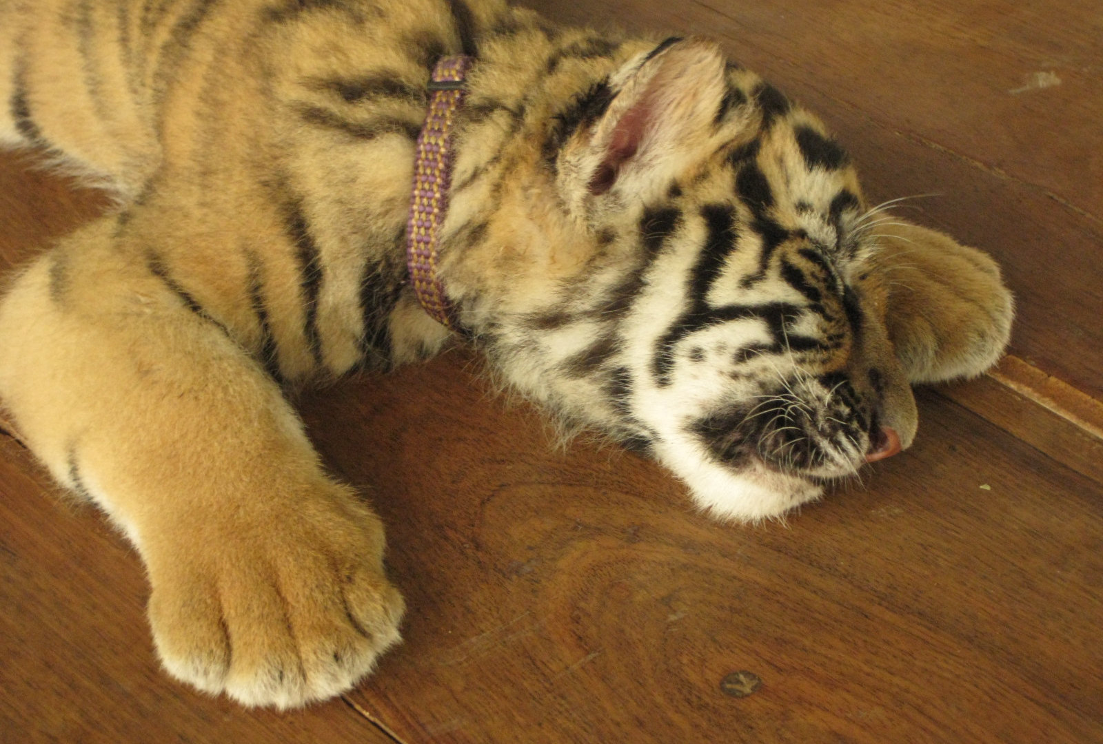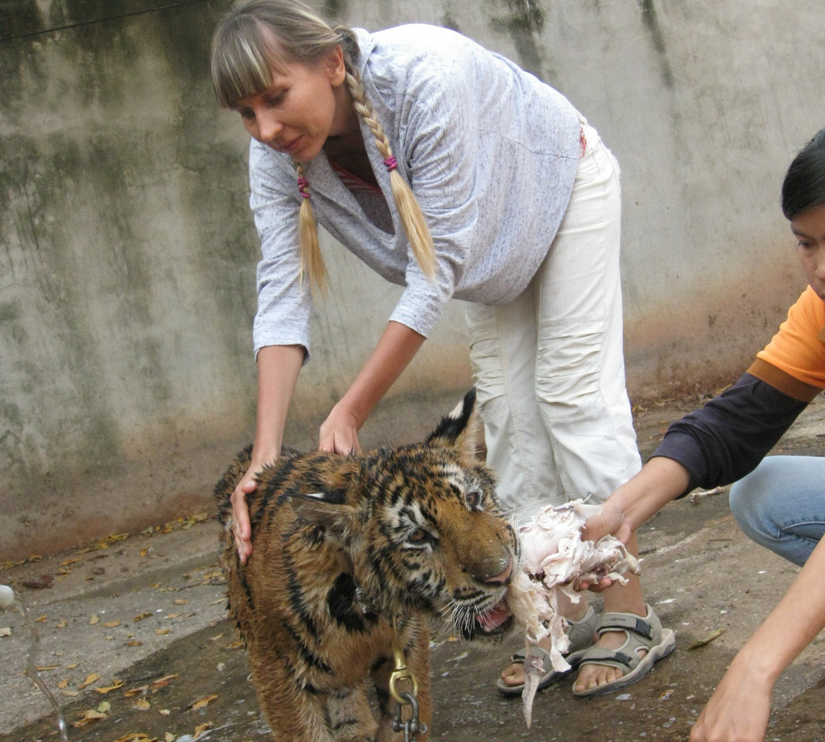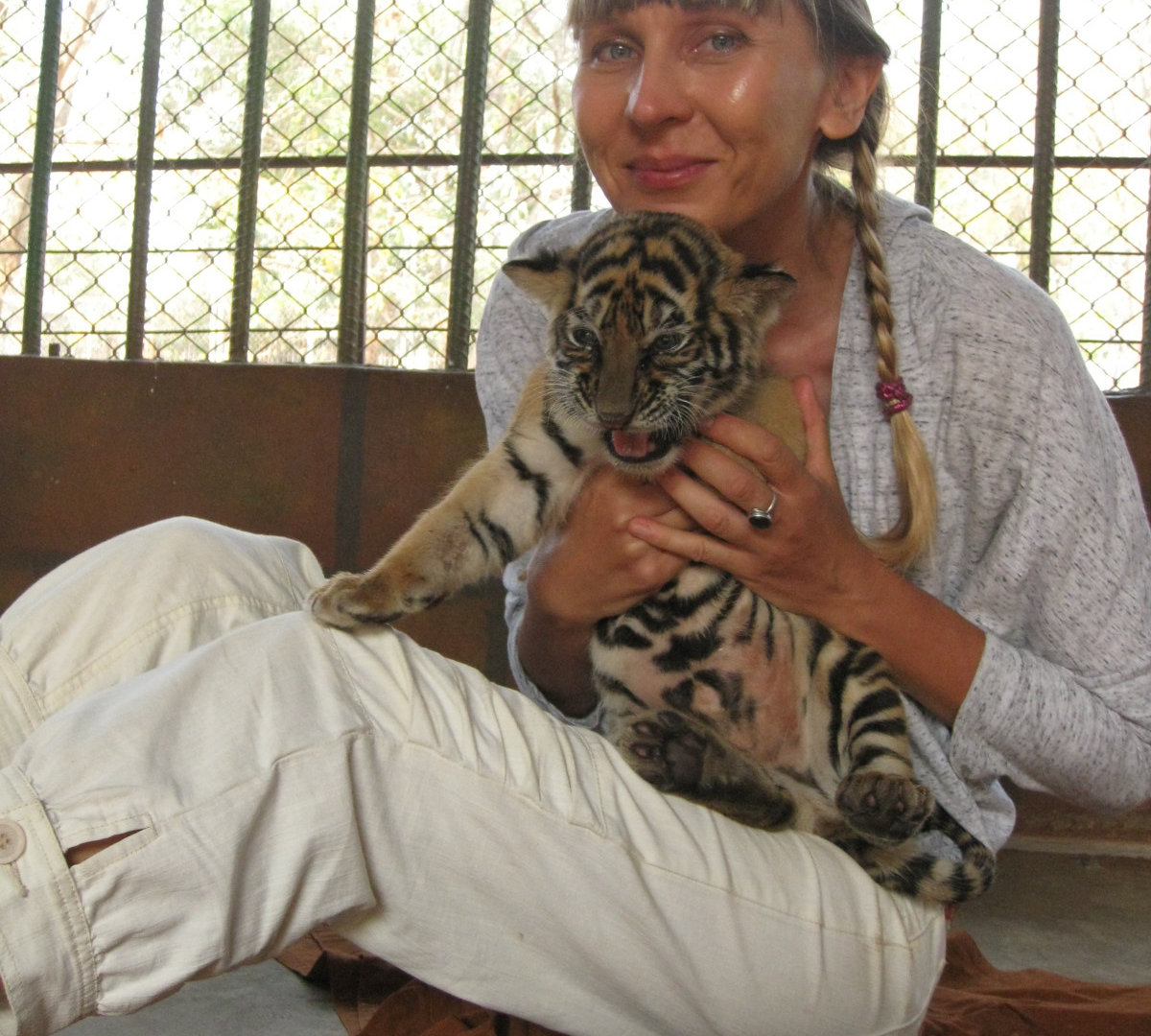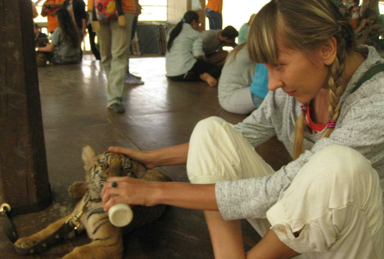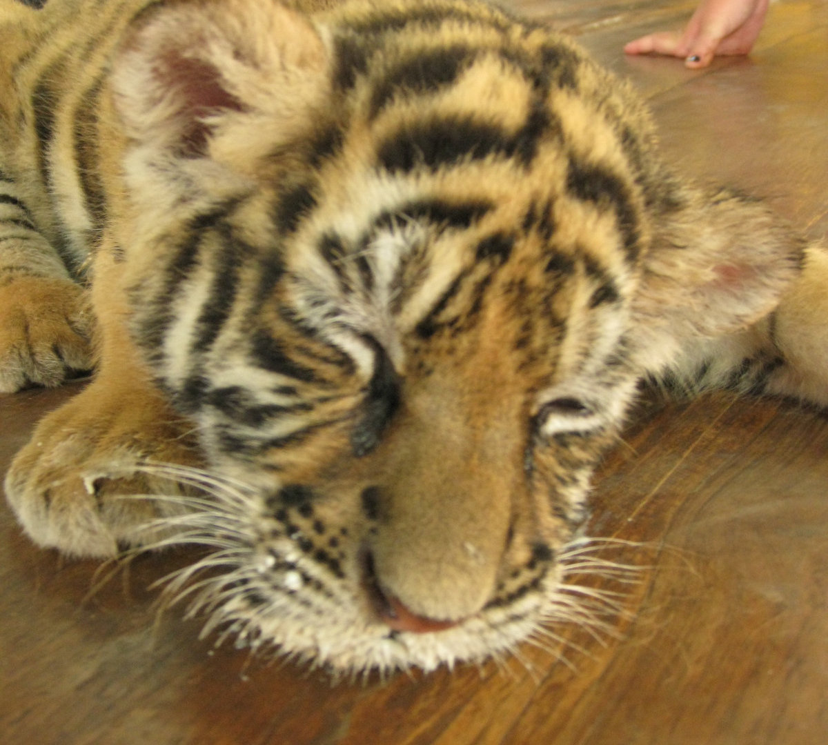 Потом начинается совместный завтрак.В зал приводят маленьких тигрят и тигрят-подростков. И какой уж тут завтрак! Мне было точно не до него! Какое же это счастье-держать на руках малявку-тигра и кормить его из бутылки молоком! Он напился молока,испачкав в нём всю мордаху и заснул:)