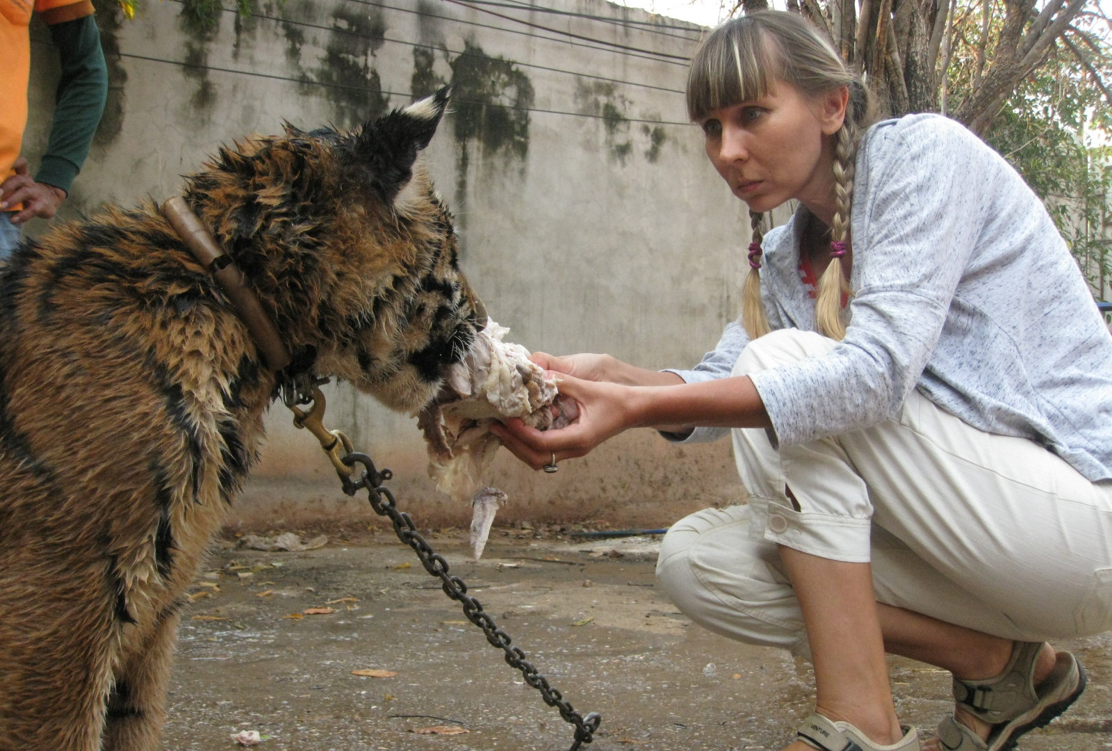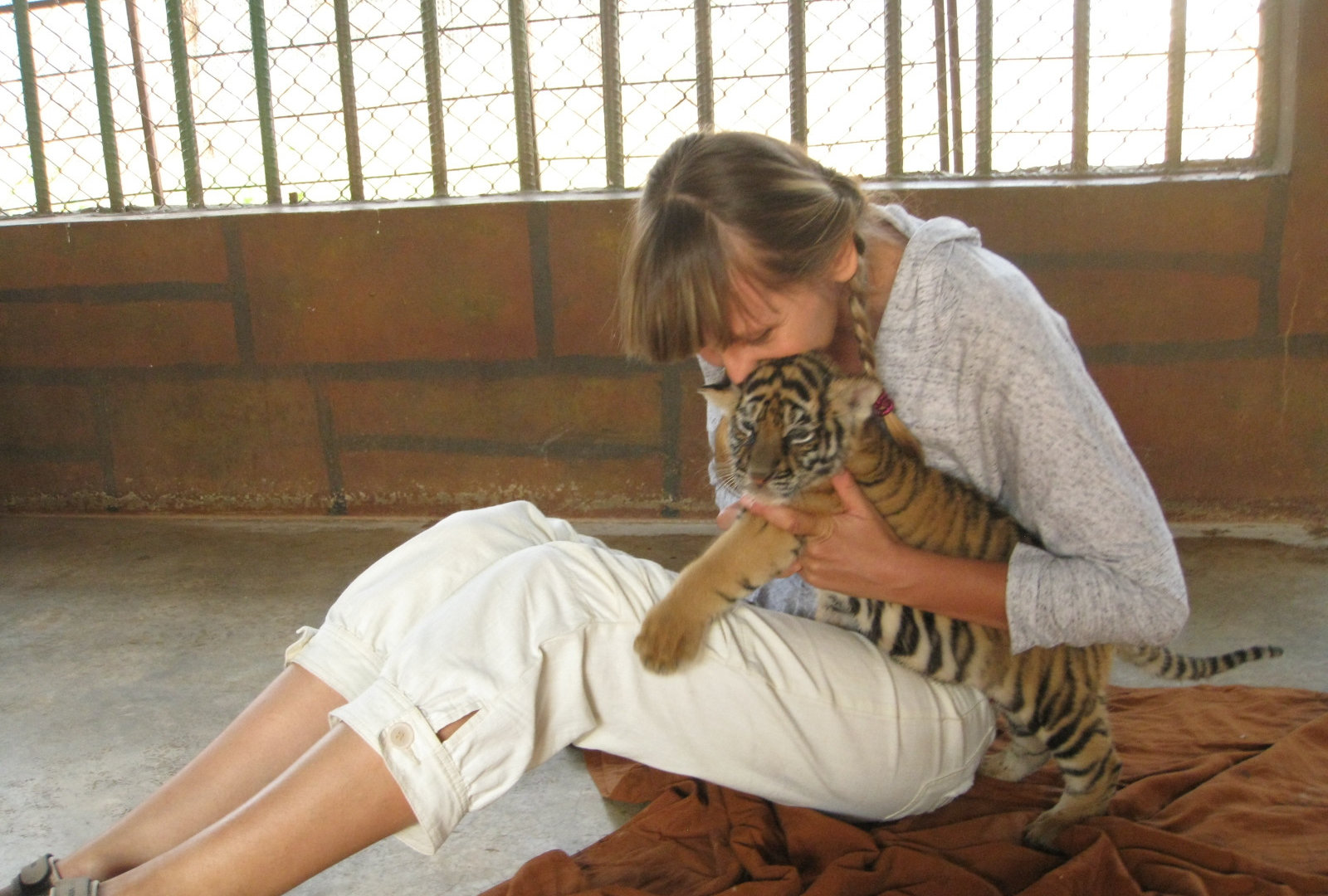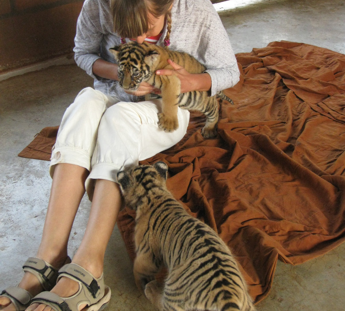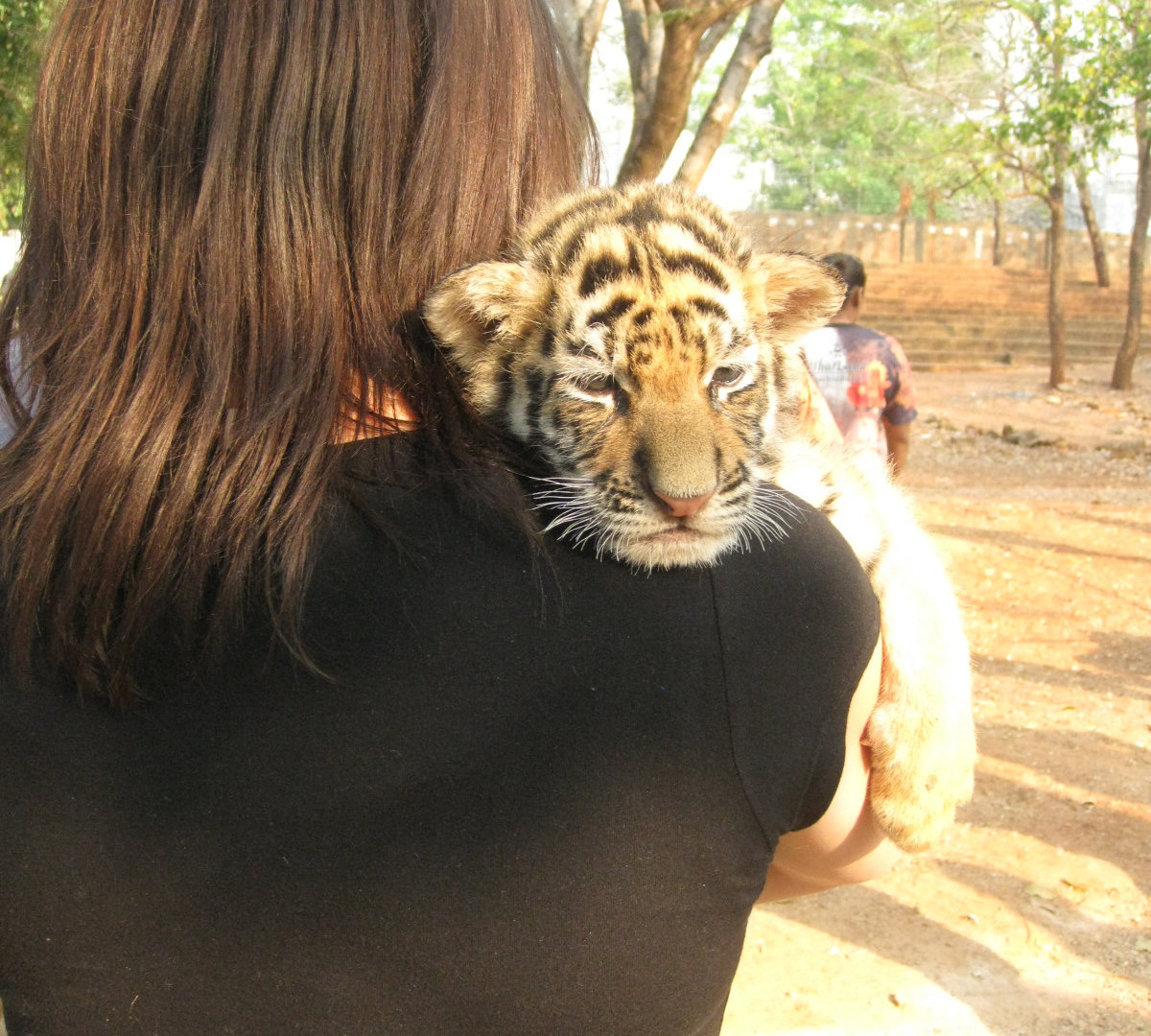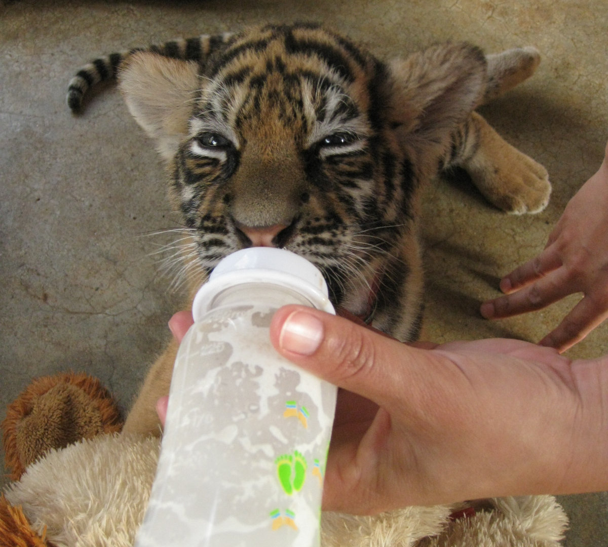 Потом начинается совместный завтрак.В зал приводят маленьких тигрят и тигрят-подростков. И какой уж тут завтрак! Мне было точно не до него! Какое же это счастье-держать на руках малявку-тигра и кормить его из бутылки молоком! Он напился молока,испачкав в нём всю мордаху и заснул:)