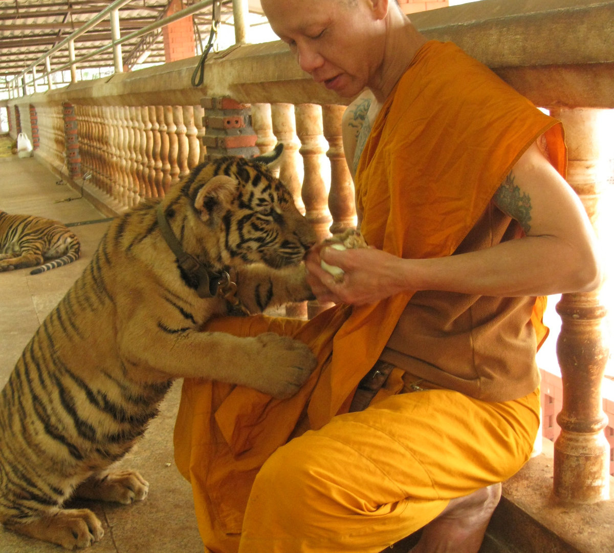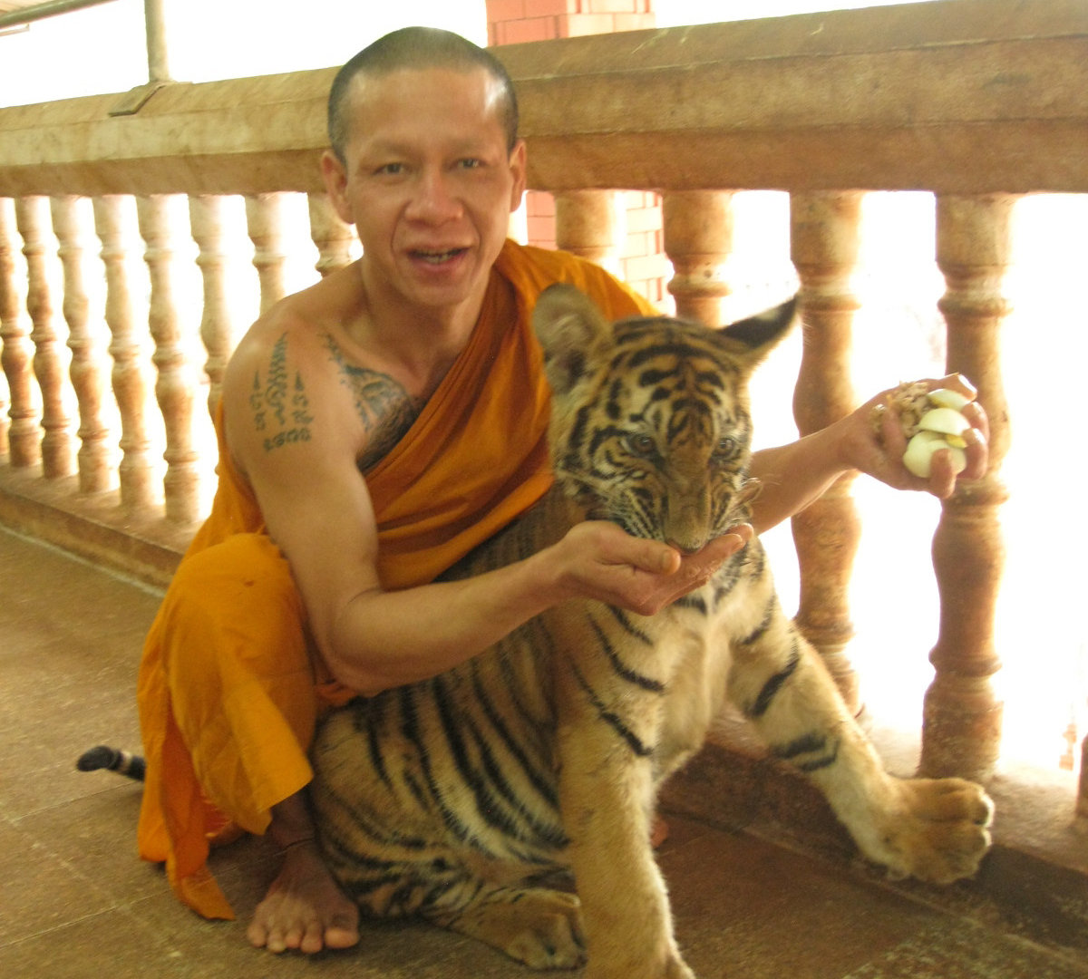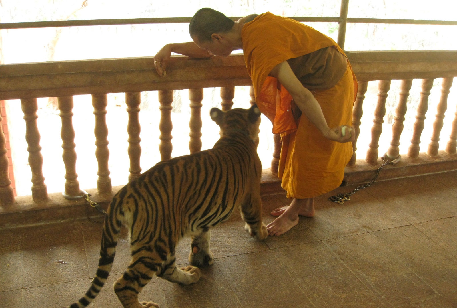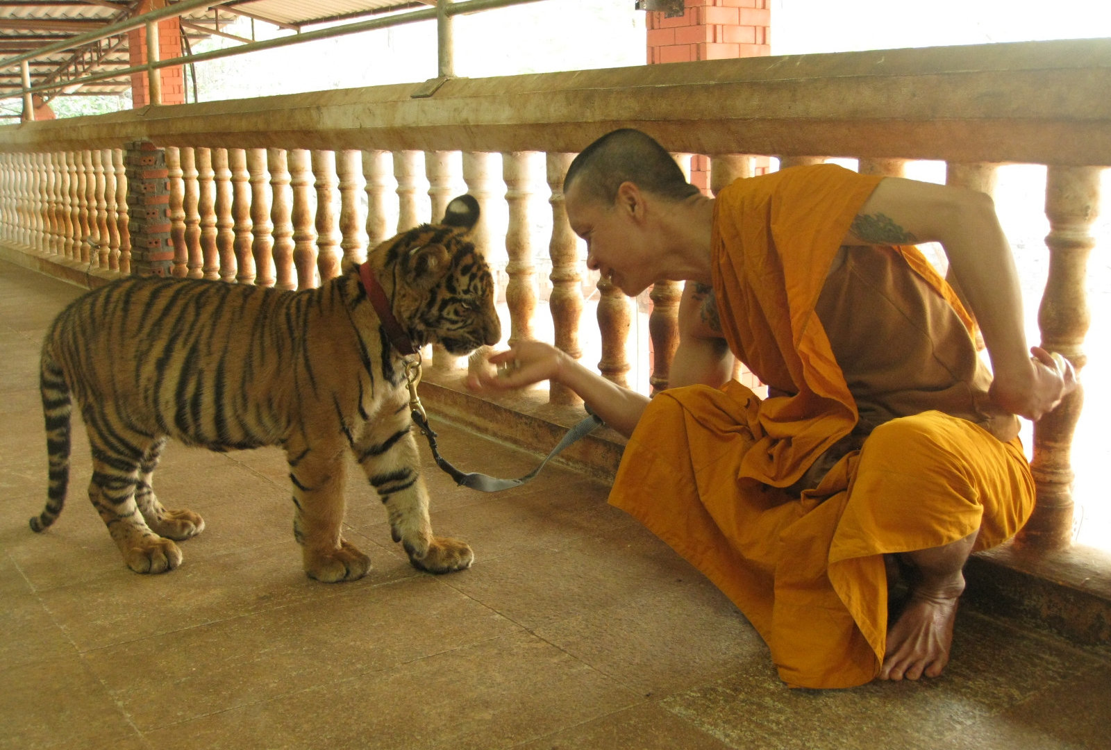Потом в монастыре появились ещё тигрята-местные жители находили их, осиротевших в лесу, и спасали от охотников... Прошло много лет. Сейчас в монастыре живут пятьдесят тигров. Тигры практически ручные и не боятся людей. Конечно, туристов совсем близко не подпускают ко взрослым тиграм, потому что люди могут испугать животных или спровоцировать их. Всё-таки, они хищники:)