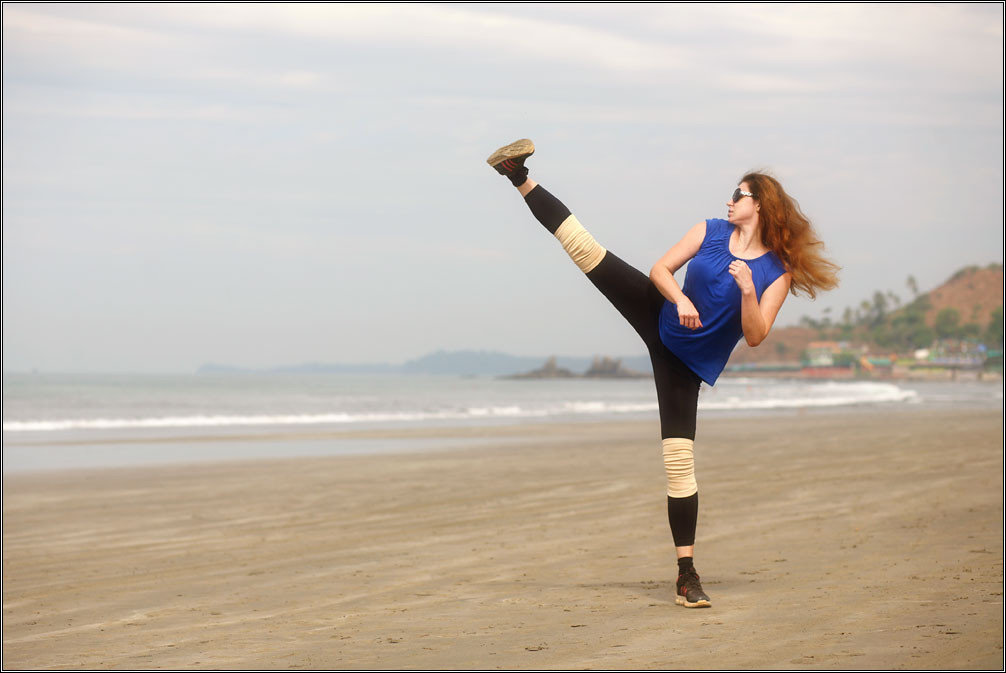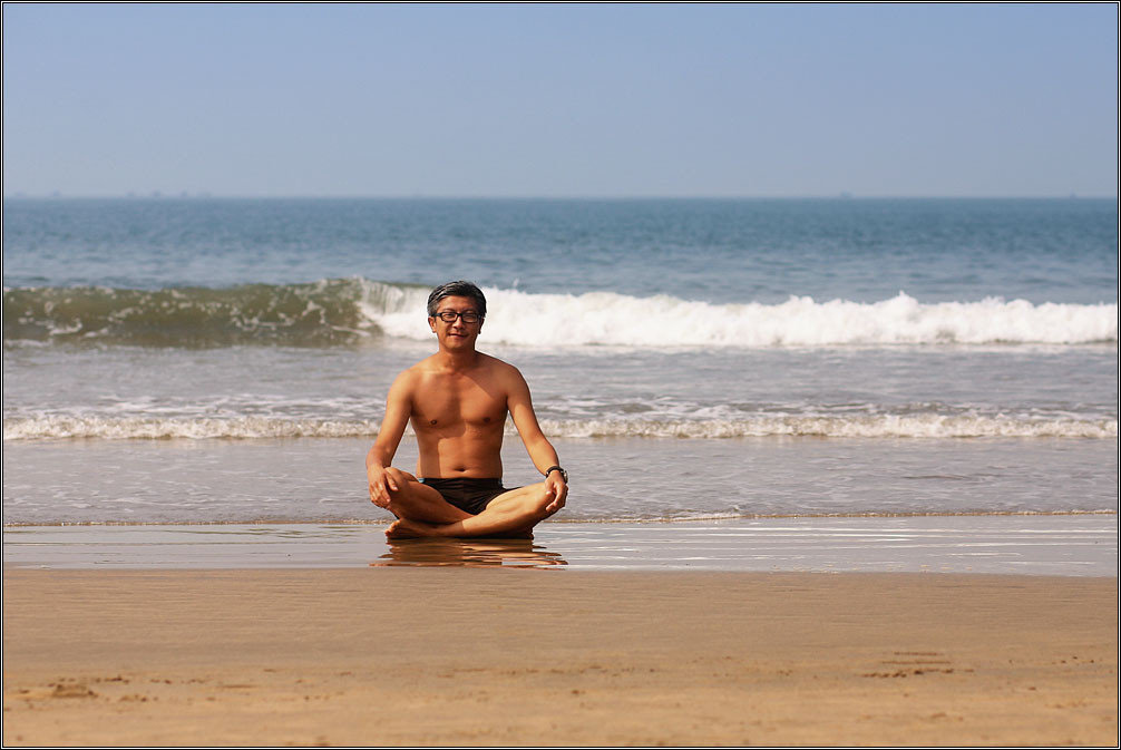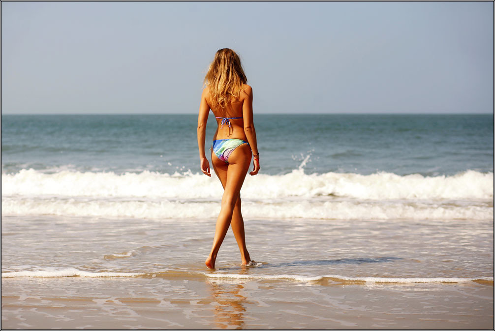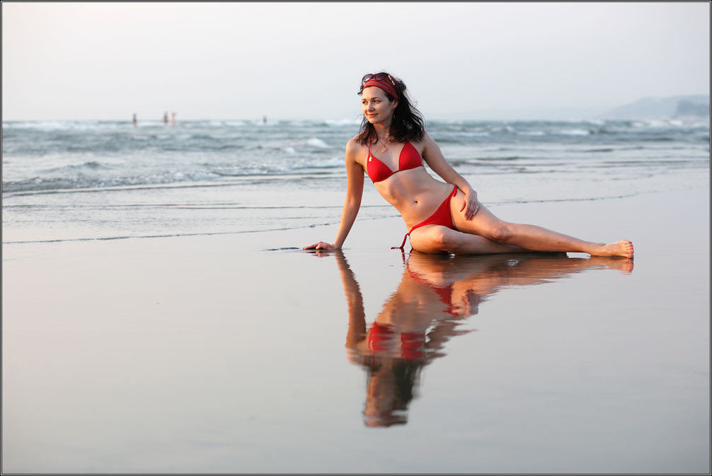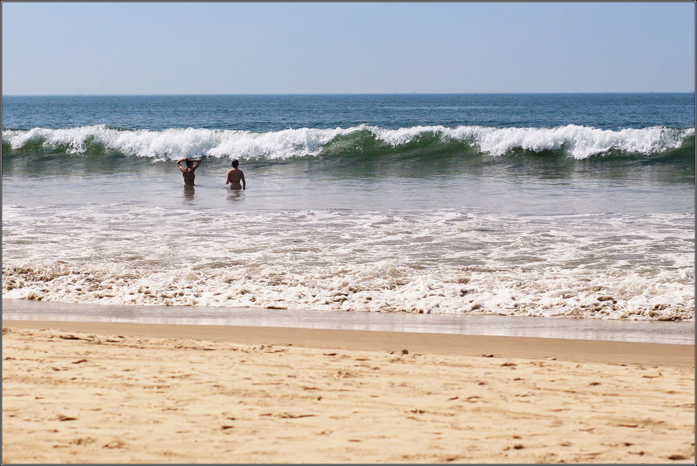 Действительно, пляж оказался близко. Практически совершенно пустой. Без шезлонгов, ларьков, ресторанчиков и туристов. Из торговцев присутствовал один индус с мороженым на велосипеде. Следы на песке, кажется, были тоже только от его велосипеда. В километре правее какая-то жизнь еще теплилась, кажется, но мы туда не пошли — окунулись, сделали пару кадров и поехали выбираться обратно :)