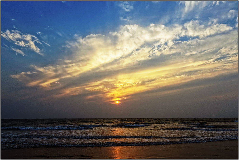 Неожиданно случился нормальный красивый закат, что для Гоа — редкость. Обычно здесь нет никакой облачности, и солнце просто садится в море без всякого красиво подсвеченного неба. А вчера было ветрено, нагнало туч на все горизонты, и в результате получился даже двойной закат — когда солнце сначала подсвечивает низкие, а через какое-то время и высокие перистые облака.