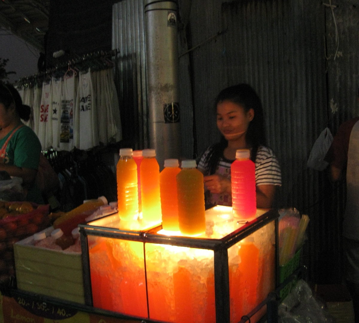 А в сумерках улица начинает сверкать огнями реклам и фонариков.