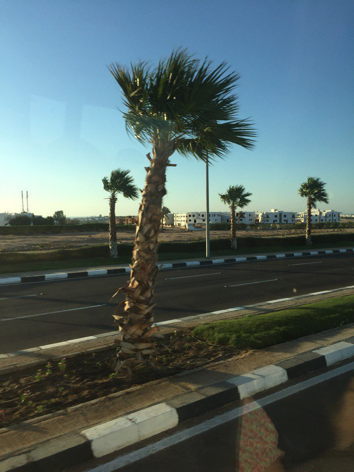 По дороге в отель я успел в окно автобуса рассмотреть улицы Шарма, пальмы, дороги, людей.