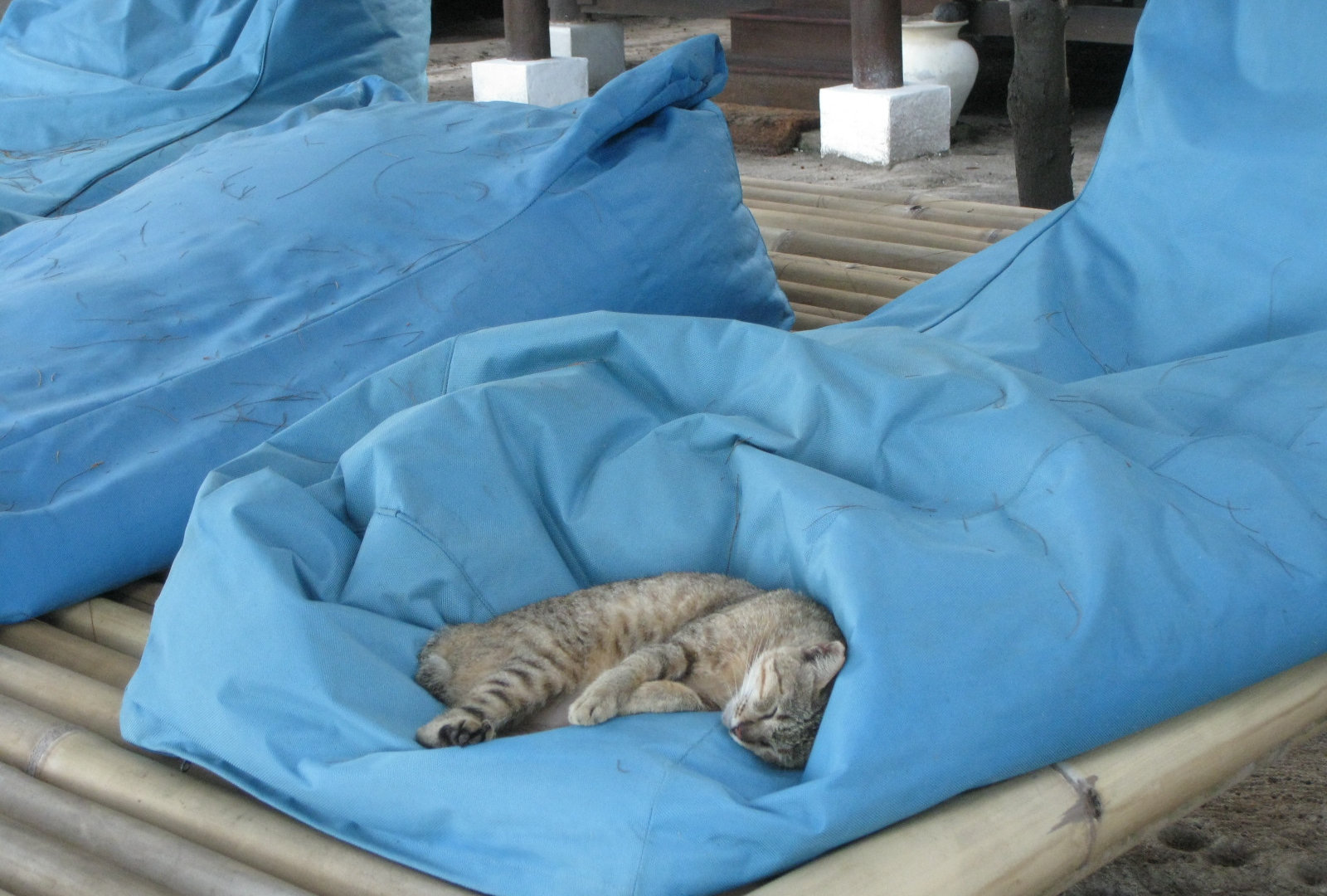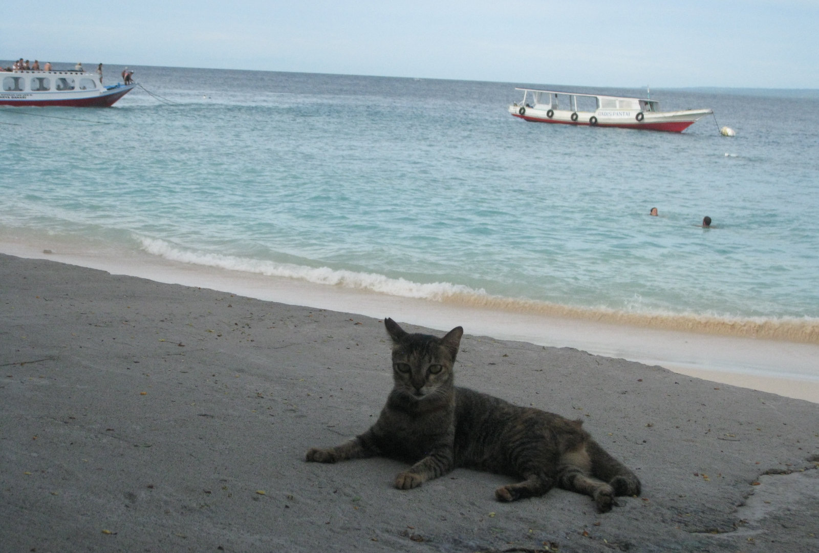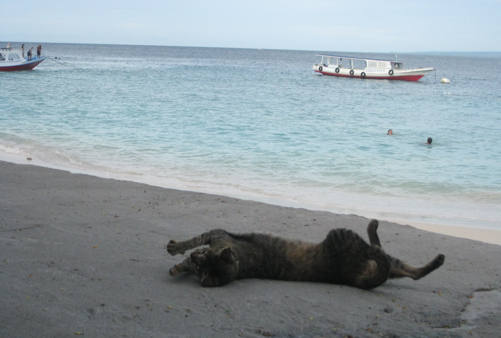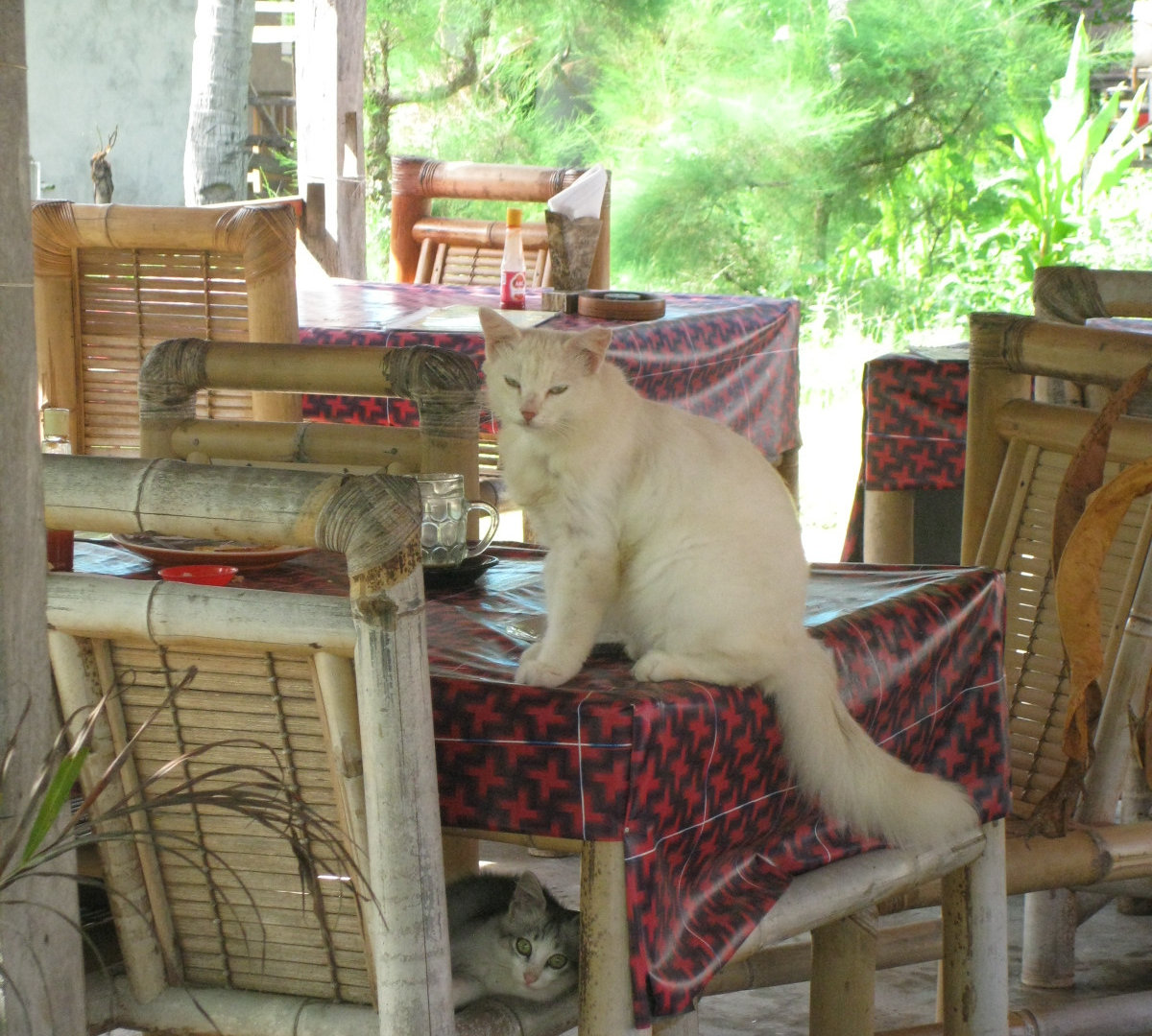 Вообще, всех котов здесь любят. Кормят их не только местные, но и туристы. По вечерам народ приходит ужинать в кафе, а там уж коты их быстренько окружают по периметру беседок и столиков. Кошки-мамы приводят детей. А коты-папы по вечерам сбиваются в бандитские стаи и делают набеги на кафешки, где готовят мясо и рыбу на гриле. Ещё коты развлекаются на пляже-гоняются за крабами. Собак на острове нет. Наверное, этот остров-кошачий рай после их девяти жизней.
