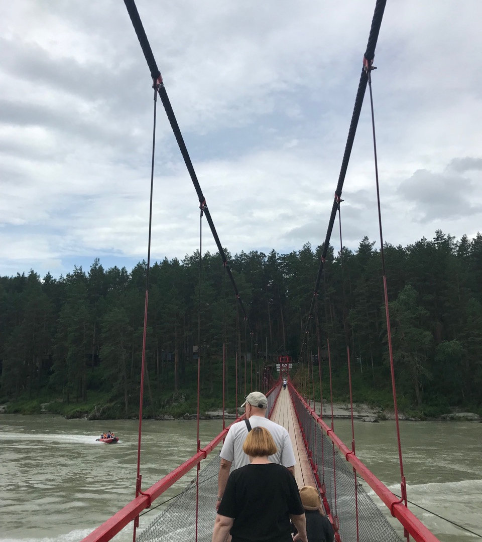 Проход на территорию базы и далее по мосту — платный, в этом сезоне он стоит уже 150 рублей. На территории самой базы есть кафе, бассейн с лежаками, пруд с большими китайскими рыбами и мостик (на который, кстати, проход запрещен))), медведь Миша в клетке, живущий на Царской охоте уже почти 10 лет (самому медведю уже 16 лет). Сама база располагается на берегу Катуни, непосредственно отсюда ведет подвесной мостик длиной порядка 25 метров и примерно 15 метров в высоту. Ширина моста — обе вытянутые руки. Вот по нему то мы и пошли. Впечатлений, я вам скажу, масса! Балансировать пришлось не только от раскачивающегося из стороны в сторону моста, но и пропуская навстречу идущих туристов. Обязательно спрячьте ценные вещи в сумку, пусть руки будут свободны — держаться придется двумя руками.