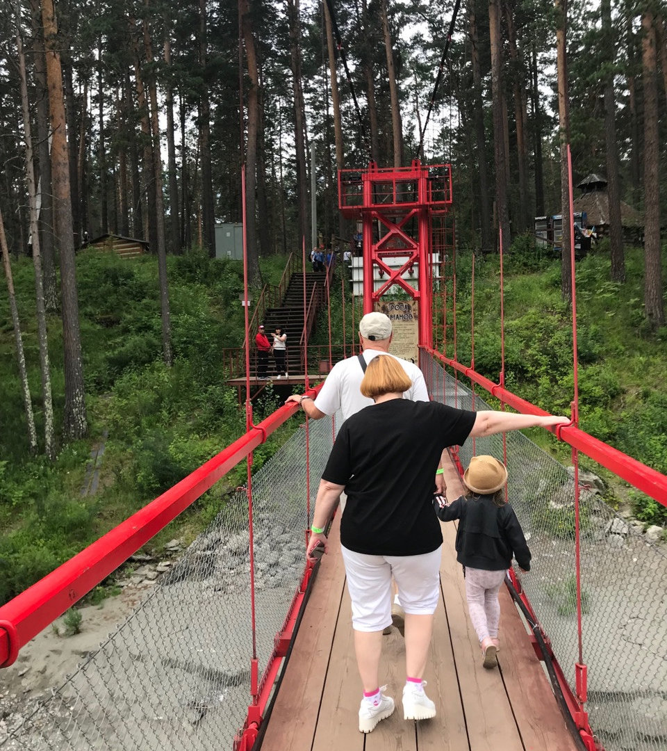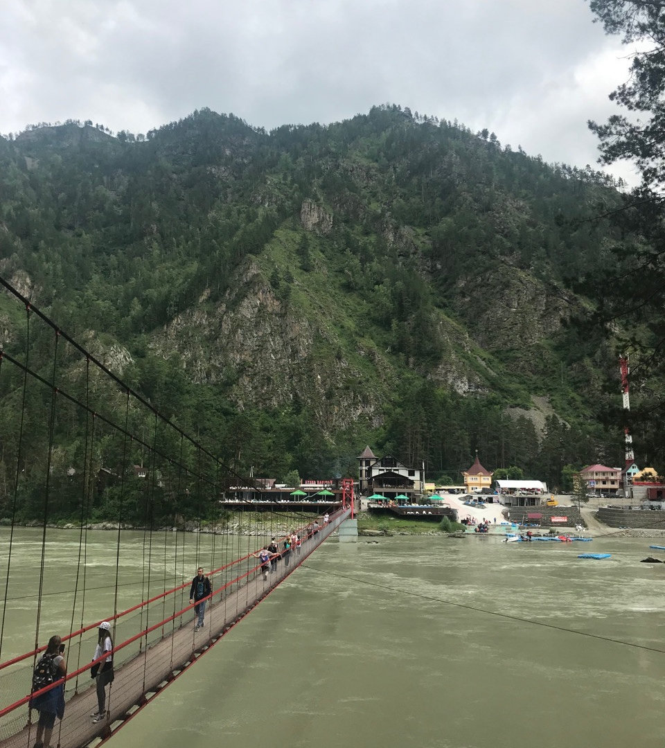 Снизу красиво шумит вязкая бетонного цвета вода Катуни, проплывают моторные лодки, визжат катающиеся на них туристы. Красота! а воздух — непередаваемый!