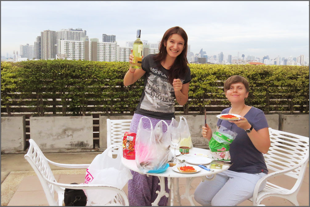 В Бангкоке приехал к двум подружкам — заранее договаривались, что я у них поживу по дороге в Краби. У них, правда, была маленькая студия с одной кроватью, но мы как-то уместились. Хотя и пинали друг друга регулярно, приходилось: кто ночью храпит, кто разговаривает, кто смеется, в общем, не только днем, но и по ночам нам было весело :)
