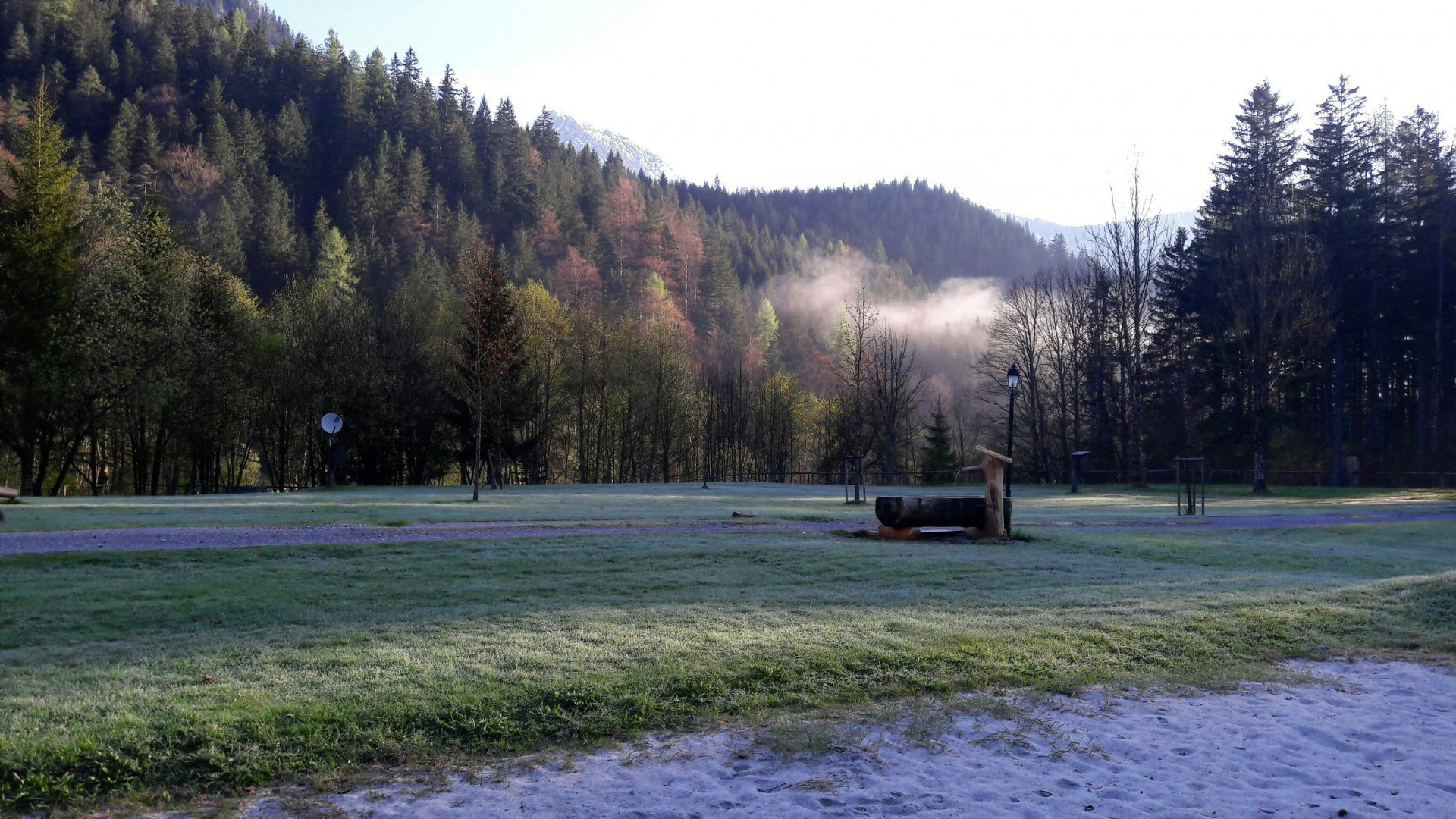 Проснулись мы с первыми лучами солнца. Вышли из палатки и обомлели от увиденной красоты. Эти ощущения не передать словами. Солнце уже встало над вершинами гор, легкий иней на траве, туман среди деревьев еще не рассеялся, и ТИШИНА, ни одной живой души в парке.