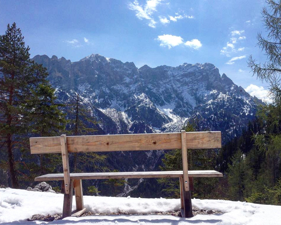 Пробираясь по снегу в кроссовках, мы уже почти были готовы сдаться и развернуться. Но тут, мы увидели одну пару преклонного возраста, местные жители. Они сказали, что мы еще рано разворачиваемся и предложили показать одно интересное место. Пройдя с ними буквально еще 10 минут, мы оказались на прекрасном утесе. Это было самое романтическое место в этом парке. Скамейка которая стоит прямо на утесе и открывает живописный вид на вершины гор, реку и парк. Эти прекрасные пожилые люди немного поболтали с нами и оставили нас одних, чтоб мы могли немного побыть в тишине и насладиться этим местом. Сколько времени мы провели на этой лавочке я не знаю. Но этот вид навсегда врезался в мою память!