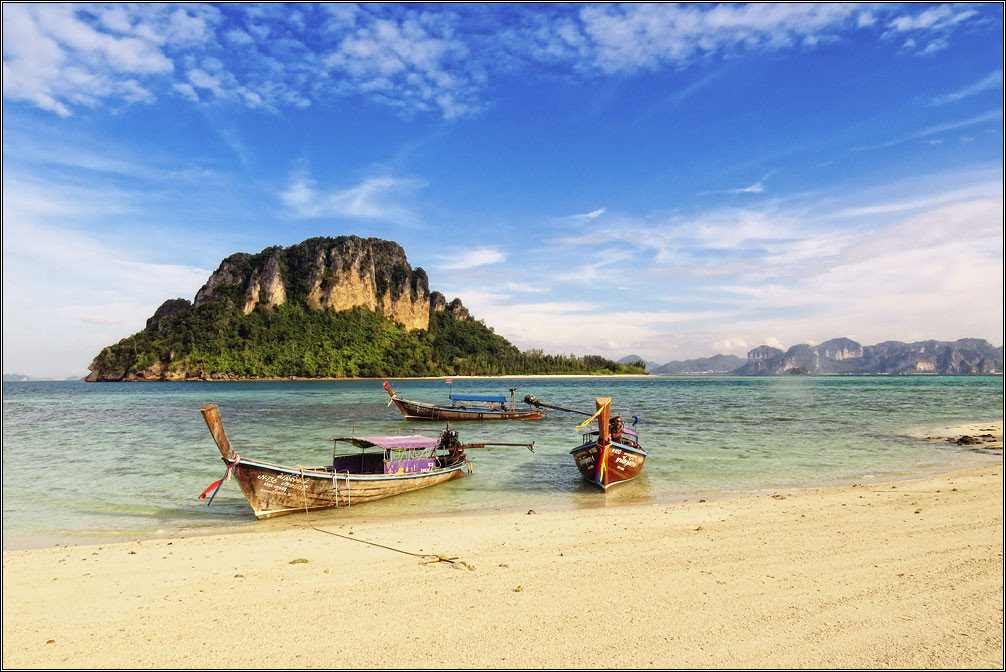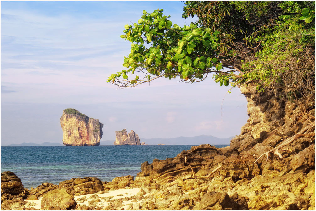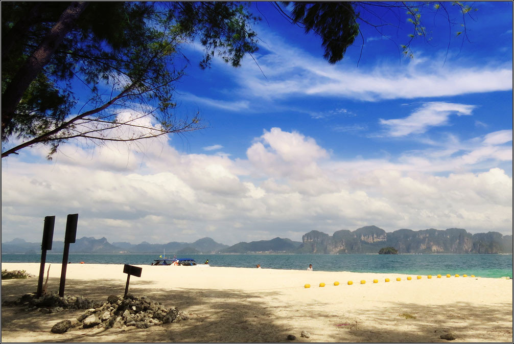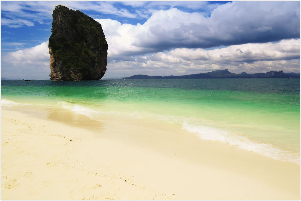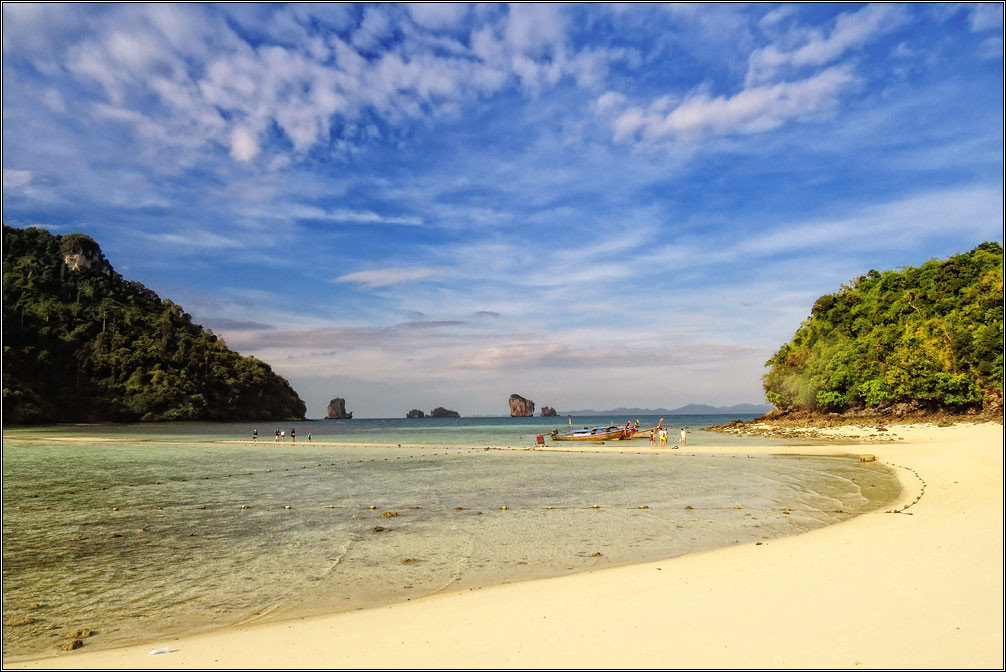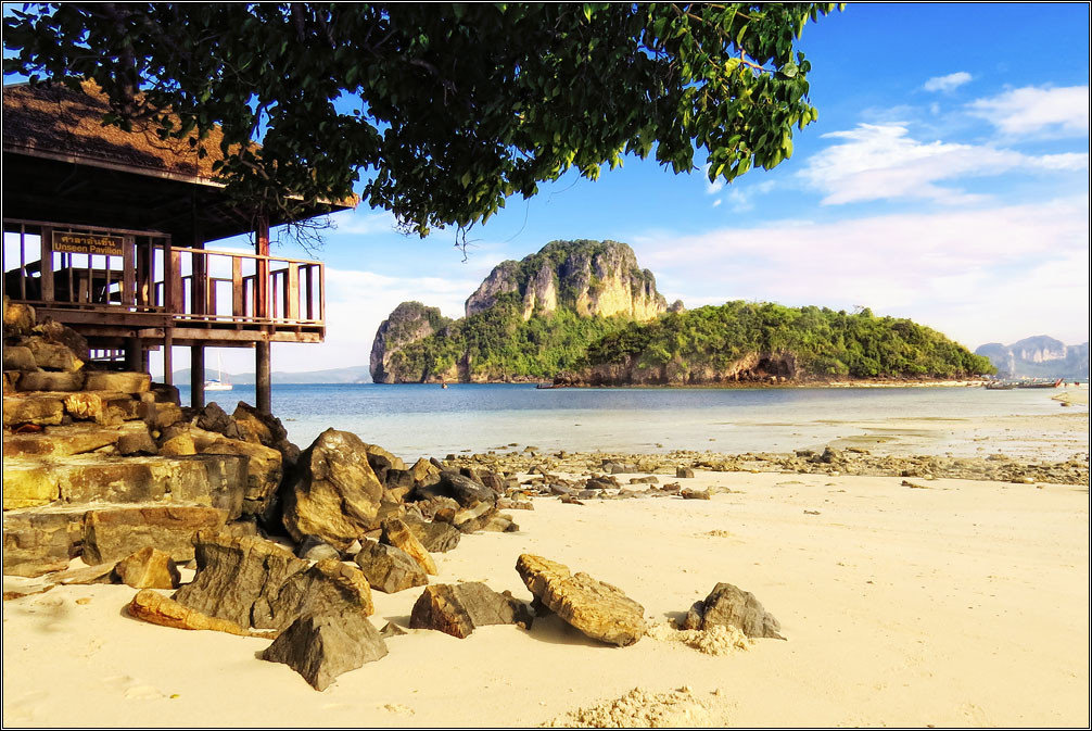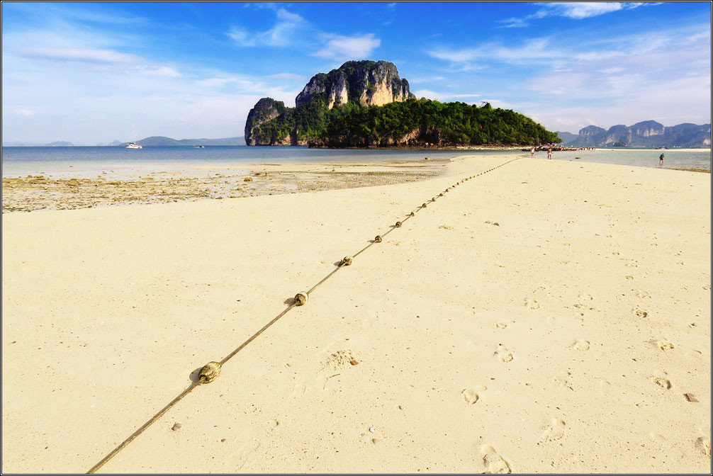 Два маленьких островка, Tup и Chicken, соединены между собой отмелью, по которой в отлив можно перебраться с одного на другой. Народ туда приезжает с материка толпами ежедневно, но вода и пляж удивительно чистые, по сравнению с Ао Нангом. У меня сложилось ощущение, что это все из-за прошедших дождей, которые смыли с гор всякую муть: почти на всех материковых пляжах видны ручейки, просачивающиеся сквозь песок в море. А на островах просто смывать особо нечего, вот вода и остается прозрачной и лазурной, какой она и должна быть с этой стороны Таиланда.