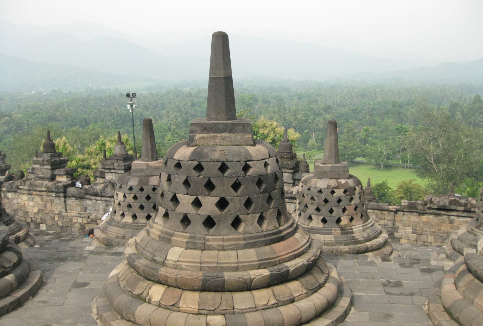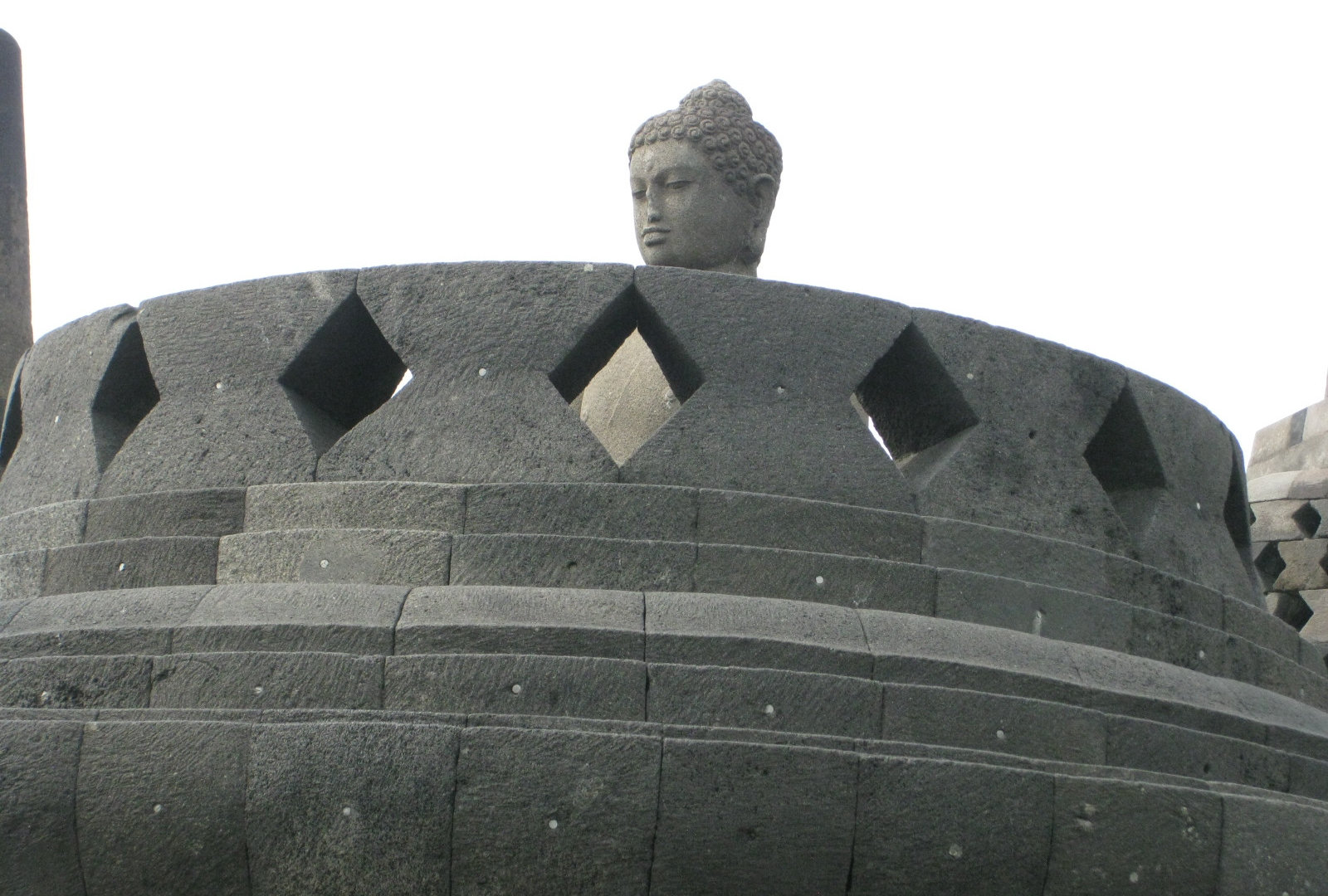 На самом верхнем ярусе Боробудура уже нет барельефов. Там установлены огромные каменные ступы-сооружения в виде перевёрнутых колоколов. В ступах есть сквозные ажурные отверстия, а внутри каждой ступы сидит каменный Будда.