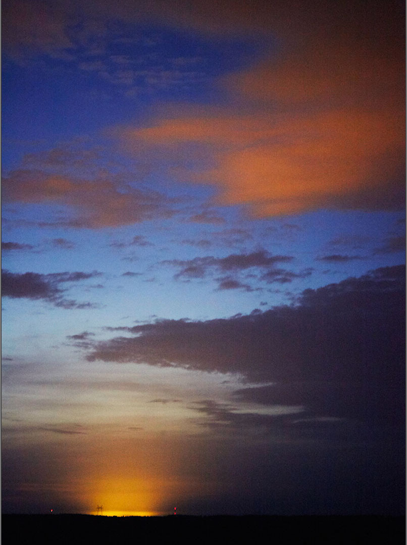 Анапоследок— картинка собратной дороги. Остановились перекусить иразмяться, аясмотрю: вночное небо откуда-то из-за горизонта бьет пучок света, освещая низкие облака.