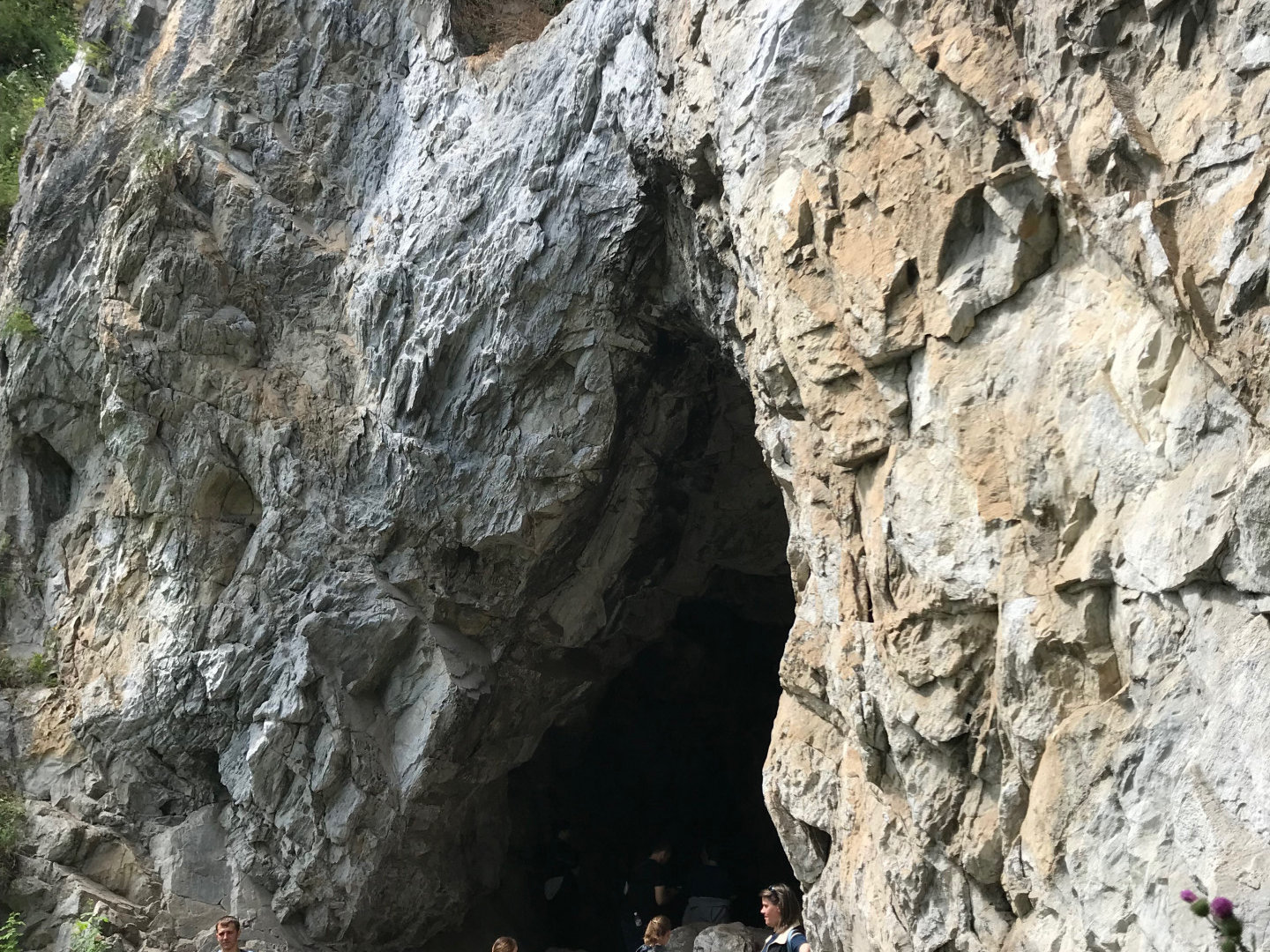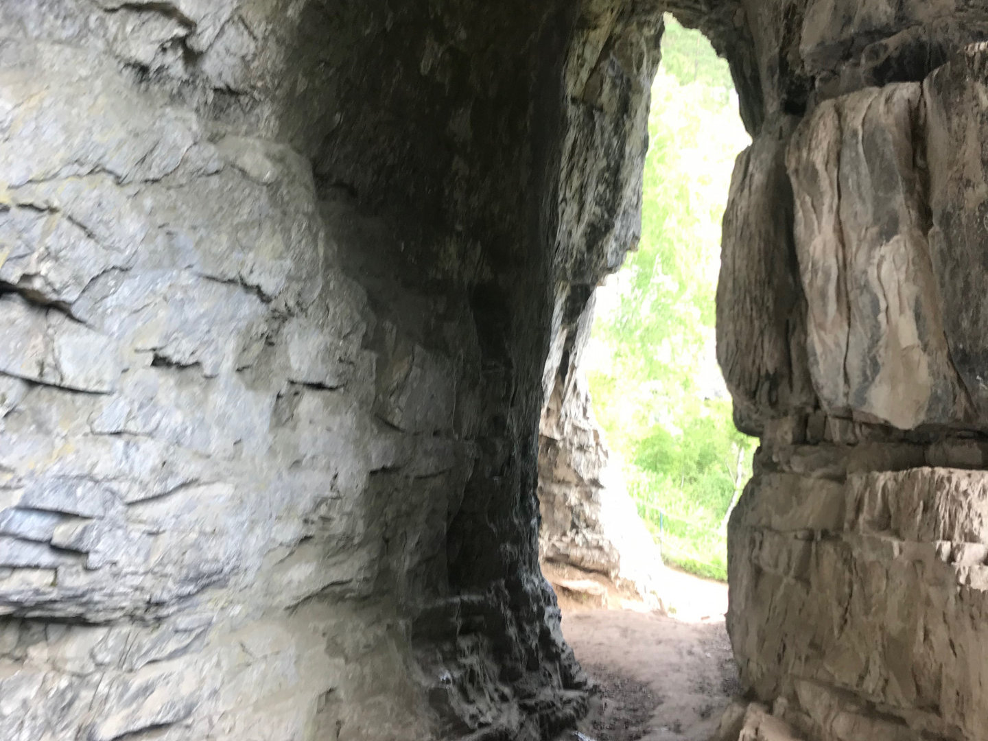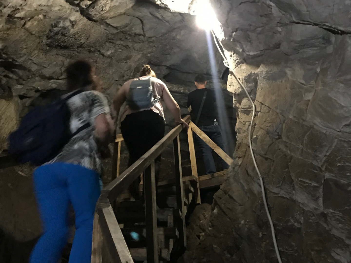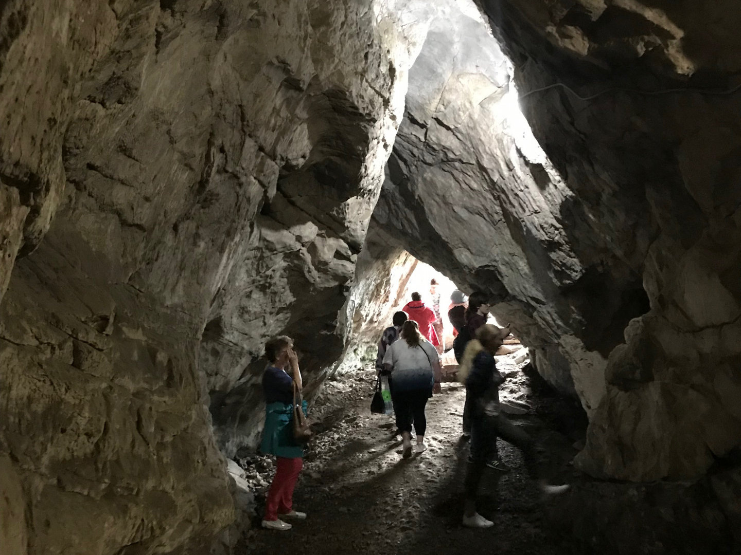Второй — по козьей тропке, то есть узкой скальной дорожке вверх. Мы вышли из пещер и стали подниматься на вершину скалы, в которой разветвляется пещера. Угол подъема составил градусов 45. Держаться приходилось за натянутый трос, поэтому фотографировать не смогла)))