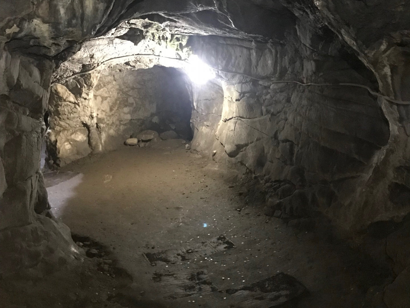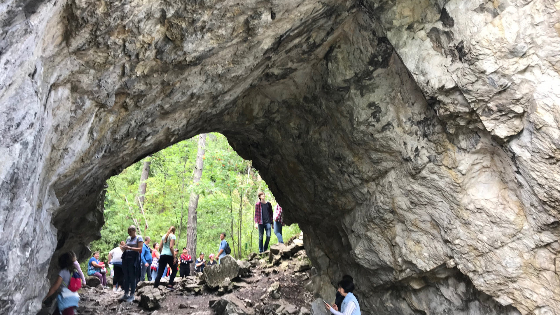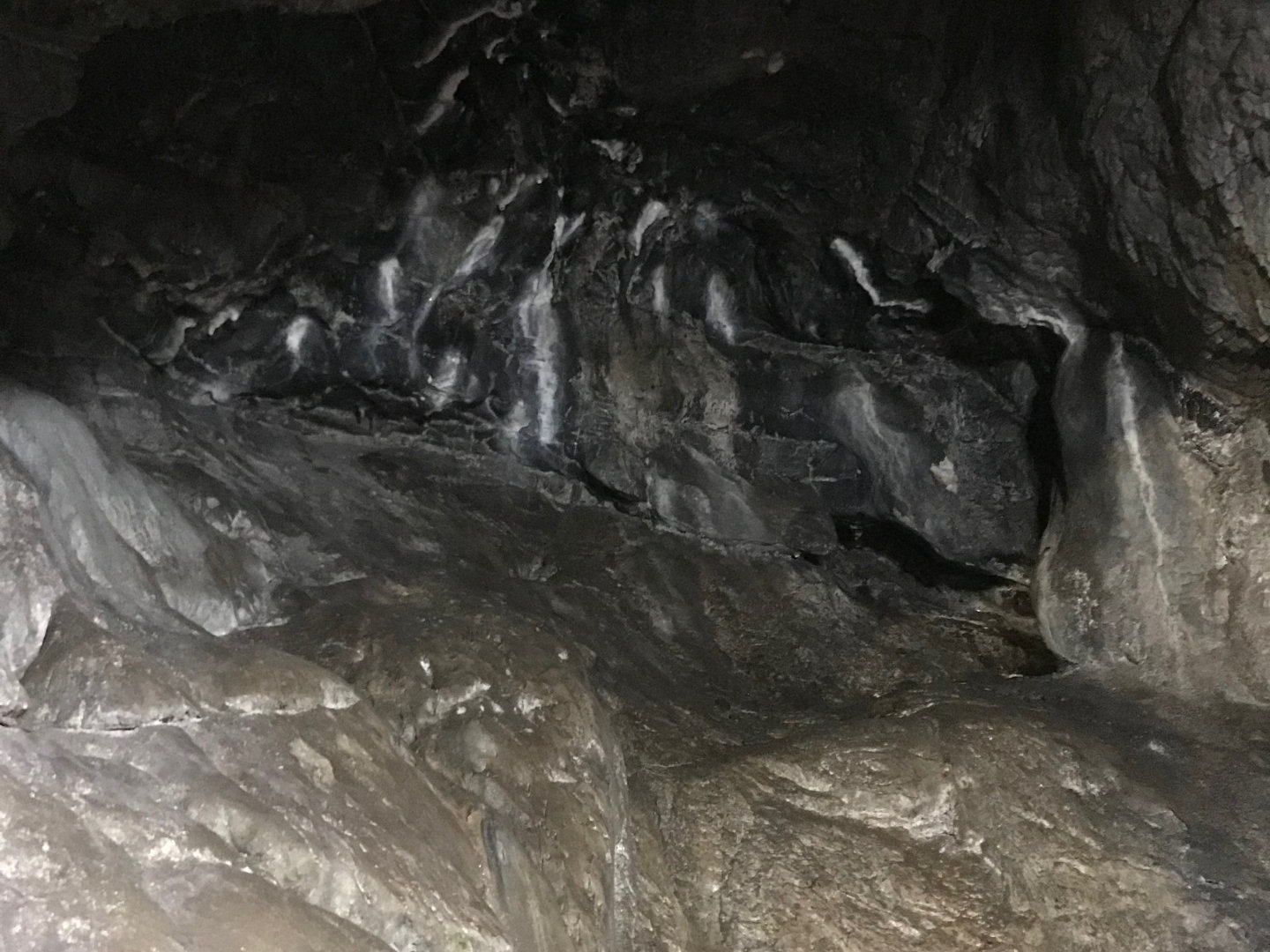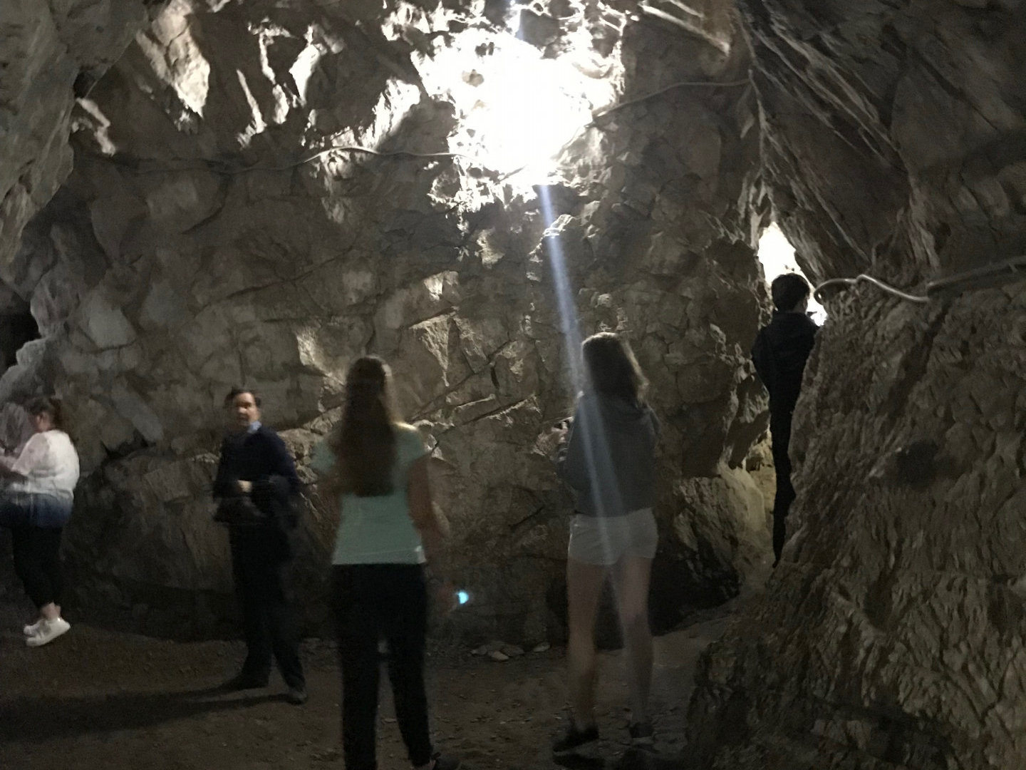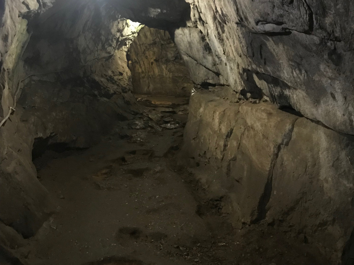Второй — по козьей тропке, то есть узкой скальной дорожке вверх. Мы вышли из пещер и стали подниматься на вершину скалы, в которой разветвляется пещера. Угол подъема составил градусов 45. Держаться приходилось за натянутый трос, поэтому фотографировать не смогла)))