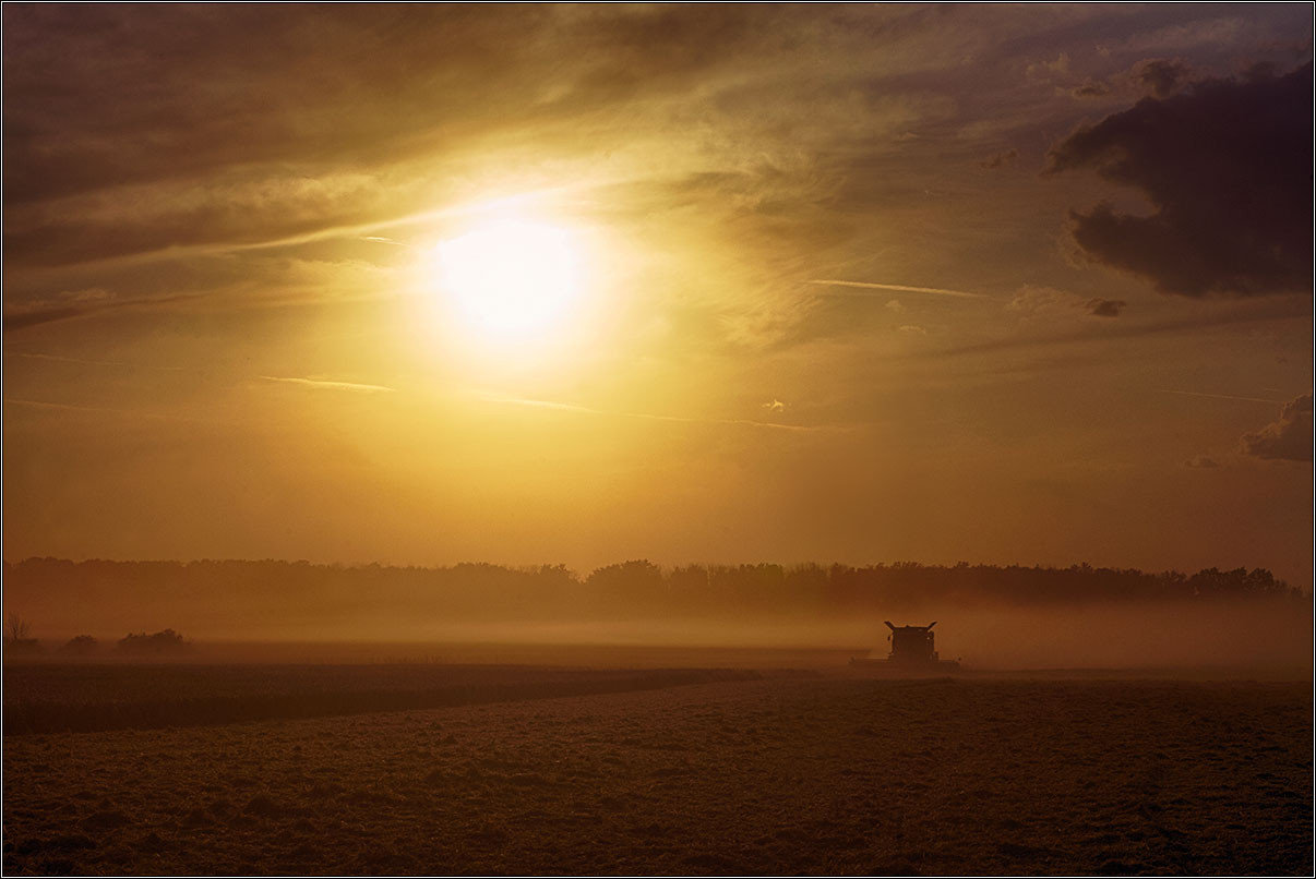 Мыедем наздоровенном Лэндкрузере, ищем, где идет уборка— шеф дал задание поснимать назакате, чтобы солнце через клубы пыли, золотистые поля иидущие строем комбайны. Подороге обгоняем «буханку» скорой помощи.