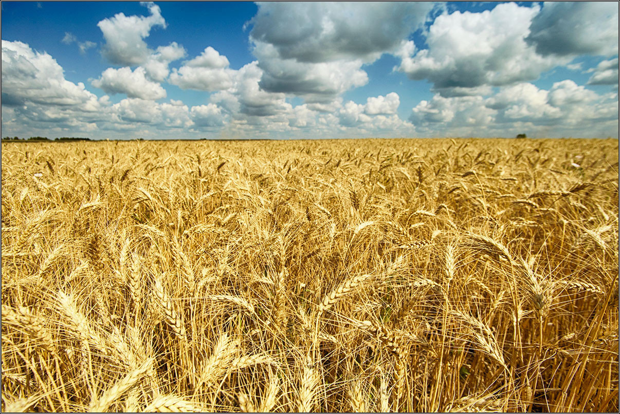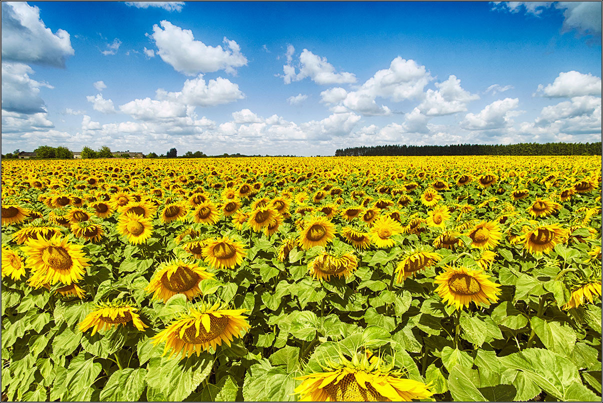 Пшеничные поля перемежаются кукурузой иподсолнухом. Кукуруза выглядит нефотогенично— трава травой, просто зеленое поле. Зато подсолнухи прямо жгут глаза— желтое море отгоризонта догоризонта, там дальше река, зарекой лес, азалесом— опять желтое море. Ивсе это колышется под ветром, переливается, асверху накрыто куполом синего неба сярко-белыми облаками. Красота неимоверная.