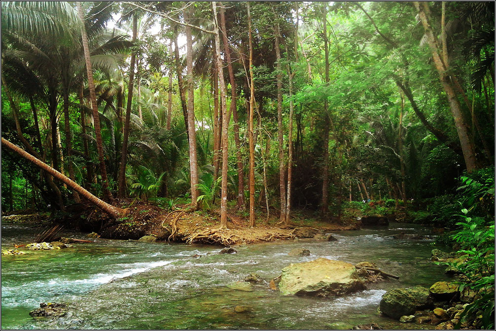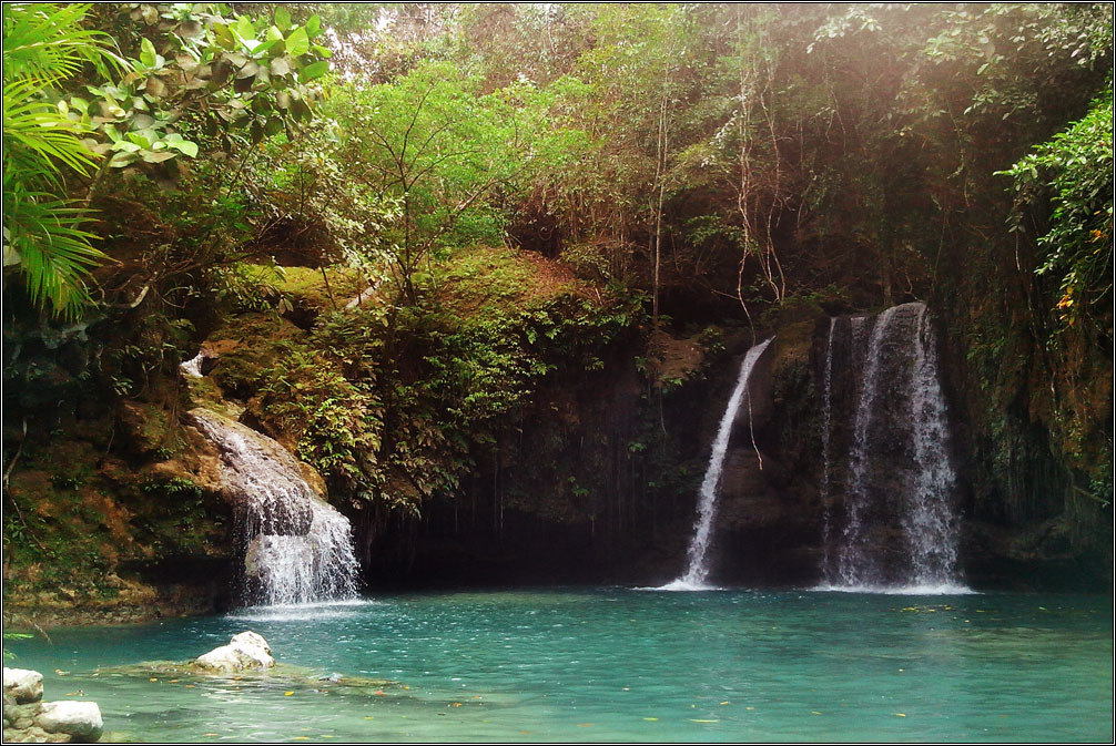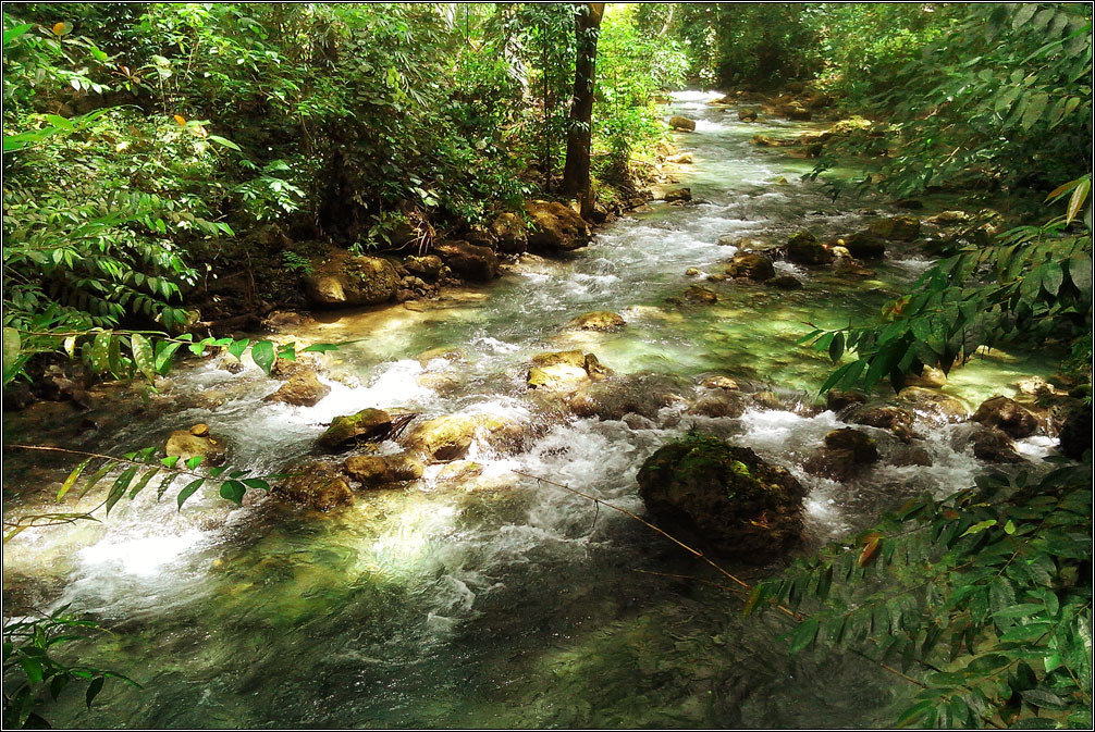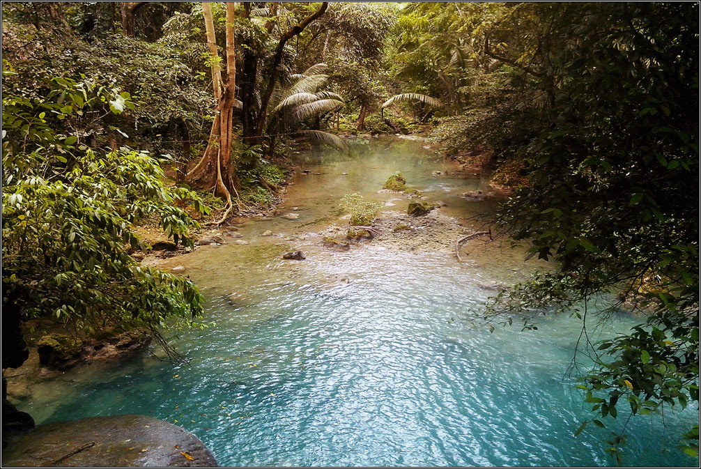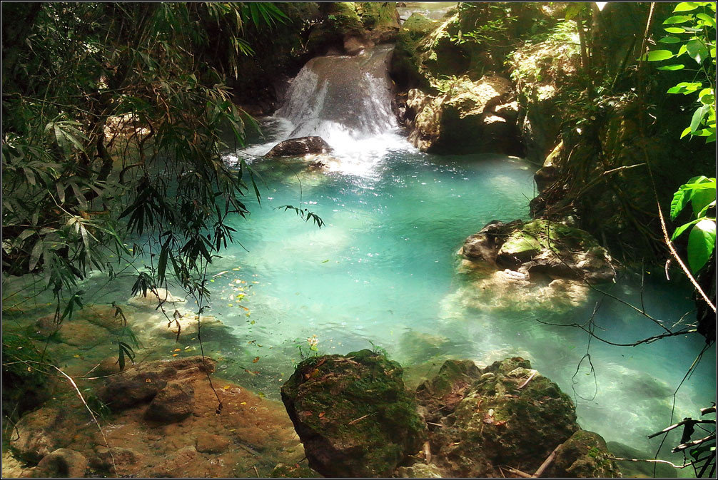 Вход на водопад платный, 50 песо ($1) стоит парковка, плюс еще по десятке с носа – за вход на территорию. Плакат обещал полтора километра пешком, что по опыту хождения к водопадам в Таиланде – довольно много. Но и тут все было не страшно: к водопаду ведет совершенно ровная широкая тропа, причем пролегает она мимо удивительно красивой горной реки. Совершенно голубая вода, прозрачная настолько, что виден каждый камешек на дне, участки с бурным течением и порогами, тихие заводи, склонившиеся пальмы, игра света и тени – полтора километра проходятся абсолютно незаметно.