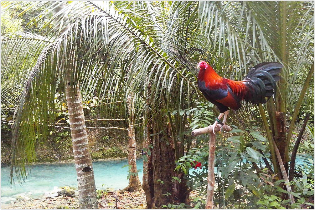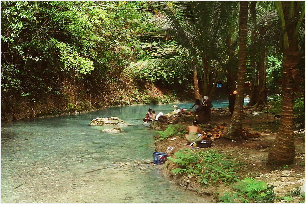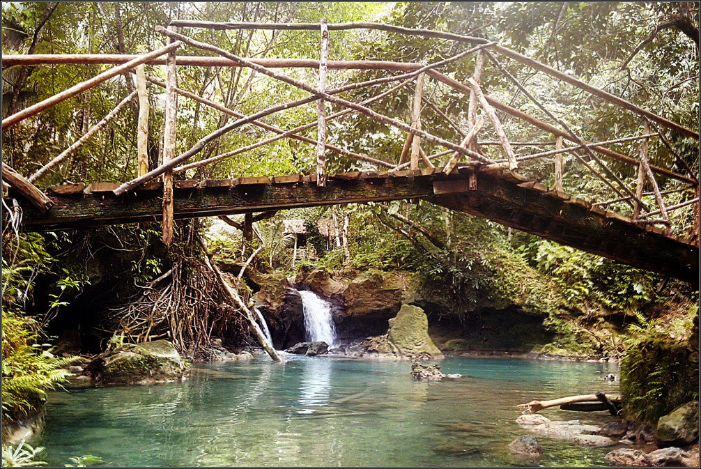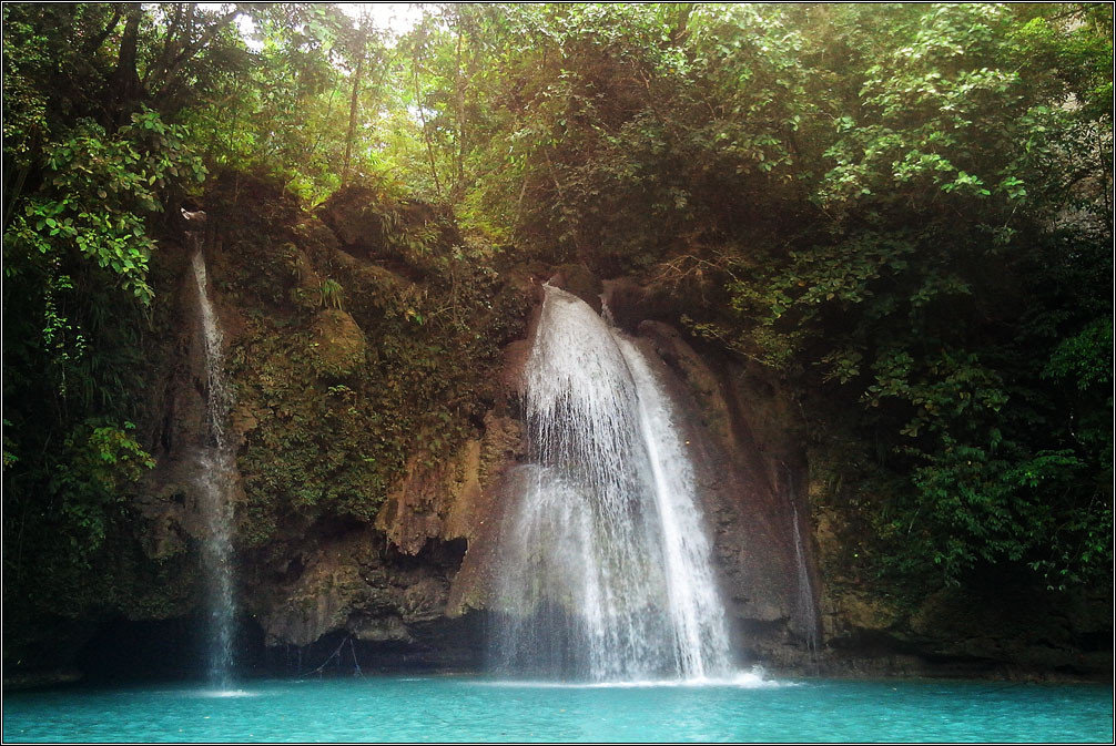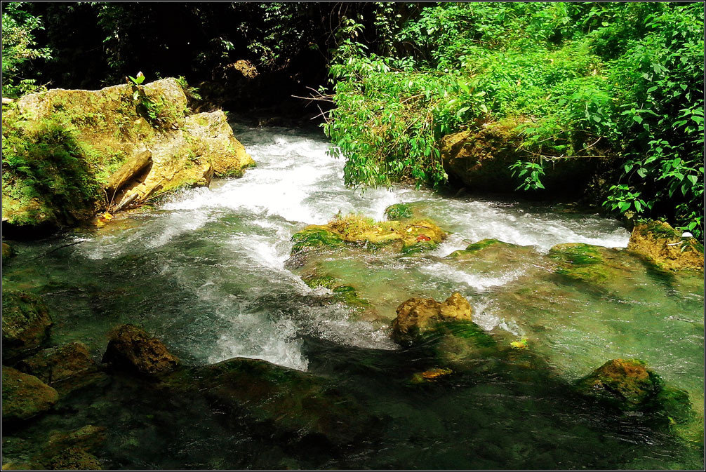 Вход на водопад платный, 50 песо ($1) стоит парковка, плюс еще по десятке с носа – за вход на территорию. Плакат обещал полтора километра пешком, что по опыту хождения к водопадам в Таиланде – довольно много. Но и тут все было не страшно: к водопаду ведет совершенно ровная широкая тропа, причем пролегает она мимо удивительно красивой горной реки. Совершенно голубая вода, прозрачная настолько, что виден каждый камешек на дне, участки с бурным течением и порогами, тихие заводи, склонившиеся пальмы, игра света и тени – полтора километра проходятся абсолютно незаметно.