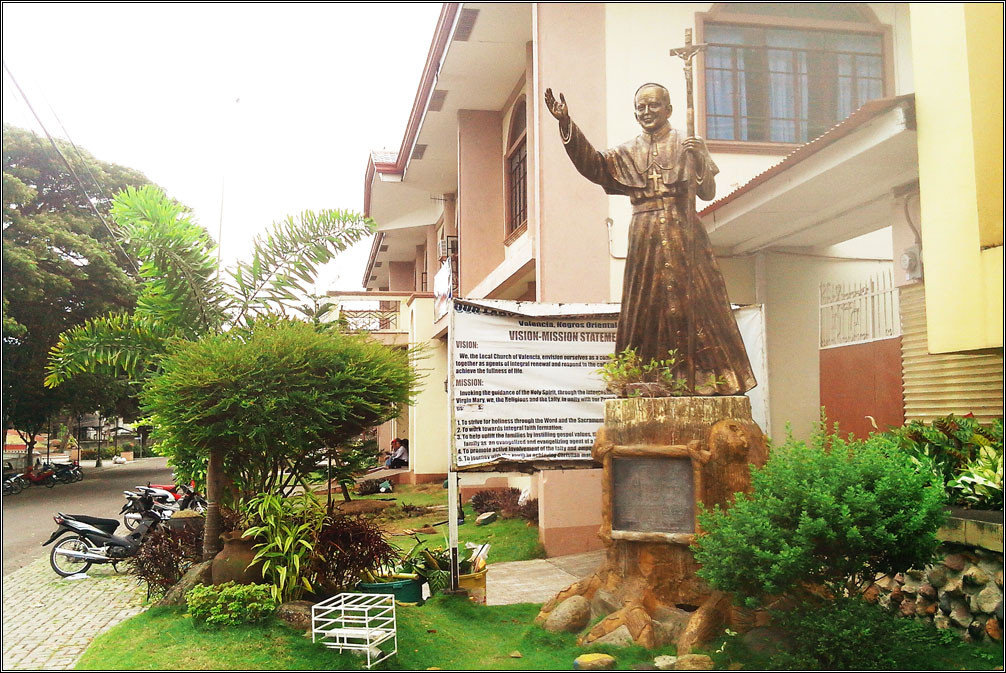 Испанское прошлое Филиппин оставило стране богатое фонетическое наследство. Вчера с утра съездили в… Валенсию – маленький городок в горах, облюбованный экспатами за прохладный климат, тишину, недорогое жилье и, при этом, малую удаленность от цивилизации. Всего восемь километров по прямой от хайвея, не успеешь как следует разогнаться, а вокруг уже маленькие улочки, быстро выводящие на почти европейской архитектуры центральную площадь, правда с забавными азиатскими купюрами. Собор, муниципалитет, школа, памятники католическим святым и неизвестным важным персонам, раскидистые деревья и относительное безлюдье.