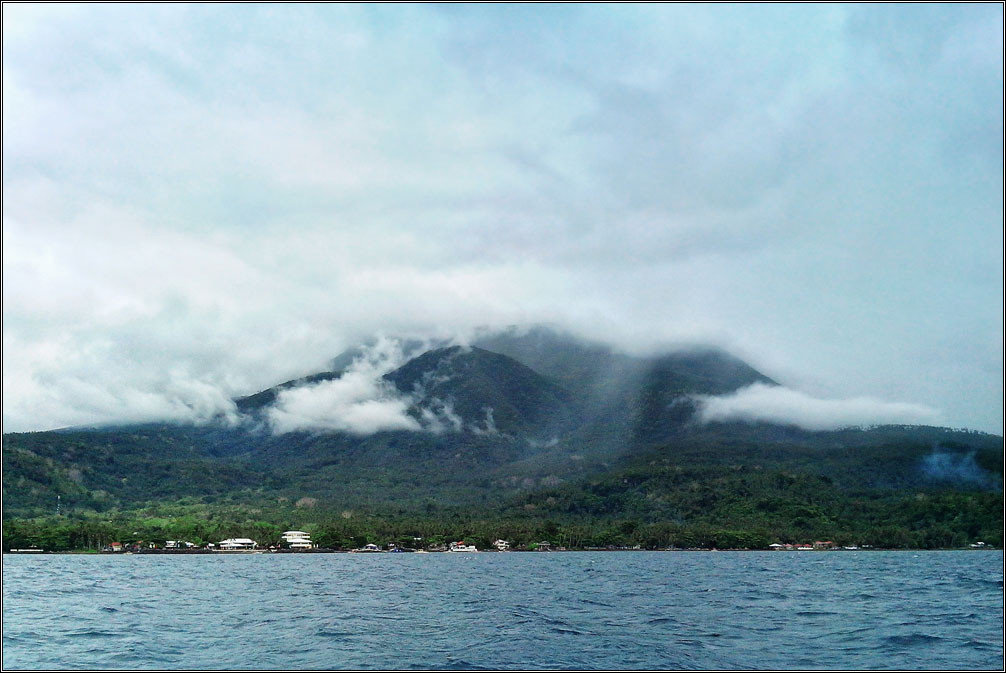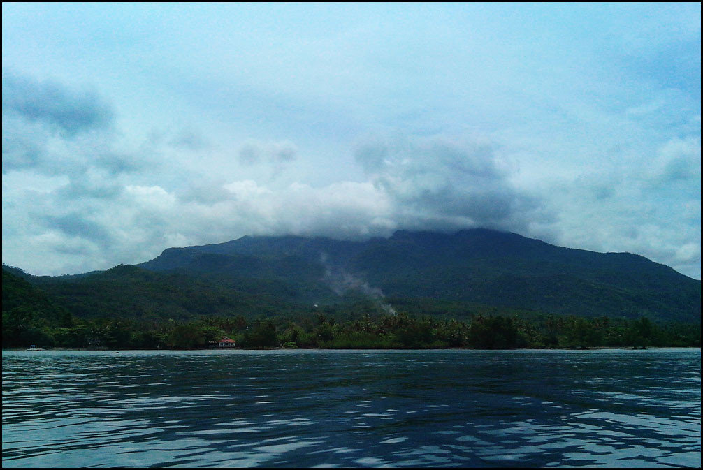 Вот и мы добрались, поплавали, попытались посноркать и посмотрели на Камигин со стороны. Рифа и рыб там нет, но море прозрачное, а вулкан Хибок-Хибок смотрится внушительно и красиво. Шапка облака, накрывающая остров, отбрасываемые клубящимися тучами тени и идущий над частью острова дождь — чтобы передать впечатление от этого зрелища, нужно что-то большее, чем фотоаппарат...