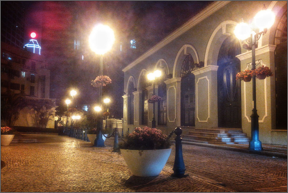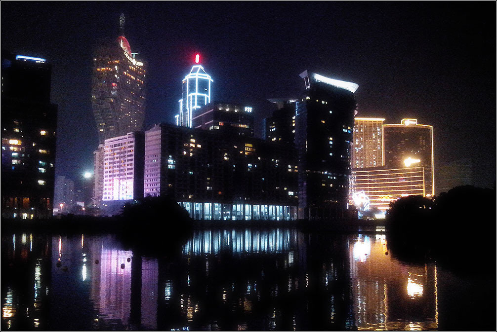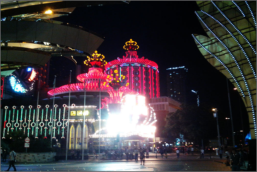 На нормальном мониторе, конечно, особенно заметно, насколько тяжело было мобильнику в ночных условиях. Но мы обязательно еще сюда заедем, вооруженные нормальной фототехникой, наделаем картинок в разное время суток, погуляем по узеньким европейским улочкам, сыграем в рулетку и покер, покатаемся на гондолах в отеле Венеция, посетим всякие развлечения и аттракционы, накупим сувениров... В этот же раз мы в Макао попали ненадолго, в темноте и практически случайно.