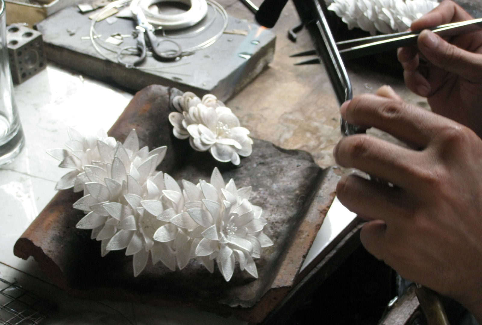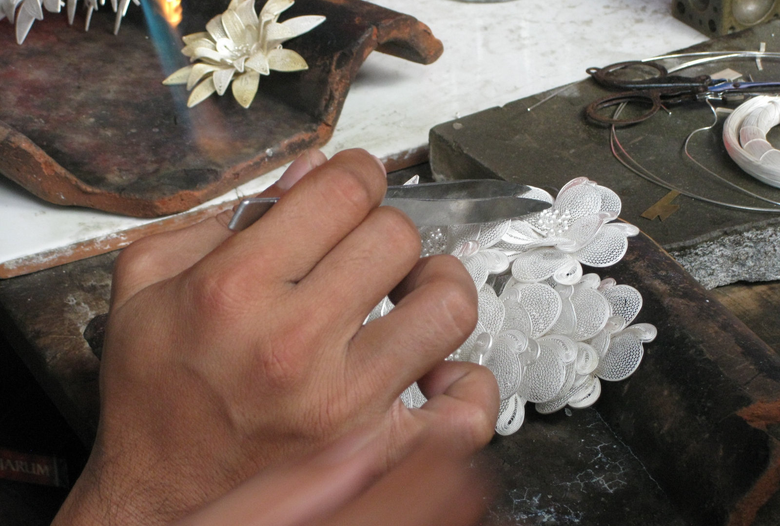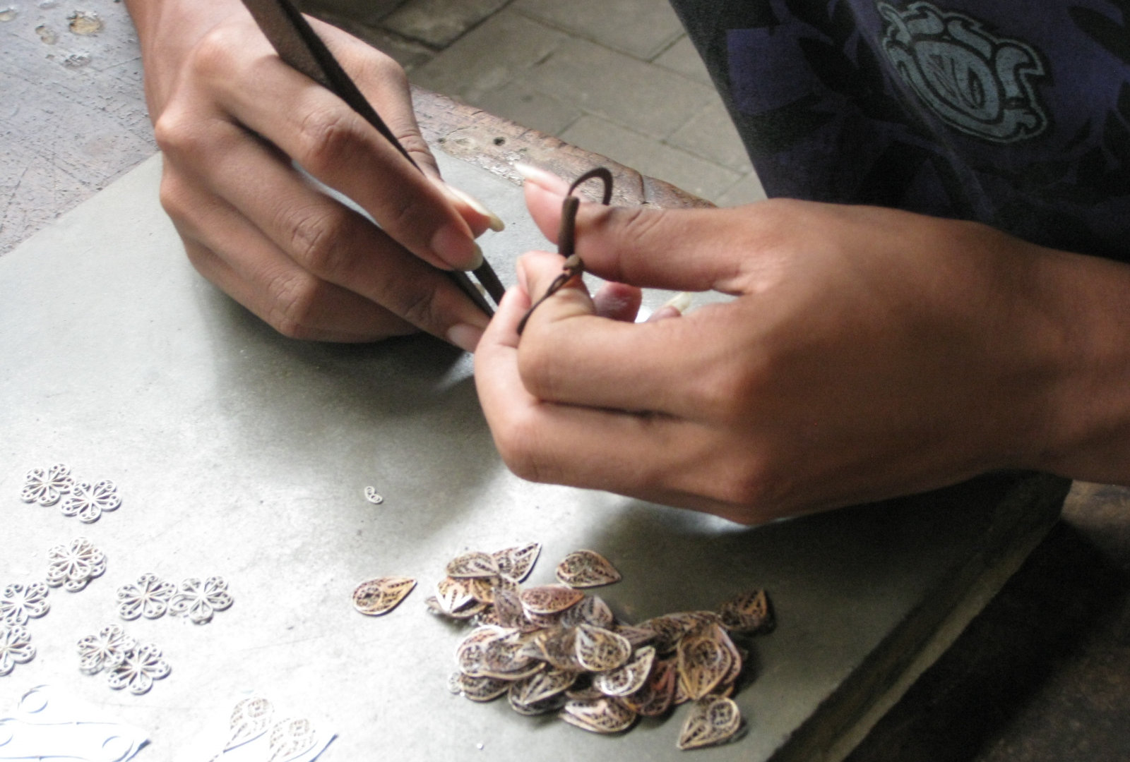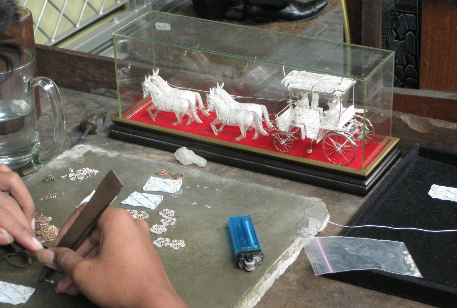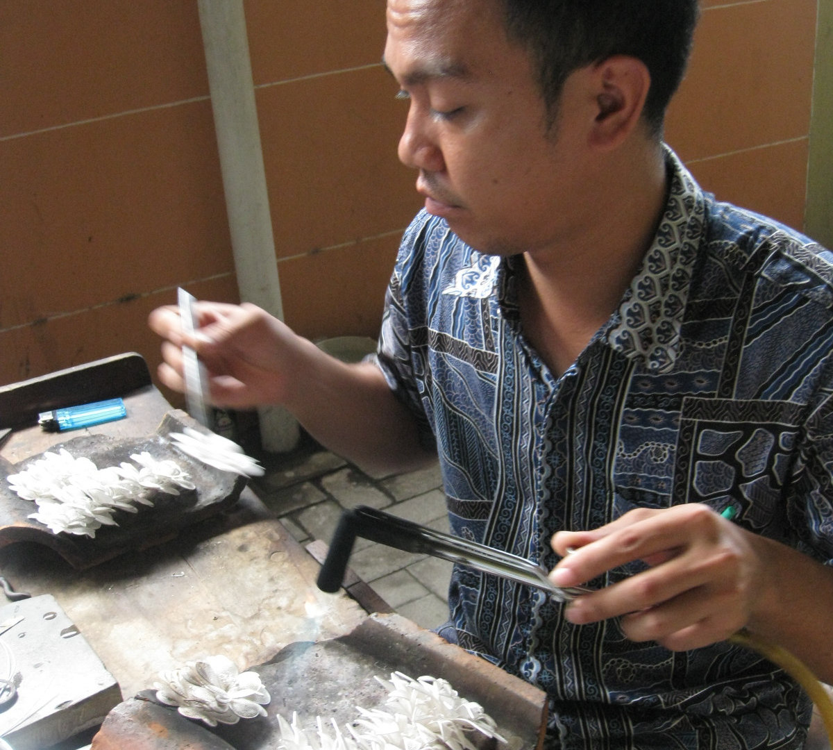 А ещё мы с Хамзой ездили на небольшую фабрику, где делают серебряные украшения. На Бали тоже есть такие, но мне хотелось увидеть умельцев с Явы и их работы. А работа эта тончайшая. Не помню всю технологию создания украшений- мне было важно не запомнить её, а посмотреть, что и как. Удивляет то, что на таких фабриках всё устроено очень просто, даже примитивно: никаких увеличительных стёкол, белых халатов и стерильности. Но, тем не менее, результат творчества всегда впечатляет!