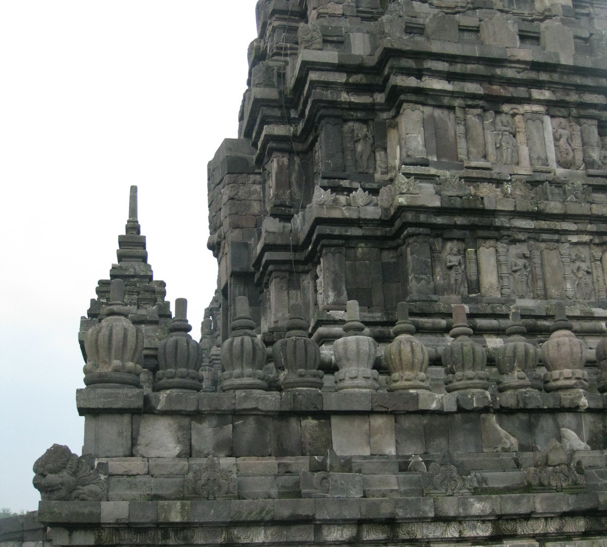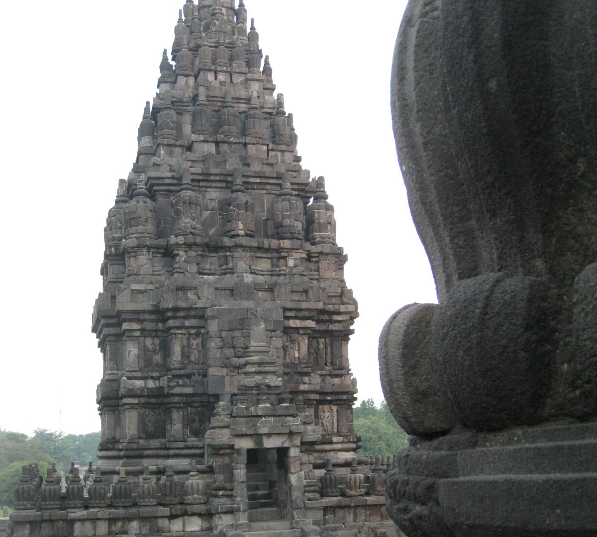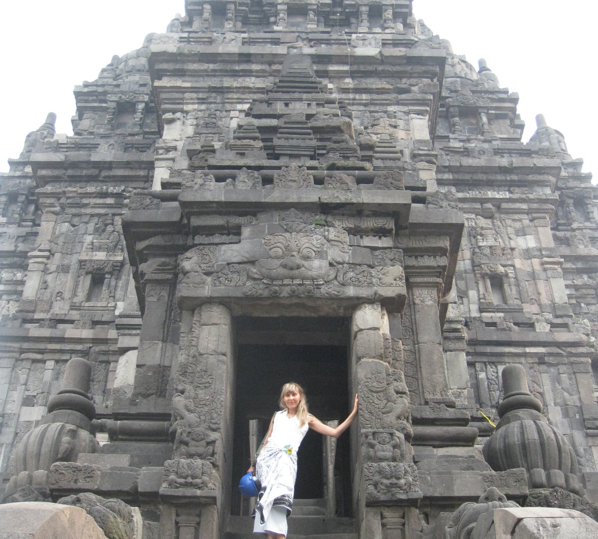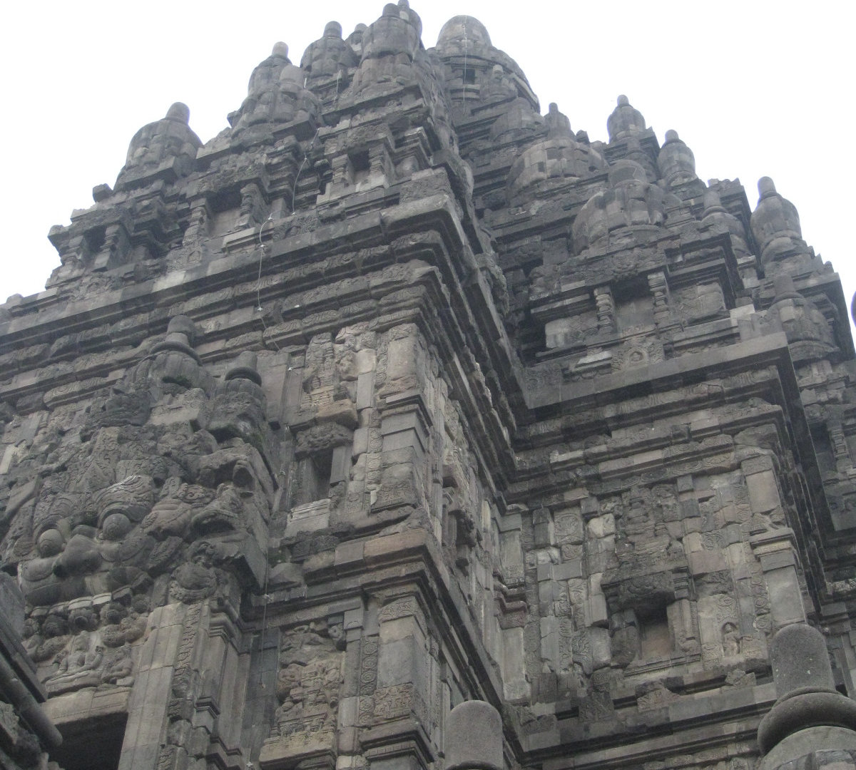 Издалека комплекс мне напомнил постройки из мокрого песка. Когда сидишь на берегу и строишь замки: мокрый песок, который ты зачерпнул, капает из кулака, и каждая капля застывает очередной ступенькой на пирамиде будущего замка. А ещё Прамбанан издалека похож на гигантский термитник. Храмы Прамбанана очень изящные, несмотря на свою огромную величину и все в резных барельефах.