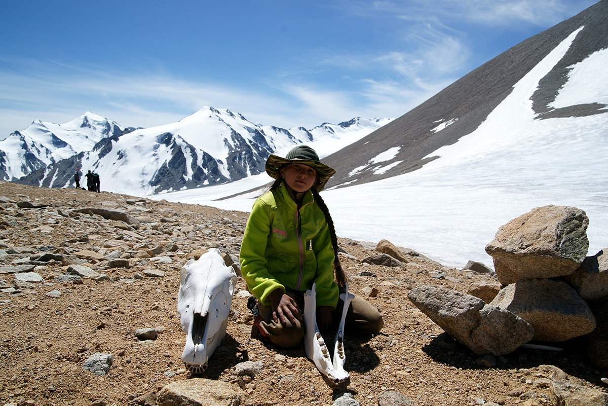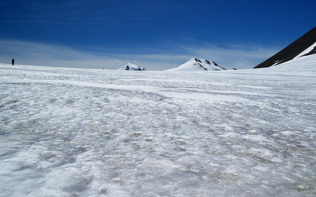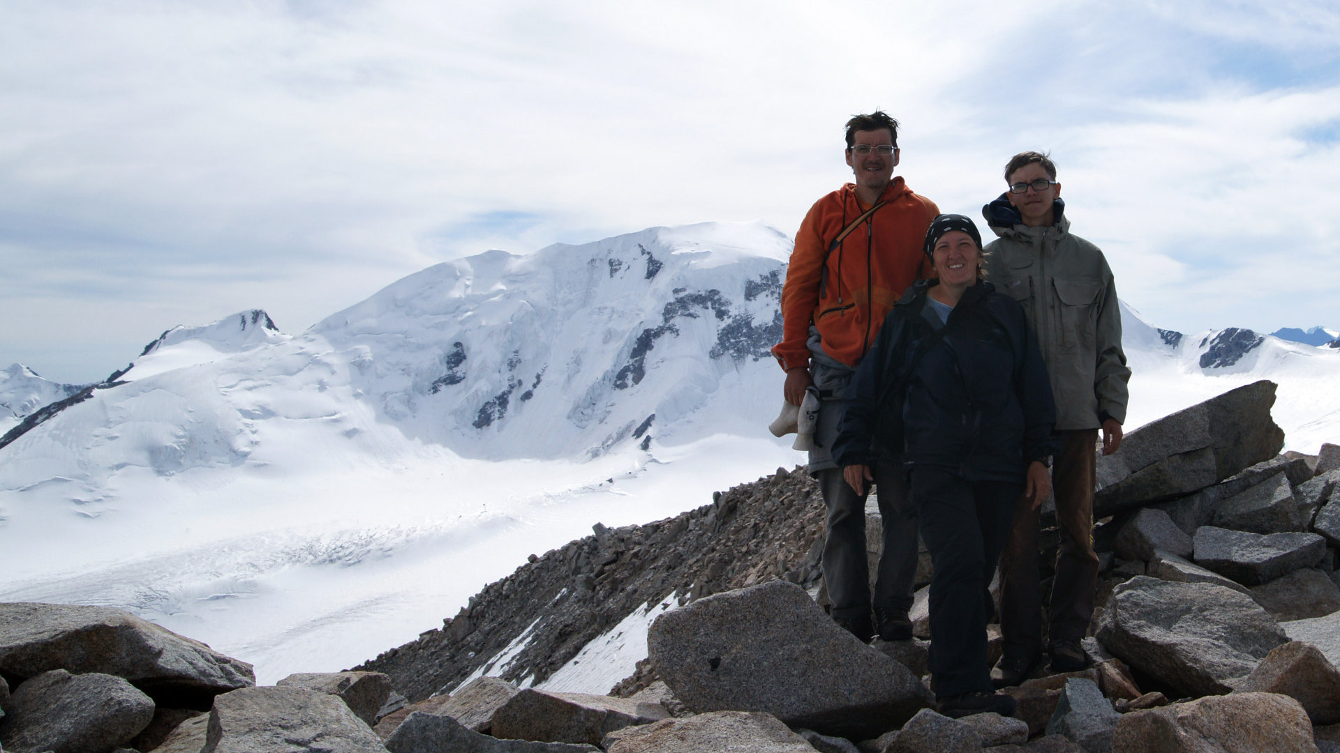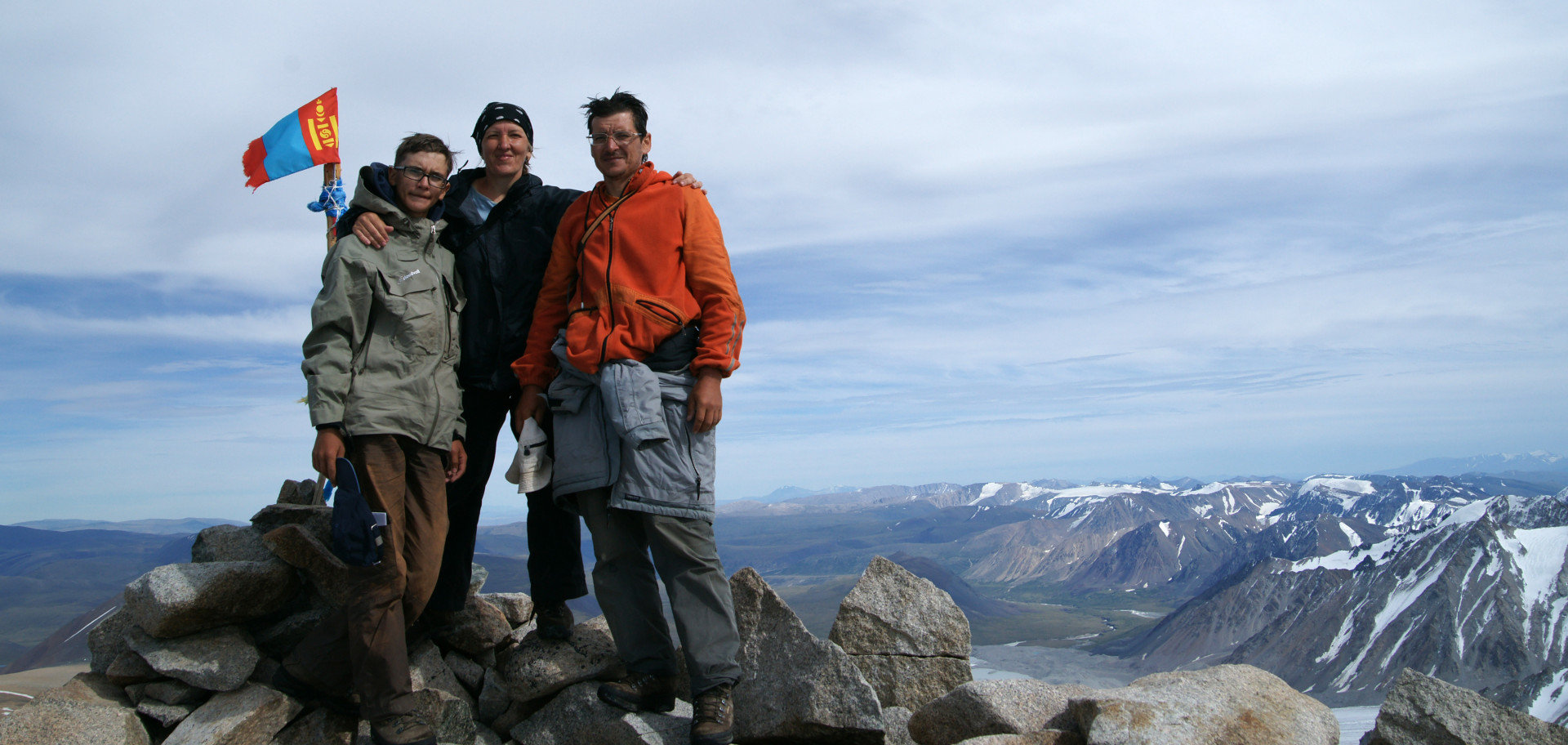 Но природное упорство заставляет идти вверх. И вот я на вершине!!! Мы покорили четыре тысячи! Постепенно силы возвращаются, и я начинаю осматриваться. Рука невольно тянется к фотоаппарату – какая красота! Ледник Потанина сливается с Александрой! Вот он священный массив Табын-Богдо-Ола! Восторг переполняет меня. Ветер сдувает с лица последнюю усталость.