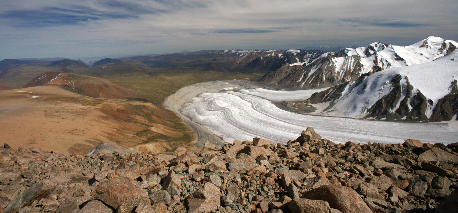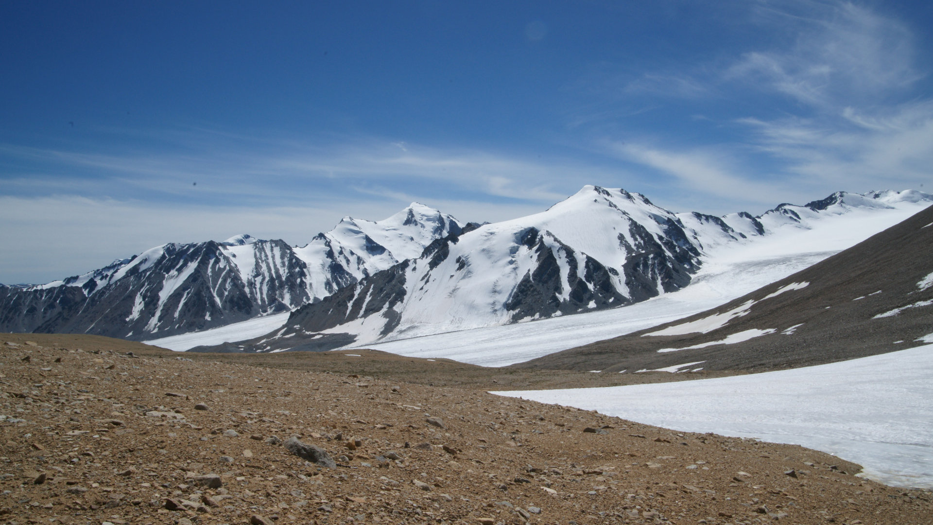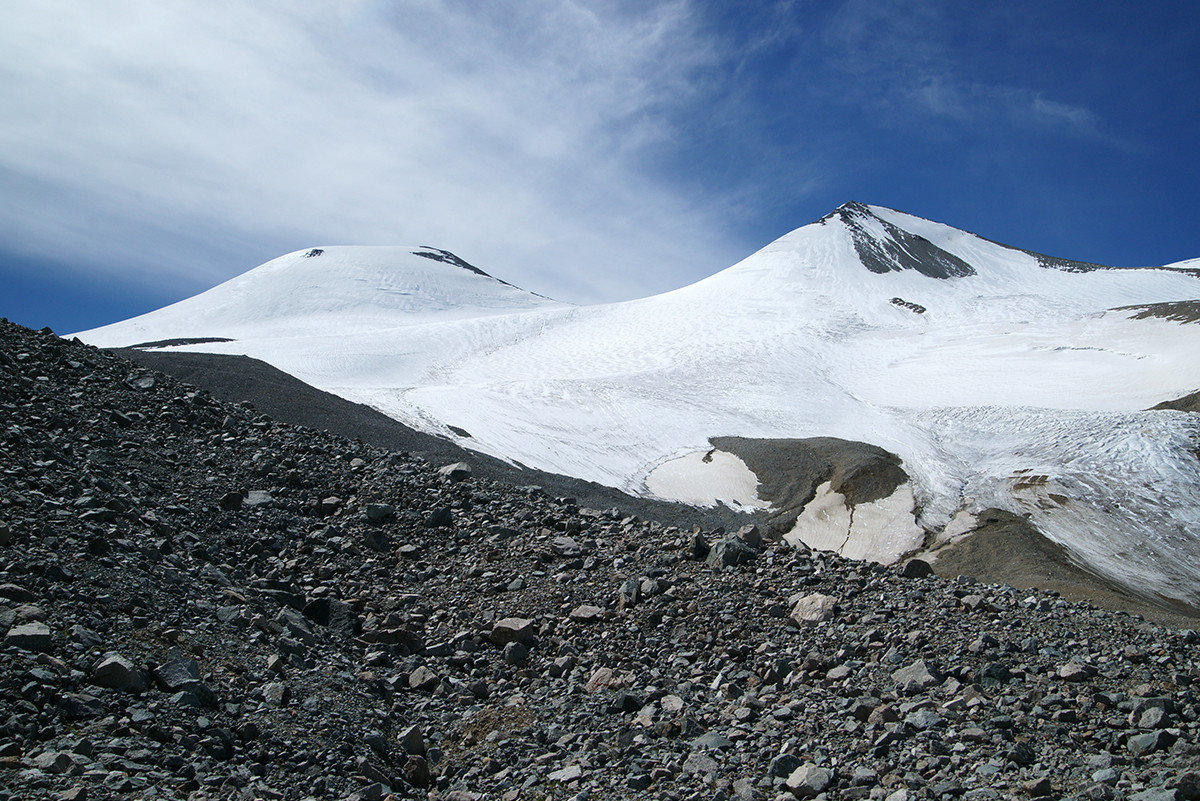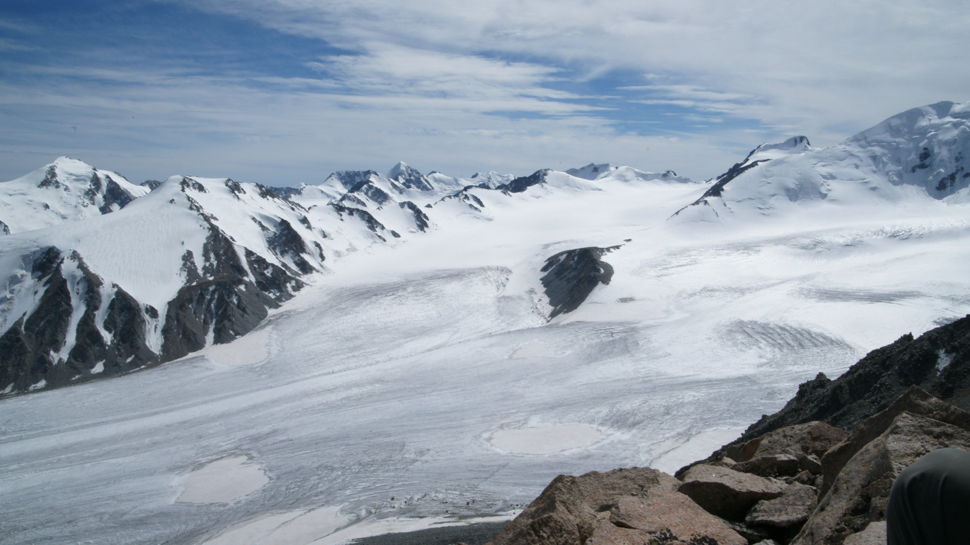 Но природное упорство заставляет идти вверх. И вот я на вершине!!! Мы покорили четыре тысячи! Постепенно силы возвращаются, и я начинаю осматриваться. Рука невольно тянется к фотоаппарату – какая красота! Ледник Потанина сливается с Александрой! Вот он священный массив Табын-Богдо-Ола! Восторг переполняет меня. Ветер сдувает с лица последнюю усталость.