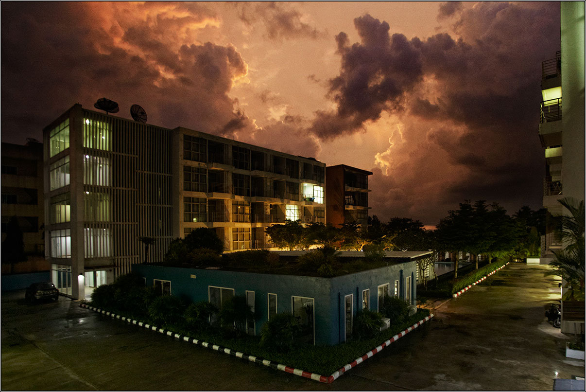 Минуты 2-3 он вообще ни на что не реагирует. В первый раз я вообще думал, что он сломался, а сейчас прикалываюсь, что он ламповый — пока не нагреется, ничего не будет.Заехал смазать цепь — на мотоциклах это рекомендуется делать каждые 500 км пробега. Там какому-то нашему туристу камеру в заднем колесе меняли. Сначала он удивился, что я по-русски говорю, а потом у нас и общие знакомые нашлись. Что неудивительно.Проезжали мимо какой-то симпатичной кафешки, решили заглянуть. Это оказался прокат квадроциклов, и мы, кажется, были первыми, кто заехал к ним просто кофе попить. Нет, столики там стоят, меню на доске висит, но вокруг кофеварки тайцы собрались всем наличным персоналом, выясняя, какую кнопку давить, чтобы эта шайтан-машина таки заработала.А на фотках сегодня — вечерний отлив на Клонг-Муанге. И дождь где-то там, у горизонта.